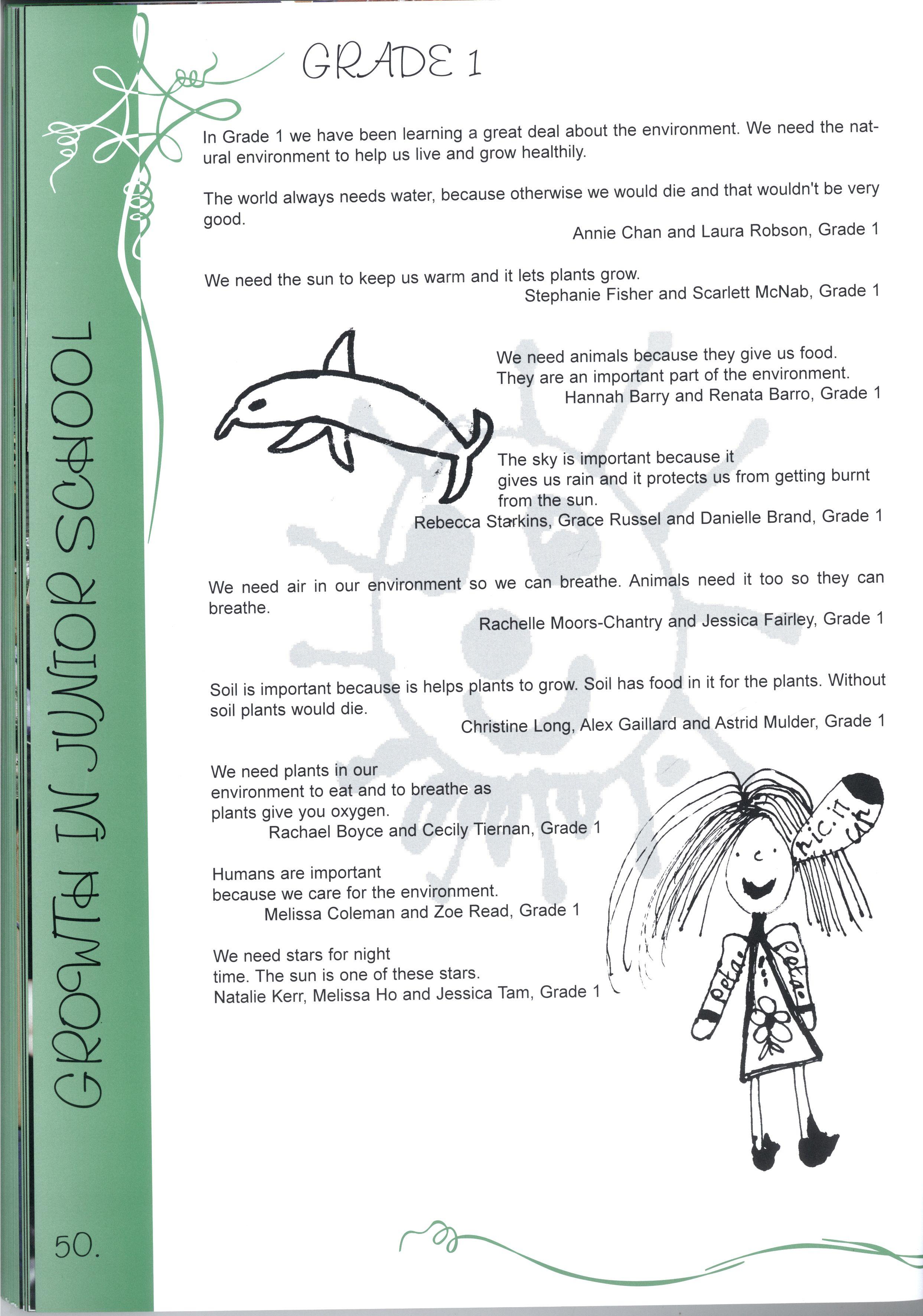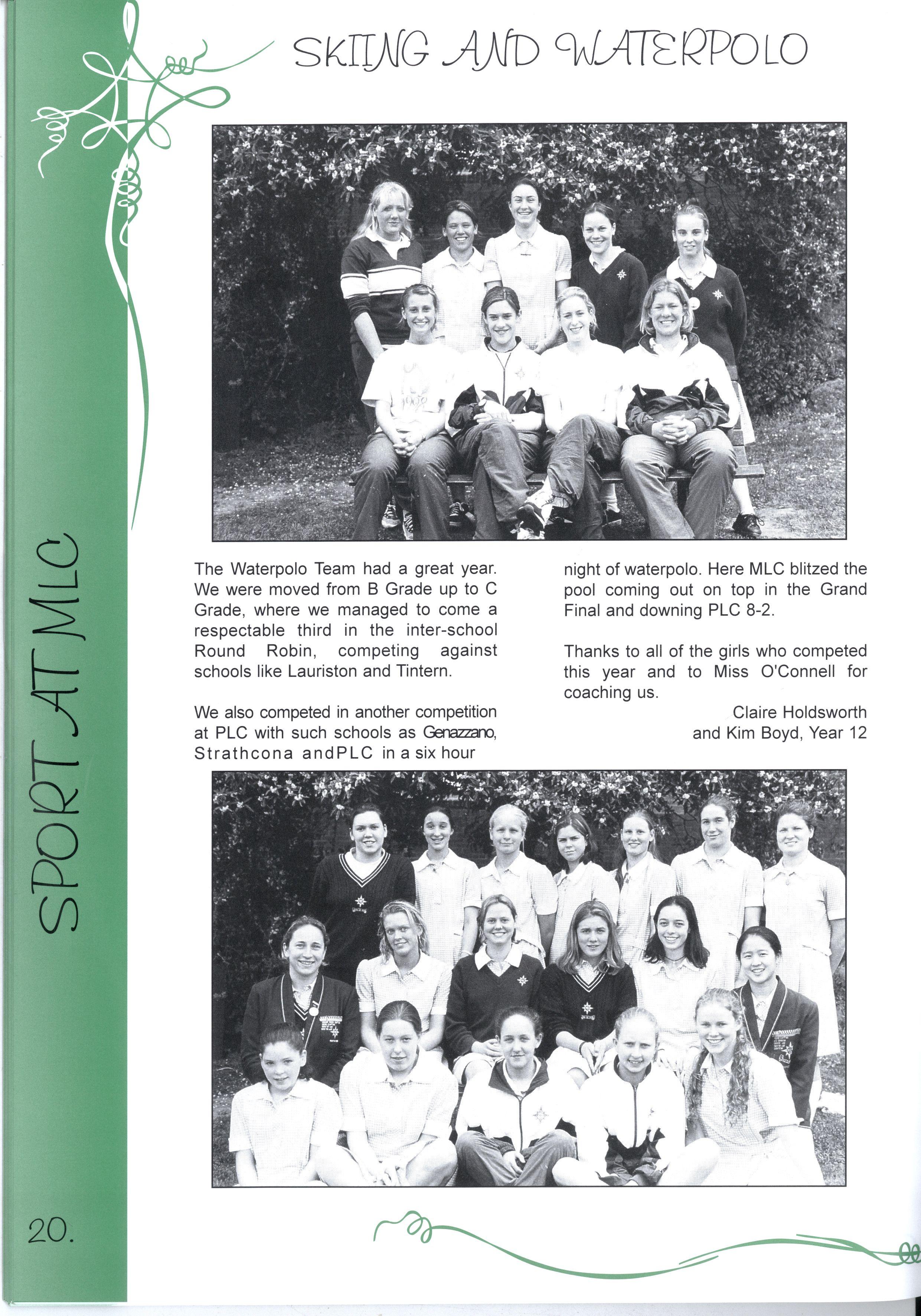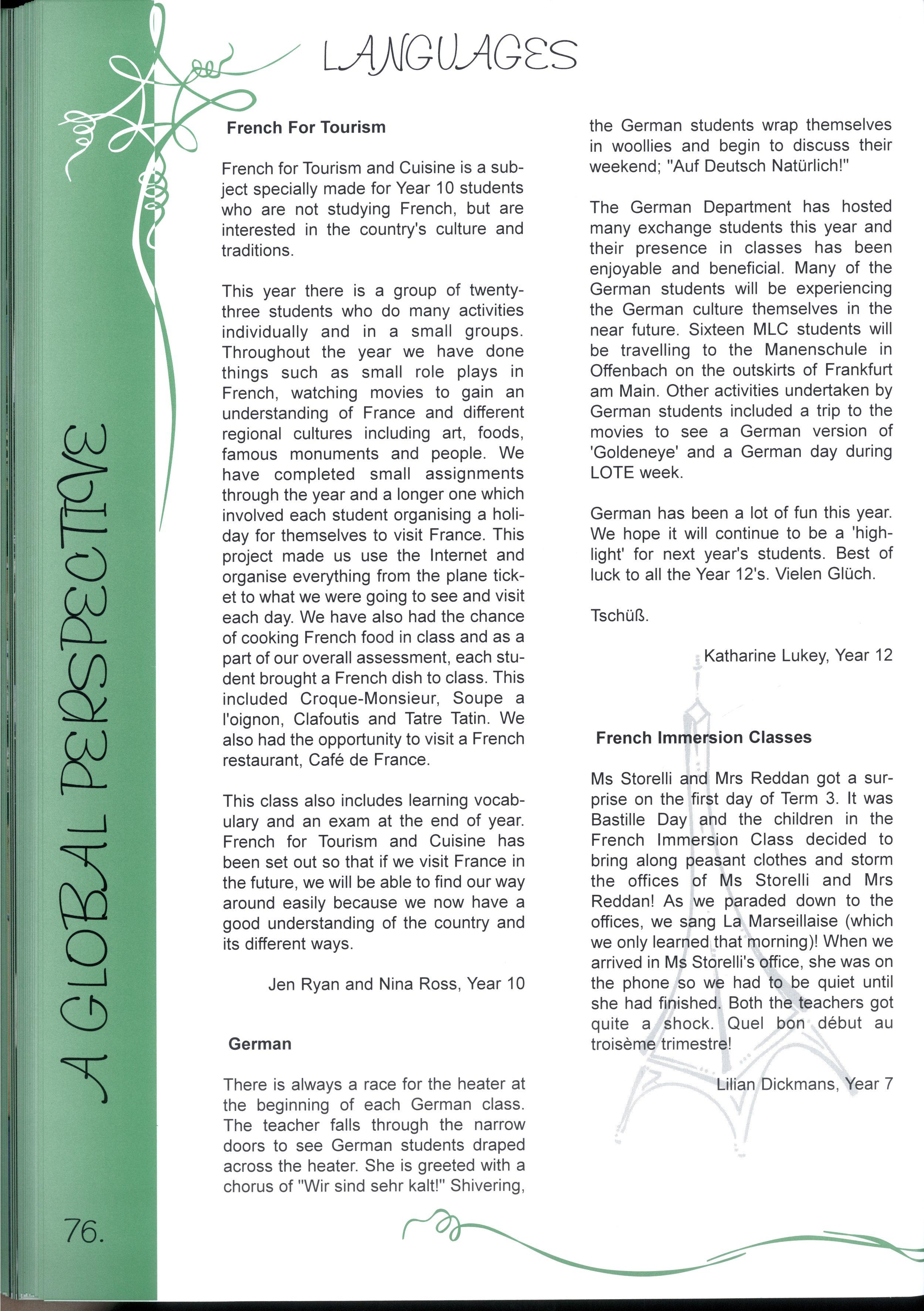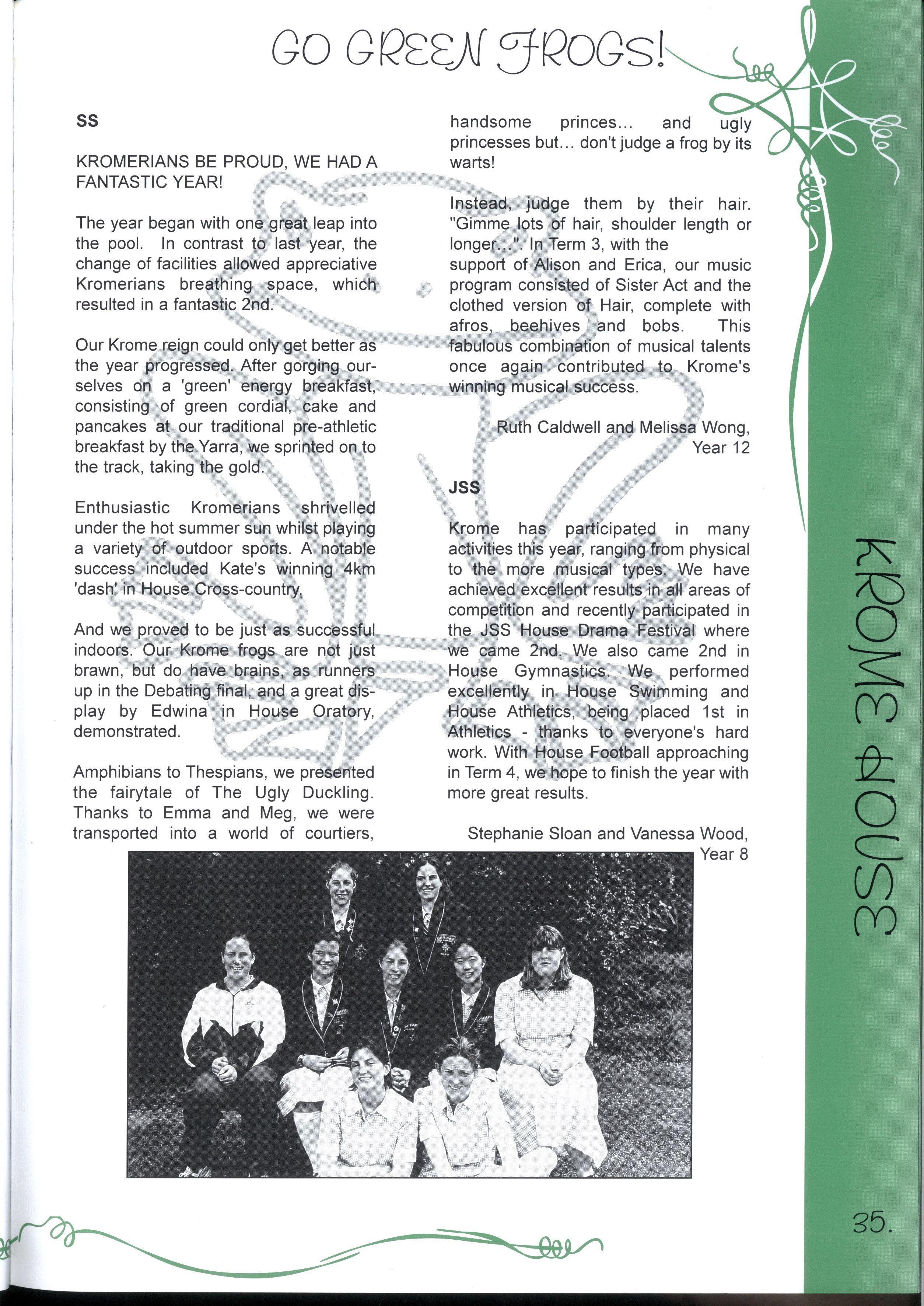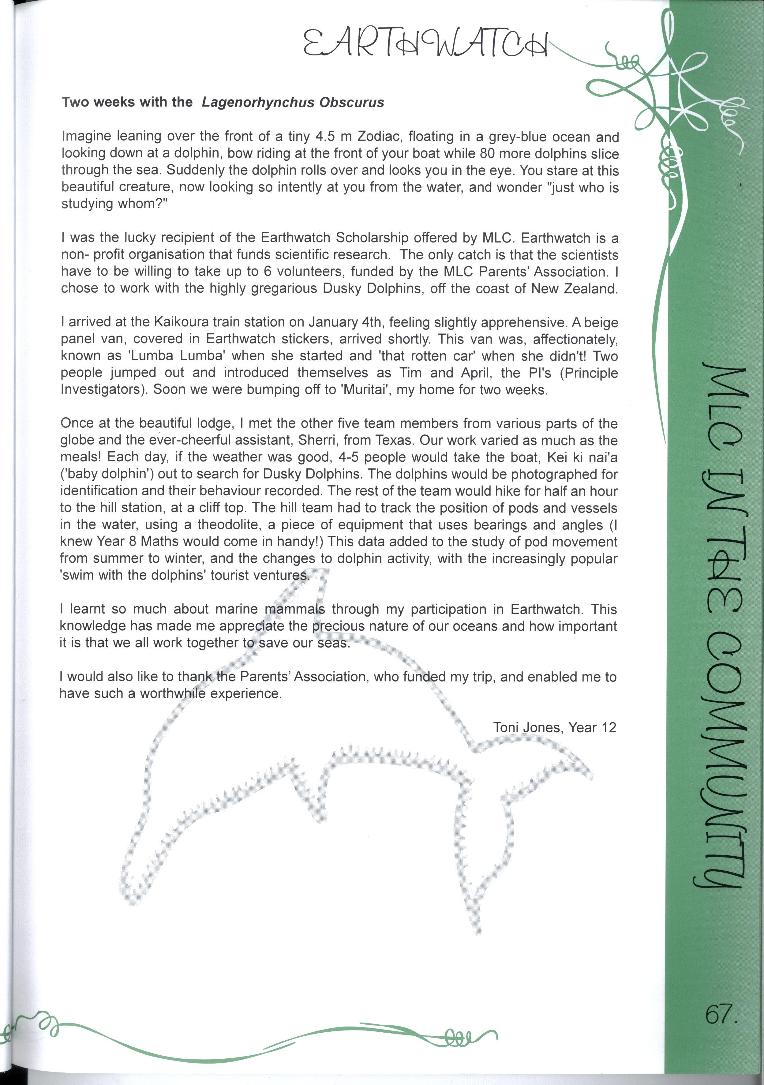 The Editorial Team has worked extremely hard to successfully complete this project We are particularly grateful to the Layout Team who gave up the first week of their September holidays, while Jenny and Nadia did a wonderful job with all the photography The Maintenance Team was, as usual, a great help in organising important things like ladders! Our committee of Olivia Heaton, Eliza Lockhart, Thaya Kotoridis, Sally Stead, Sophie Breheny (Grade 3), Gillian Phillips, Lauren Donozzan (Grade 4), Fiona Doig, Michell Li, Alex Murphy (Grade 5), Sophia Tsiligiannis, Whitney Campbell and Sarah Robson (Grade 6), supported by Mrs Harrison and Miss Robinson were invaluable representatives from Junior School Thank you to our JSS reporters, Yvonne Chow, Laura DAIessandri and Sarah Wongaleeshote, and our MS reporters, Hilary Peterson and Henrietta Jones, who did a brilliant job on their 'assignments.'