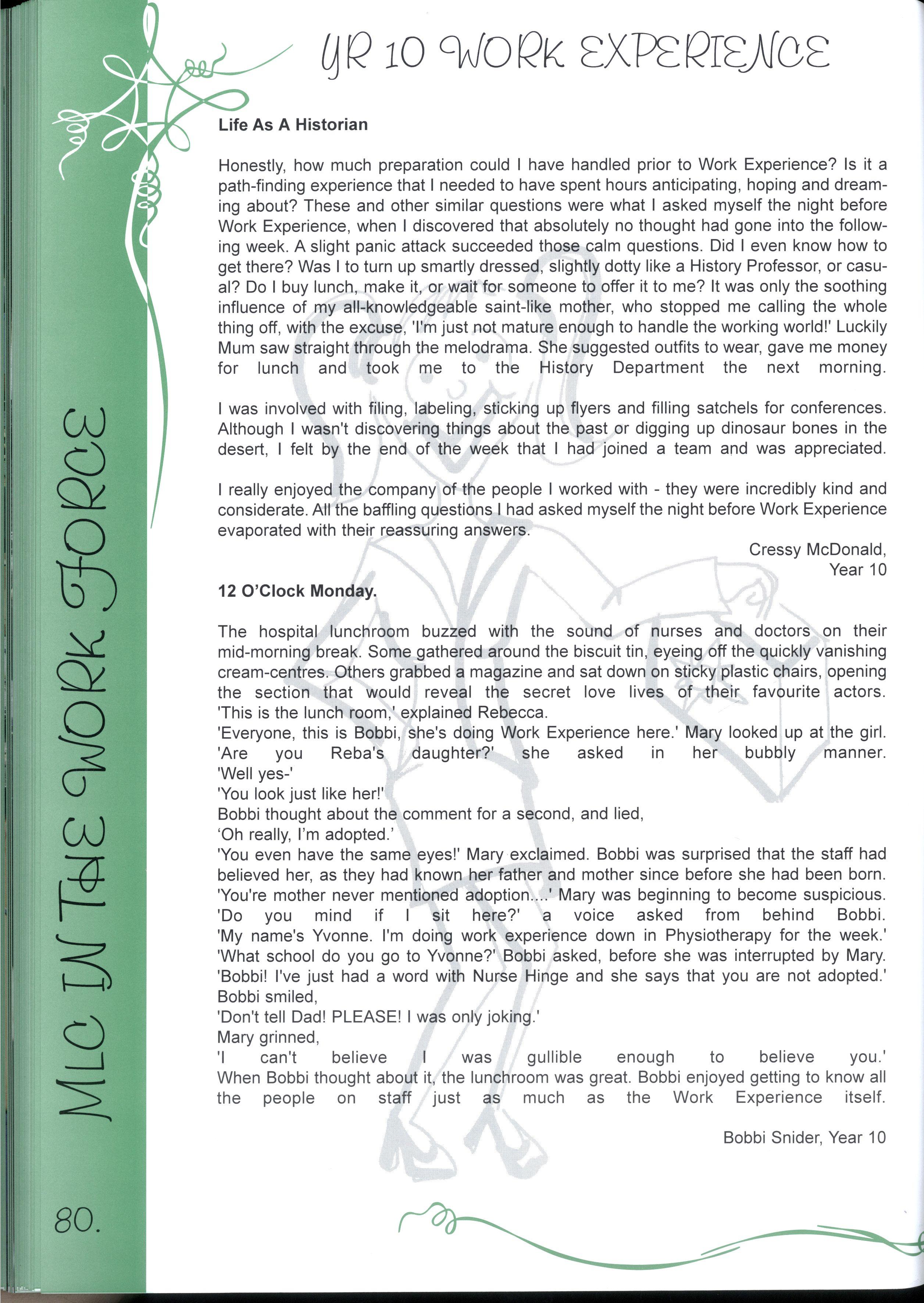 Honestly, how much preparation could I have handled prior to Work Experience? Is it a path-finding experience that I needed to have spent hours anticipating, hoping and dreaming about? These and other similar questions were what I asked myself the night before Work Experience, when I discovered that absolutely no thought had gone into the following week A slight panic attack succeeded those calm questions Did I even know how to get there? Was I to turn up smartly dressed, slightly dotty like a History Professor, or casual? Do I buy lunch, make it, or wait for someone to offer it to me? It was only the soothing influence of my all-knowledgeable saint-like mother, who stopped me calling the whole thing off, with the excuse, 'I'm just not mature enough to handle the working world!' Luckily Mum saw straight through the melodrama She suggested outfits to wear, gave me money for lunch and took me to the History Department the next morning.
