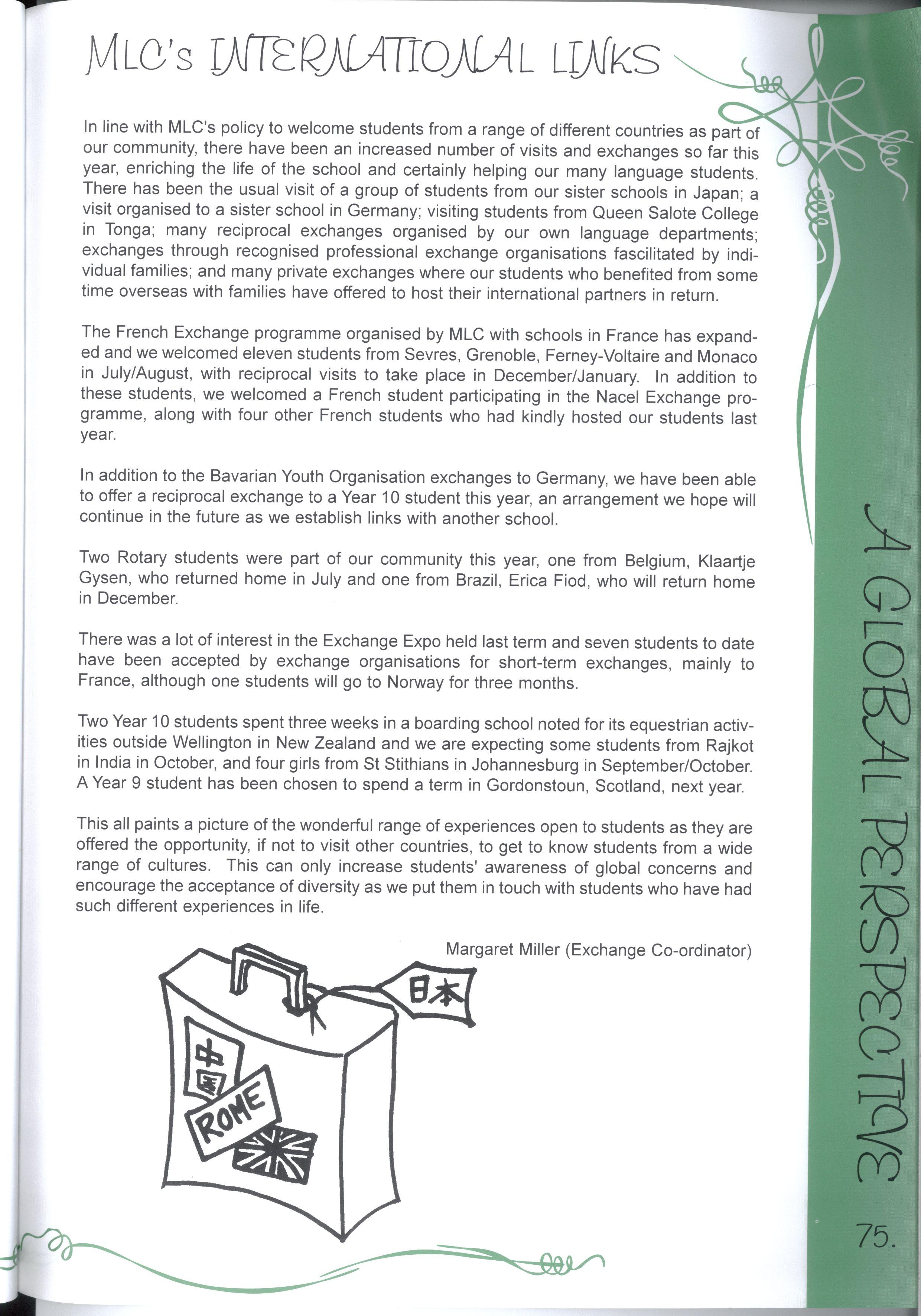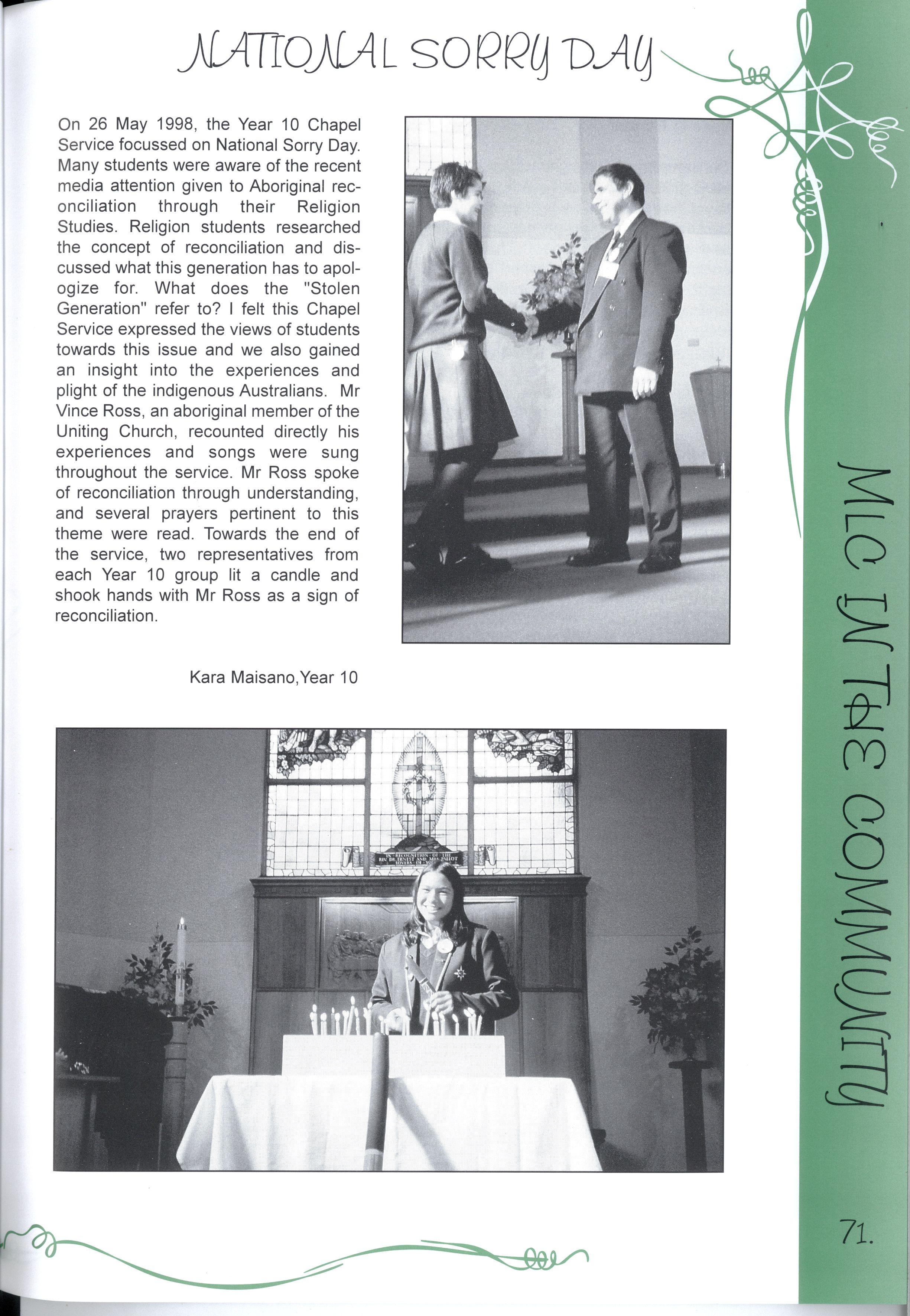 Ms Storelli claims that while students and staff give of their time, "it is also important to understand that they learn an enormous amount from the experiences." The Middle School Contribution to the Community Program, MYLE tutoring, and the visit from Tongan students, exemplify the kinds of extensive service MLC has made this year Ms Storelli believes that "young people are much more politically aware than we give them credit for." She sees the issues of Aboriginal reconciliation, multiculturalism, the republic debate, and equity of opportunities for young people as paramount to the growth of future Australia.
