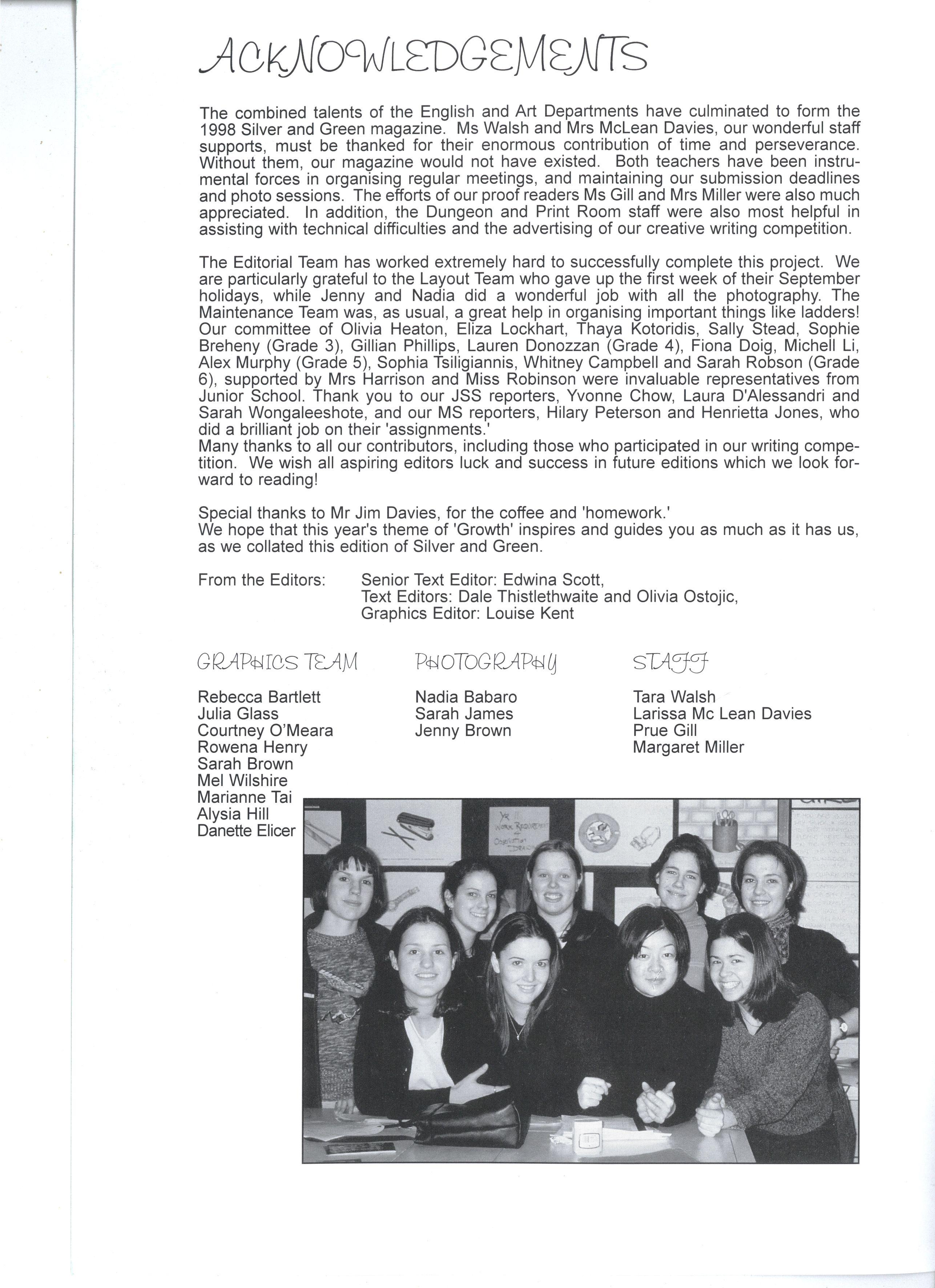 The combined talents of the English and Art Departments have culminated to form the 1998 Silver and Green magazine Ms Walsh and Mrs McLean Davies, our wonderful staff supports, must be thanked for their enormous contribution of time and perseverance Without them, our magazine would not have existed Both teachers have been instrumental forces in organising regular meetings, and maintaining our submission deadlines and photo sessions The efforts of our proof readers Ms Gill and Mrs Miller were also much appreciated In addition, the Dungeon and Print Room staff were also most helpful in assisting with technical difficulties and the advertising of our creative writing competition
