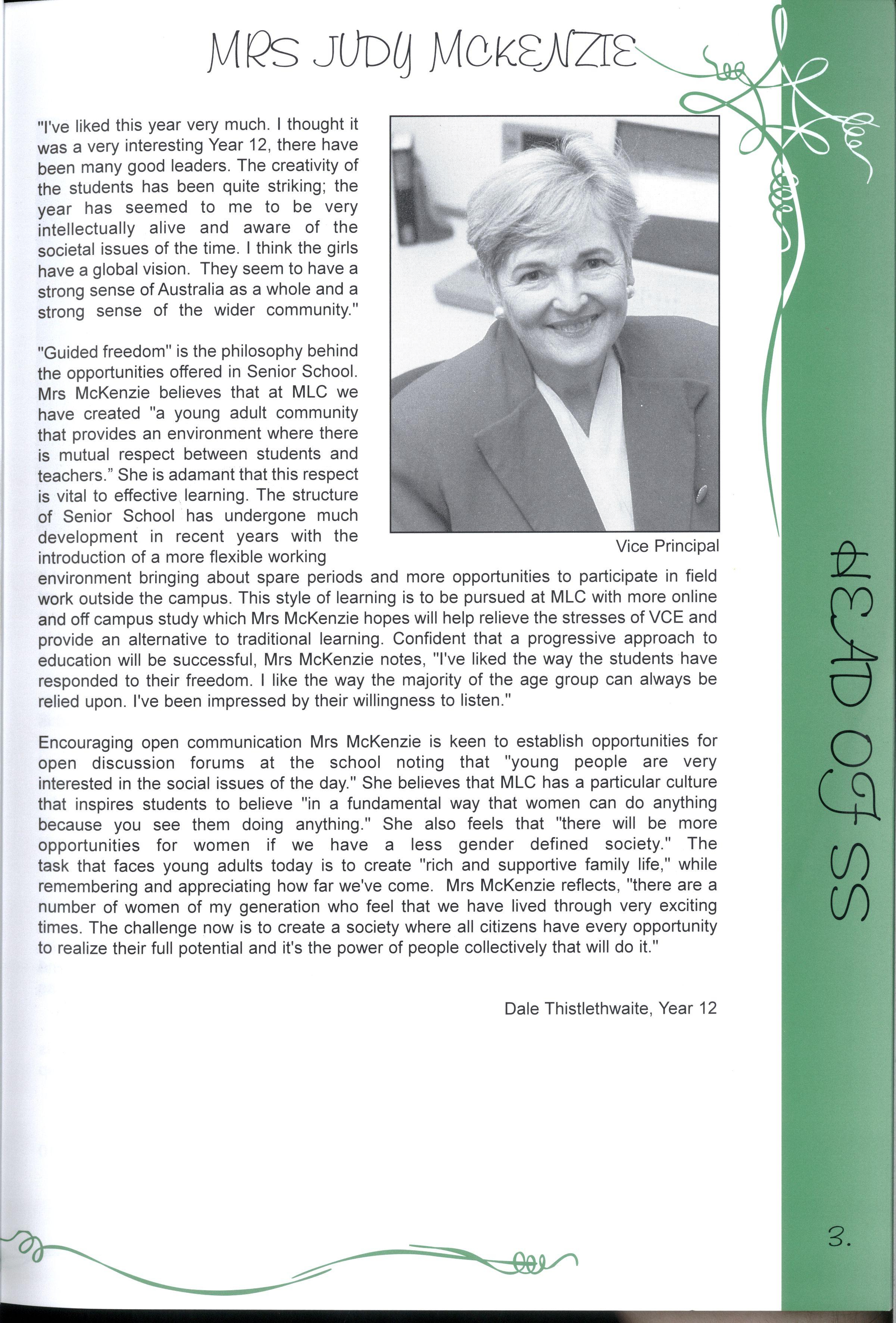 "Guided freedom" is the philosophy behind the opportunities offered in Senior School Mrs McKenzie believes that at MLC we have created "a young adult community that provides an environment where there is mutual respect between students and teachers." She is adamant that this respect is vital to effective learning The structure of Senior School has undergone much development in recent years with the introduction of a more flexible working environment bringing about spare periods and more opportunities to participate in field work outside the campus. This style of learning is to be pursued at MLC with more online and off campus study which Mrs McKenzie hopes will help relieve the stresses of VCE and provide an alternative to traditional learning Confident that a progressive approach to education will be successful, Mrs McKenzie notes, "I've liked the way the students have responded to their freedom I like the way the majority of the age group can always be relied upon I've been impressed by their willingness to listen."