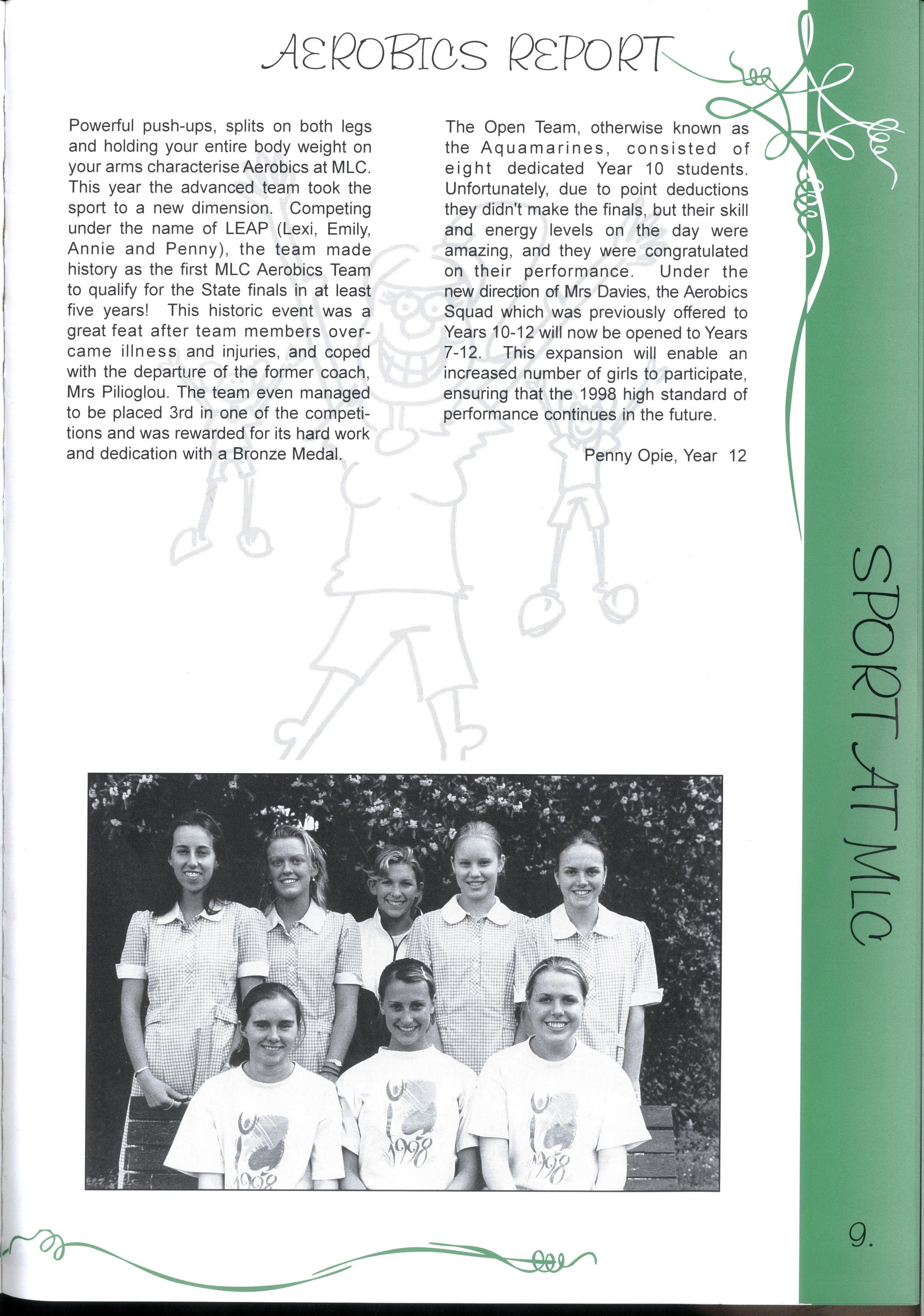 The Open Team, otherwise known as the Aquamarines, consisted of eight dedicated Year 10 students. Unfortunately, due to point deductions they didn't make the finals, but their skill and energy levels on the day were amazing, and they were congratulated on their performance Under the new direction of Mrs Davies, the Aerobics Squad which was previously offered to Years 10-12 will now be opened to Years 7-12 This expansion will enable an increased number of girls to participate, ensuring that the 1998 high standard of performance continues in the future