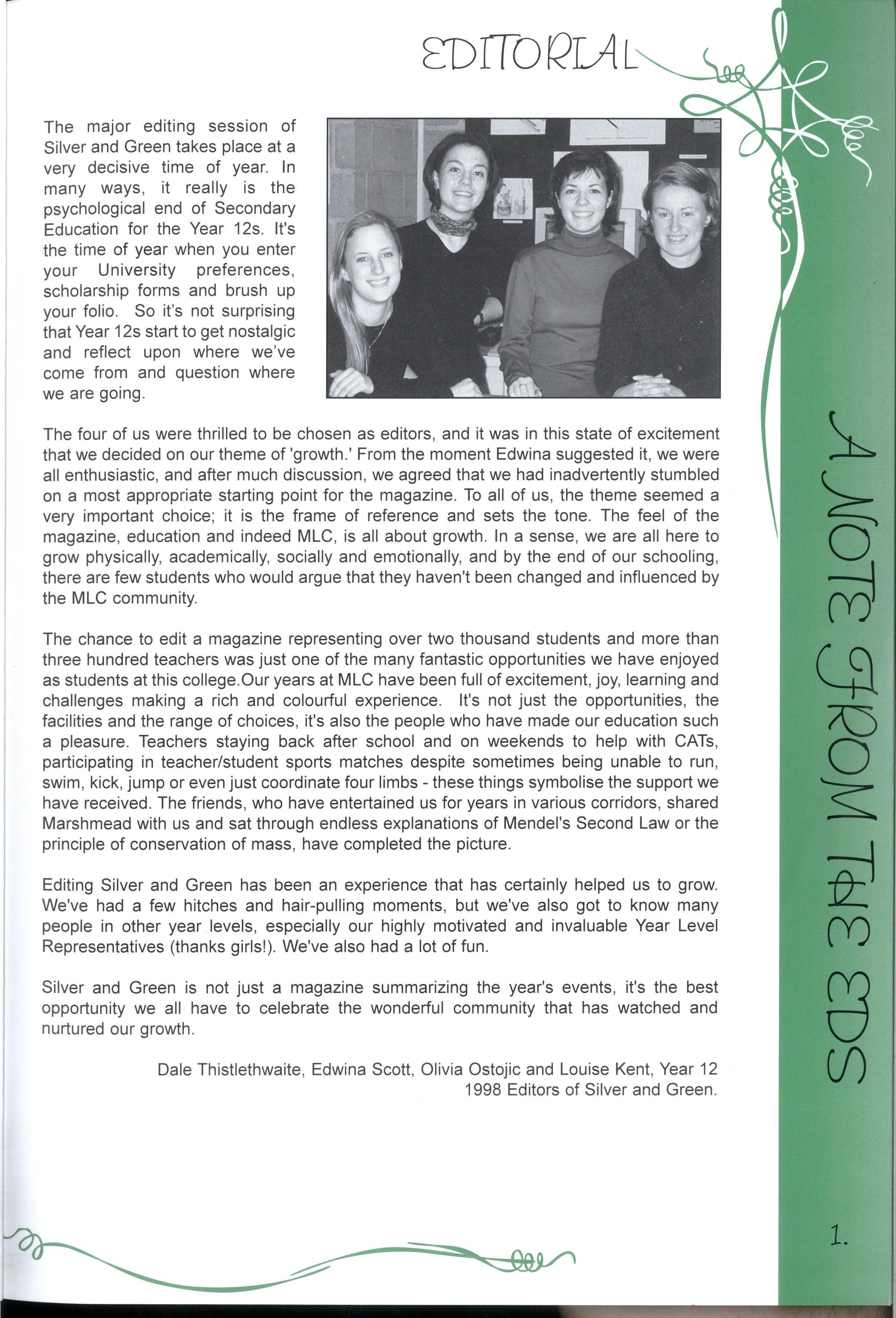 Thistlethwaite, Edwina Scott, Olivia Ostojic and Louise Kent, Year 12 1998 Editors of Silver and Green