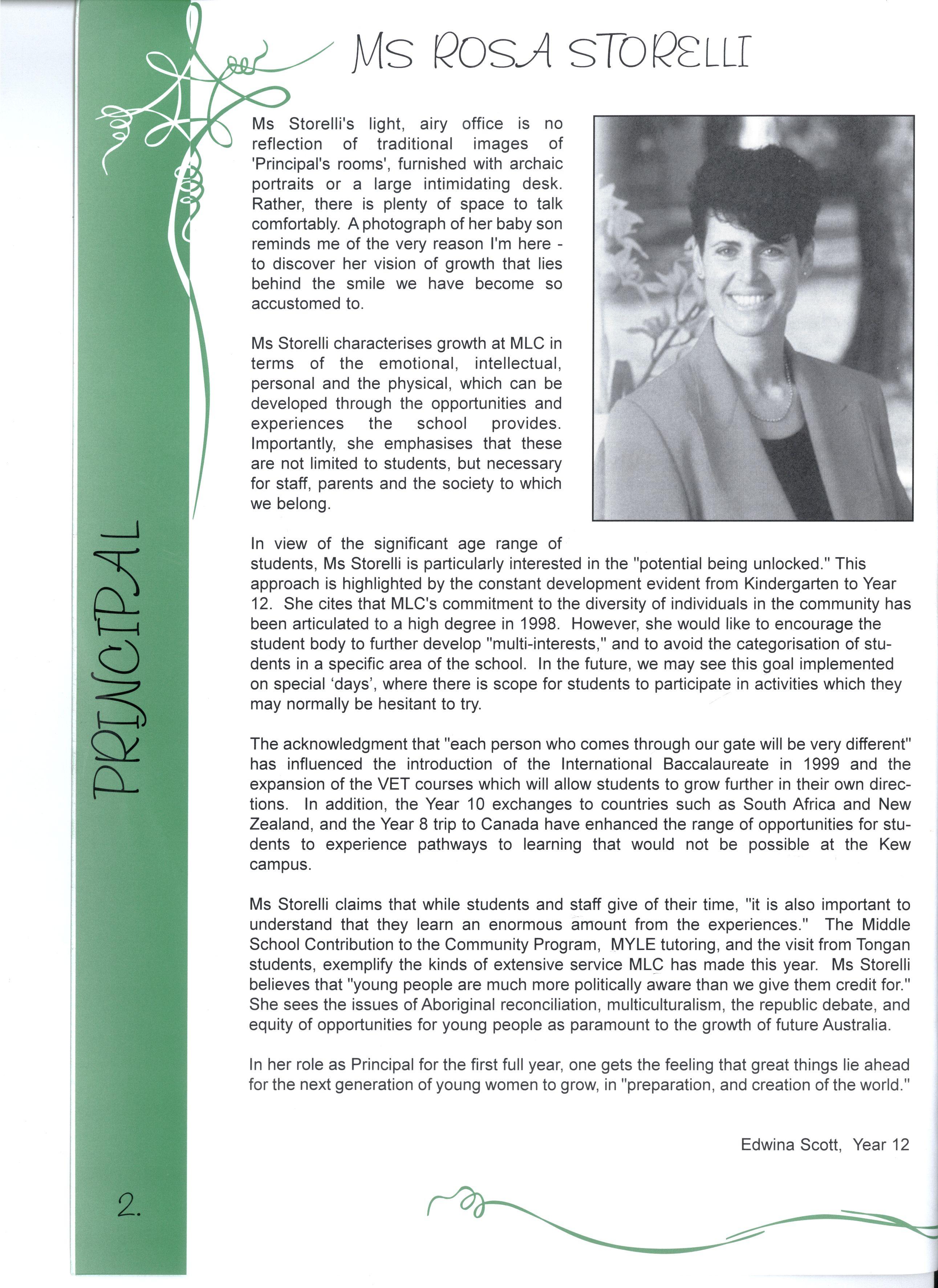 In view of the significant age range of students, Ms Storelli is particularly interested in the "potential being unlocked." This approach is highlighted by the constant development evident from Kindergarten to Year 12 She cites that MLC's commitment to the diversity of individuals in the community has been articulated to a high degree in 1998 However, she would like to encourage the student body to further develop "multi-interests," and to avoid the categorisation of students in a specific area of the school In the future, we may see this goal implemented on special 'days', where there is scope for students to participate in activities which they may normally be hesitant to try