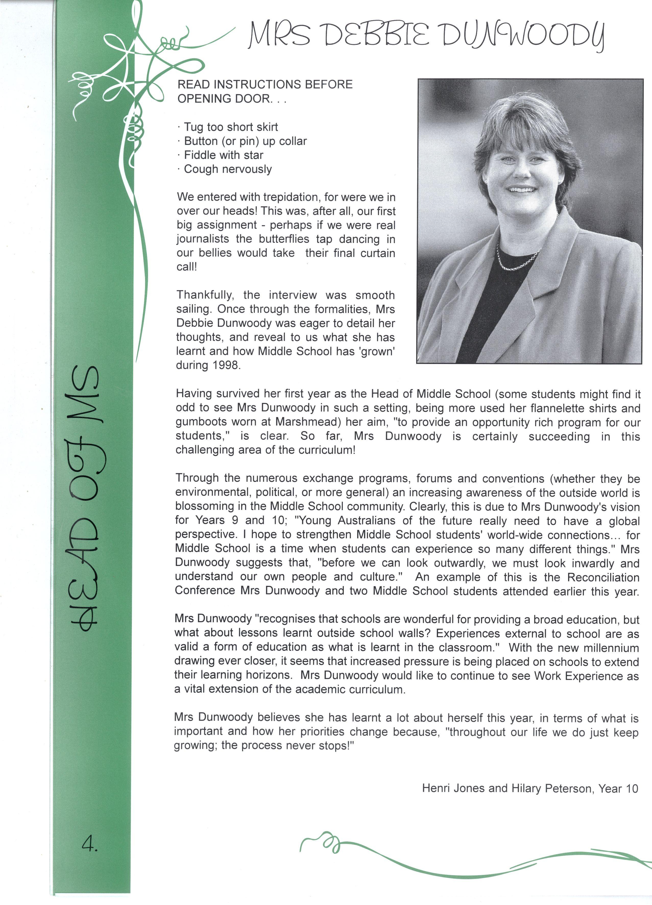 Thankfully, the interview was smooth sailing Once through the formalities, Mrs Debbie Dunwoody was eager to detail her thoughts, and reveal to us what she has learnt and how Middle School has 'grown' during 1998.