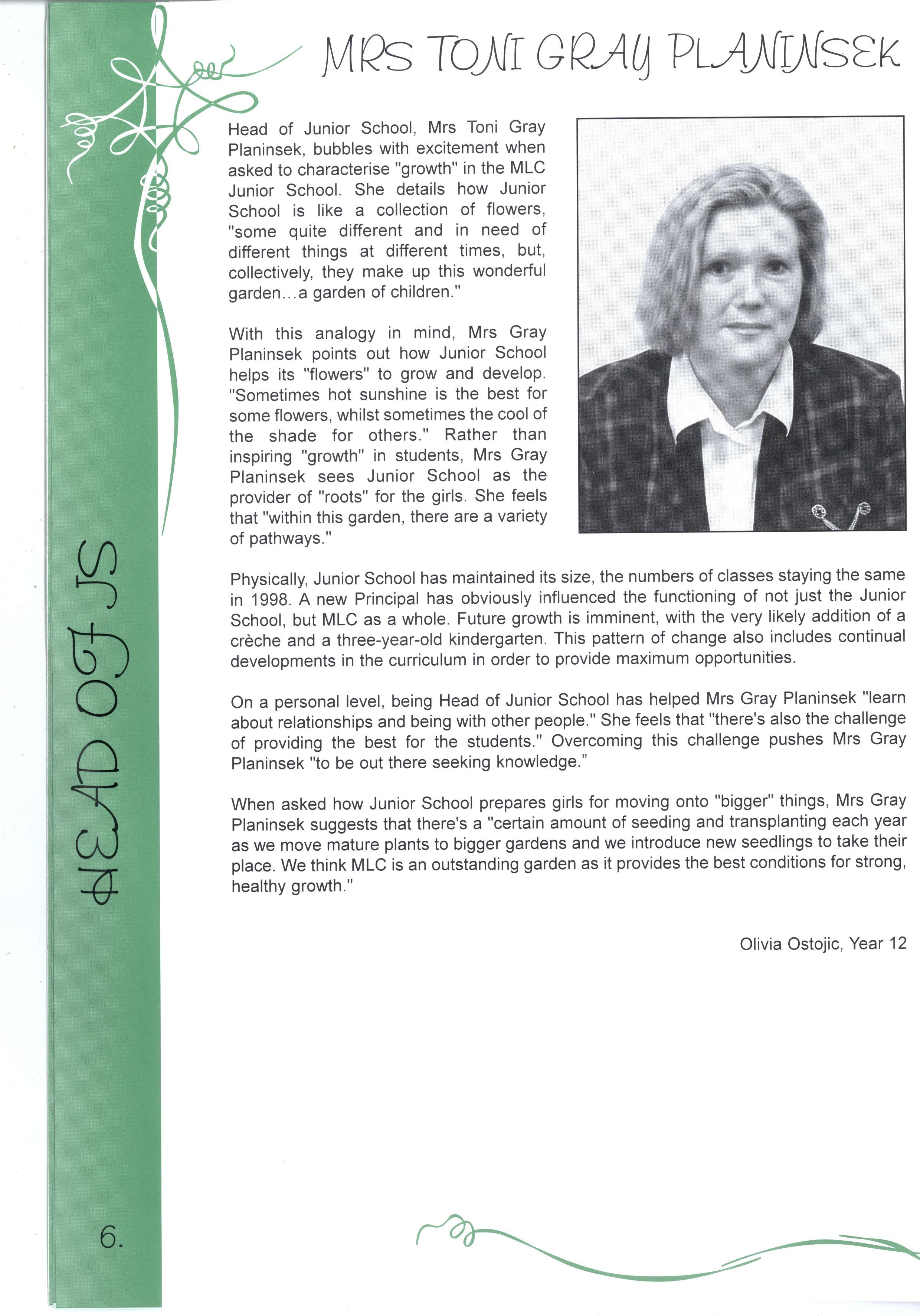 Head of Junior School, Mrs Toni Gray Planinsek, bubbles with excitement when asked to characterise "growth" in the MLC Junior School She details how Junior School is like a collection of flowers, "some quite different and in need of different things at different times, but, collectively, they make up this wonderful garden...a garden of children."
