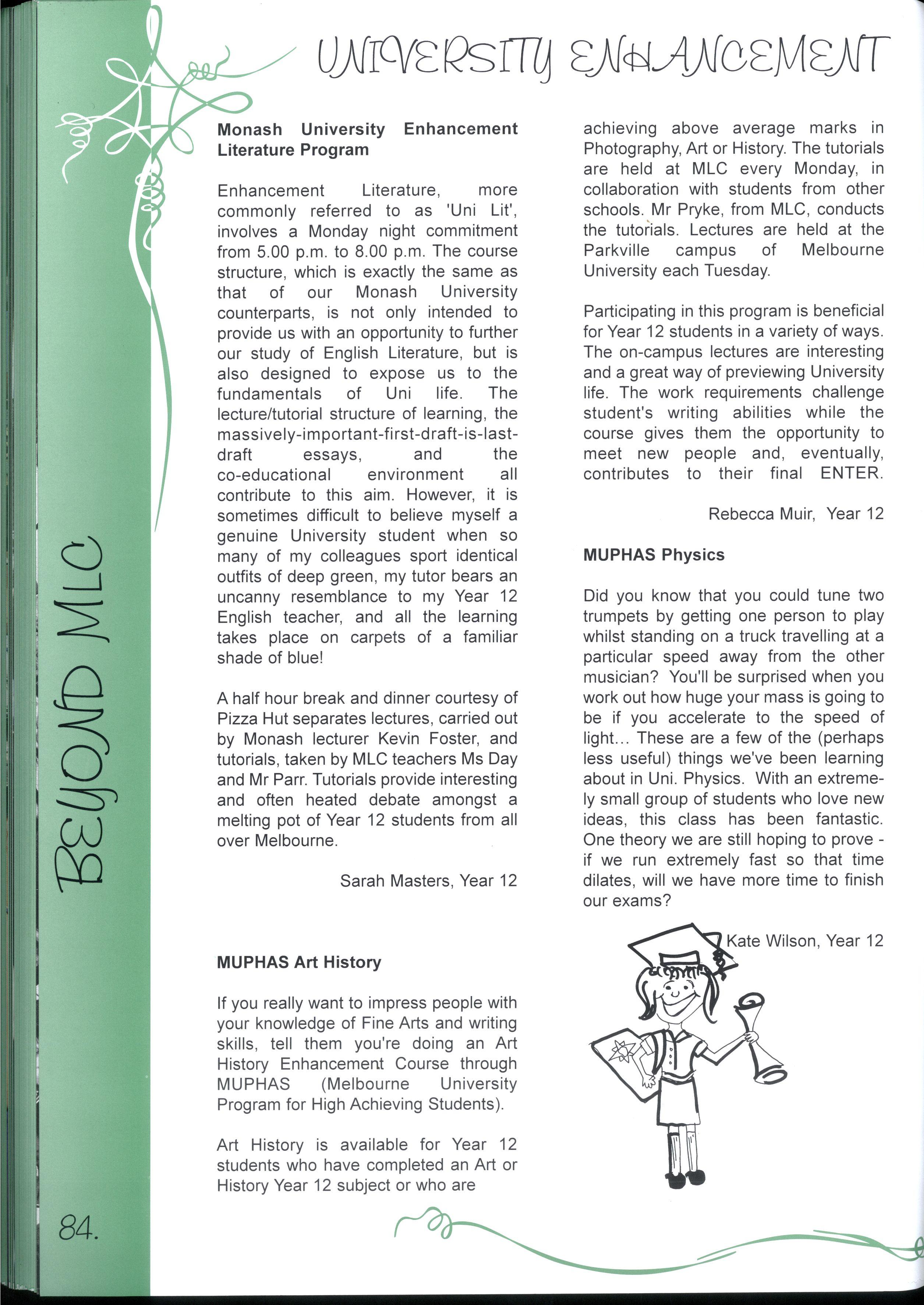 Enhancement Literature, more commonly referred to as 'Uni Lit', involves a Monday night commitment from 5.00 p.m to 8.00 p.m The course structure, which is exactly the same as that of our Monash University counterparts, is not only intended to provide us with an opportunity to further our study of English Literature, but is also designed to expose us to the fundamentals of Uni life The lecture/tutorial structure of learning, the massively-important-first-draft-is-lastdraft essays, and the co-educational environment all contribute to this aim However, it is sometimes difficult to believe myself a genuine University student when so many of my colleagues sport identical outfits of deep green, my tutor bears an uncanny resemblance to my Year 12 English teacher, and all the learning takes place on carpets of a familiar shade of blue!