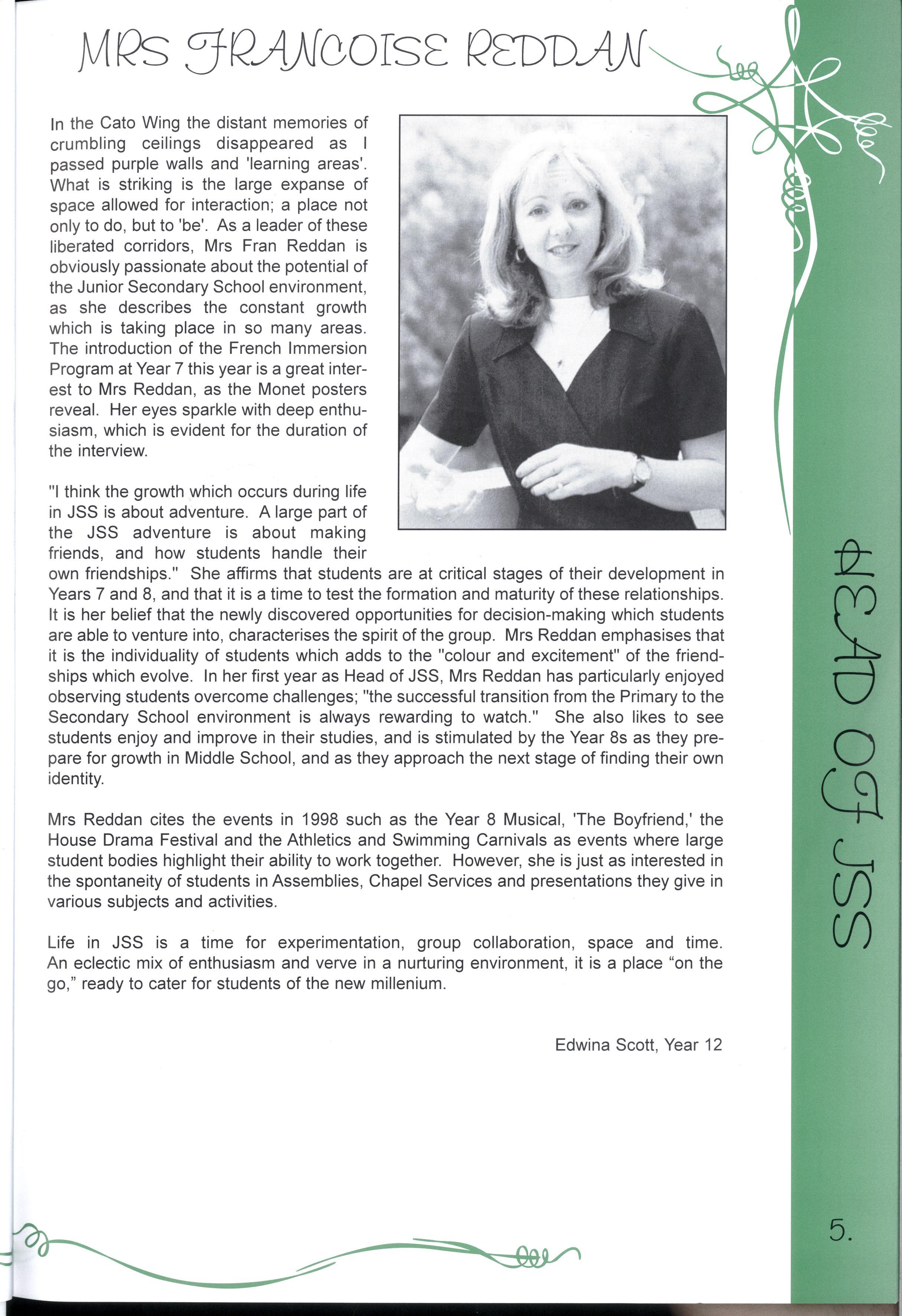 In the Cato Wing the distant memories of crumbling ceilings disappeared as I passed purple walls and 'learning areas'. What is striking is the large expanse of space allowed for interaction; a place not only to do, but to 'be' As a leader of these liberated corridors, Mrs Fran Reddan is obviously passionate about the potential of the Junior Secondary School environment, as she describes the constant growth which is taking place in so many areas The introduction of the French Immersion Program at Year 7 this year is a great interest to Mrs Reddan, as the Monet posters reveal Her eyes sparkle with deep enthusiasm, which is evident for the duration of the interview