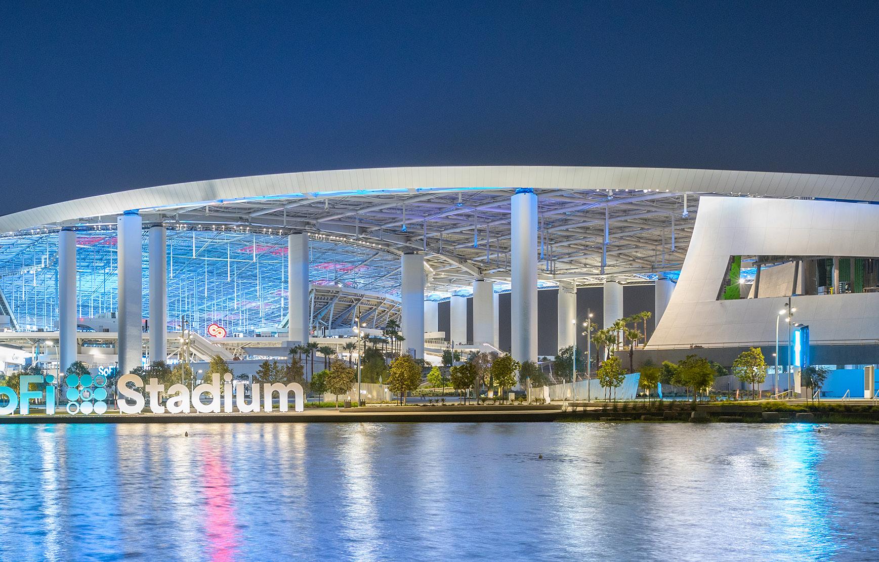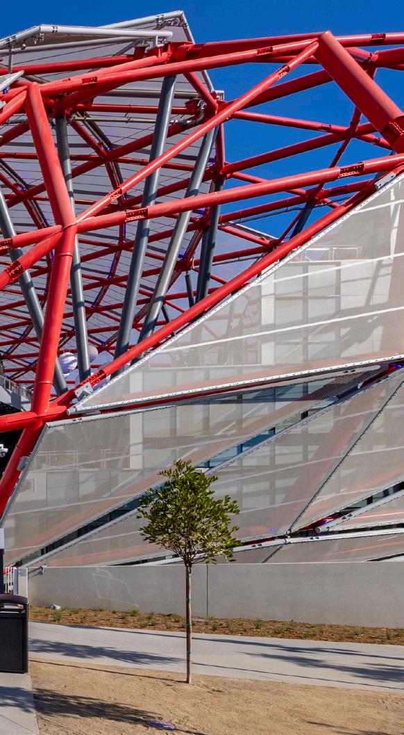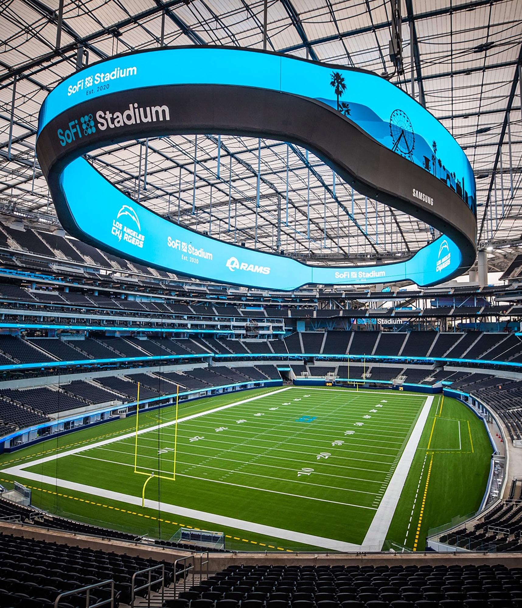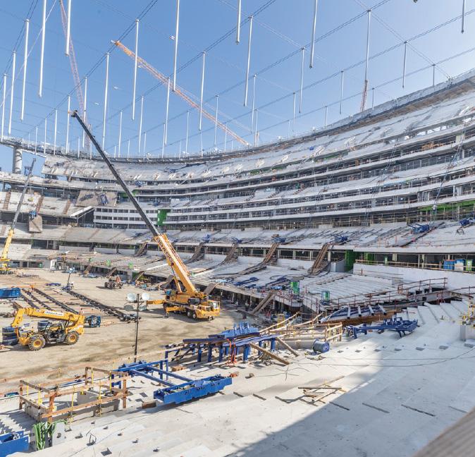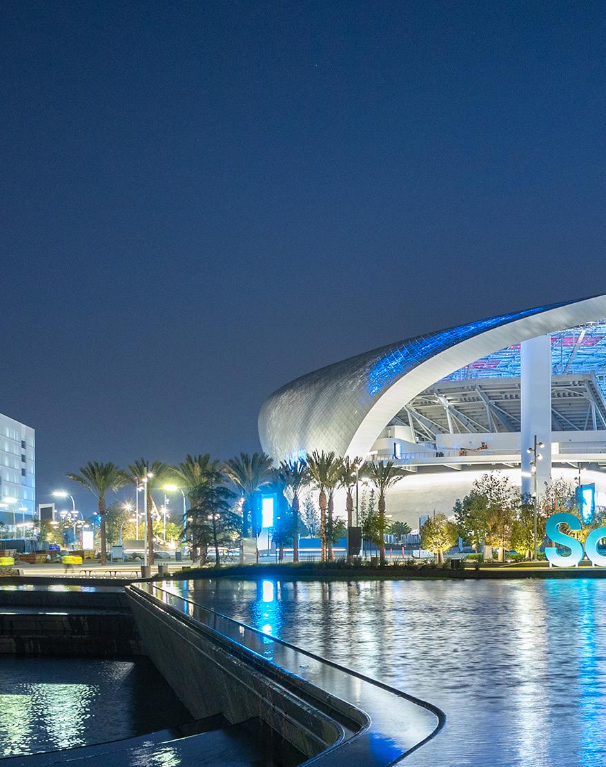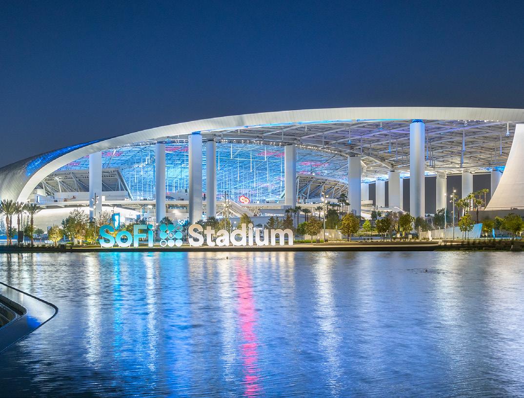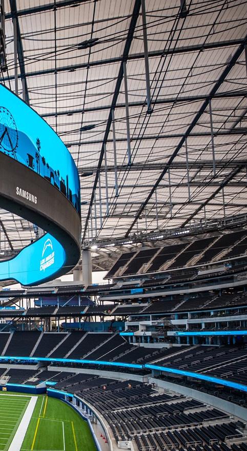 SoFi Stadium is a first-of-its-kind, 3.1 million-square-foot indoor-outdoor sports and entertainment venue that anchors a 298-acre mixed-use development in Inglewood, California. Delivered by the Turner/AECOM Hunt joint venture, this ultra-modern complex serves as the home for both the Los Angeles Rams and Chargers. The stadium features 70,000 seats—expandable to over 100,000— alongside a revolutionary dual-sided 4K videoboard called The Oculus. In addition to its size and scope, SoFi is the world’s first stadium to integrate a fully transparent ETFE canopy roof while remaining openair on all sides, offering fans a year-round outdoor experience. Adjacent to the stadium is the 6,000-seat Champions Plaza, designed for concerts, tailgates, and fan engagement.
