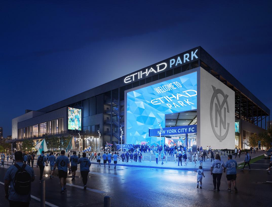 Exterior Features: A dynamic diagrid structure, perforated ETFE membrane, and Clippers Red steel accents create a bold, welcoming entrance.