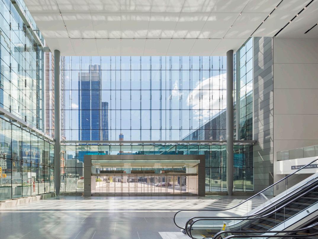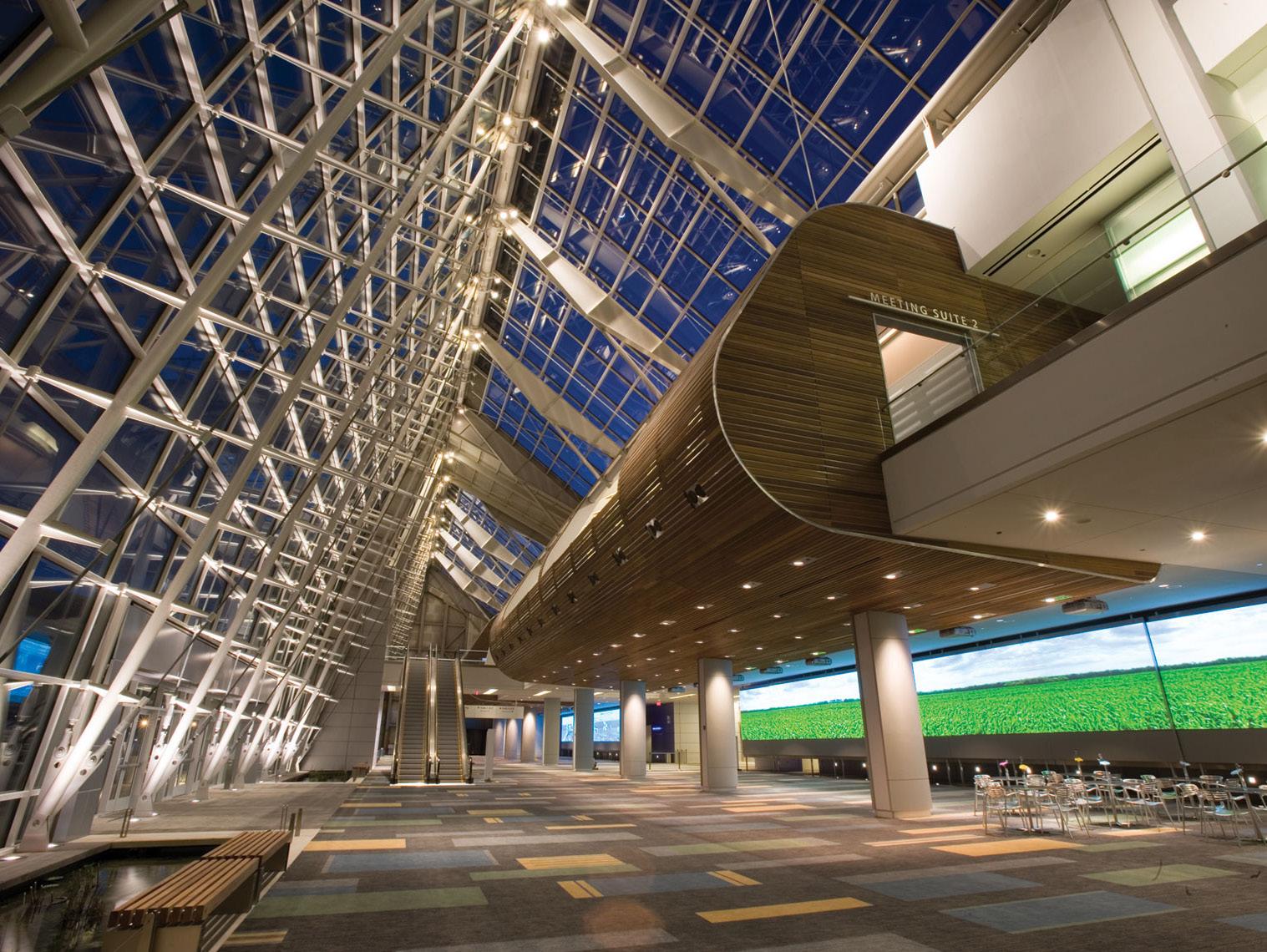 The centerpiece is a 600,000 SF exhibition hall featuring the largest column-free span in North America — over 270 feet wide with 40-foot clearance — designed to host major trade shows and large-scale events. The facility includes a striking 150-foot-high atrium lobby known as the “Snow Cone,” 75 flexible meeting rooms, a 266,000 SF concourse pre-function area, 240,000 SF of support space, outdoor terrace and exhibit areas, and extensive food service amenities.