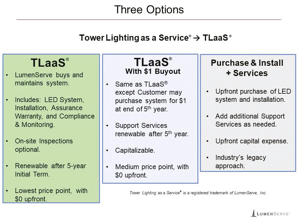 It describes TLaaS as “a unique approach where we will buy a new LED system for your tower, install it, maintain it, protect it against catastrophic events and do the compliance and monitoring.”
