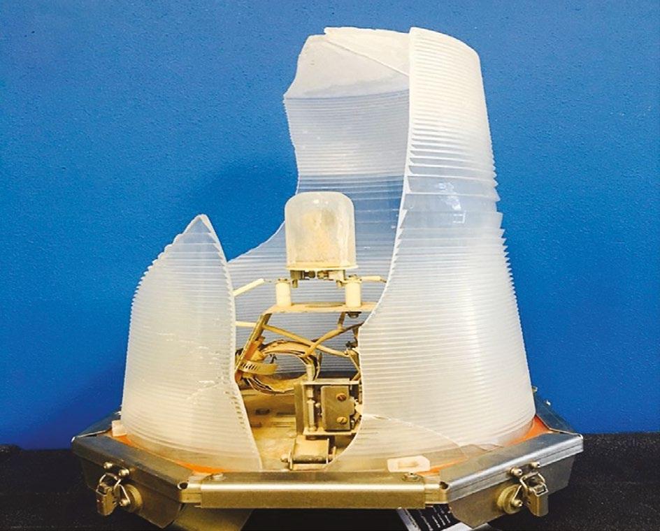 A biennial lens inspection via drone revealed this badly cracked lens. The beacon was still flashing, but for how long?
