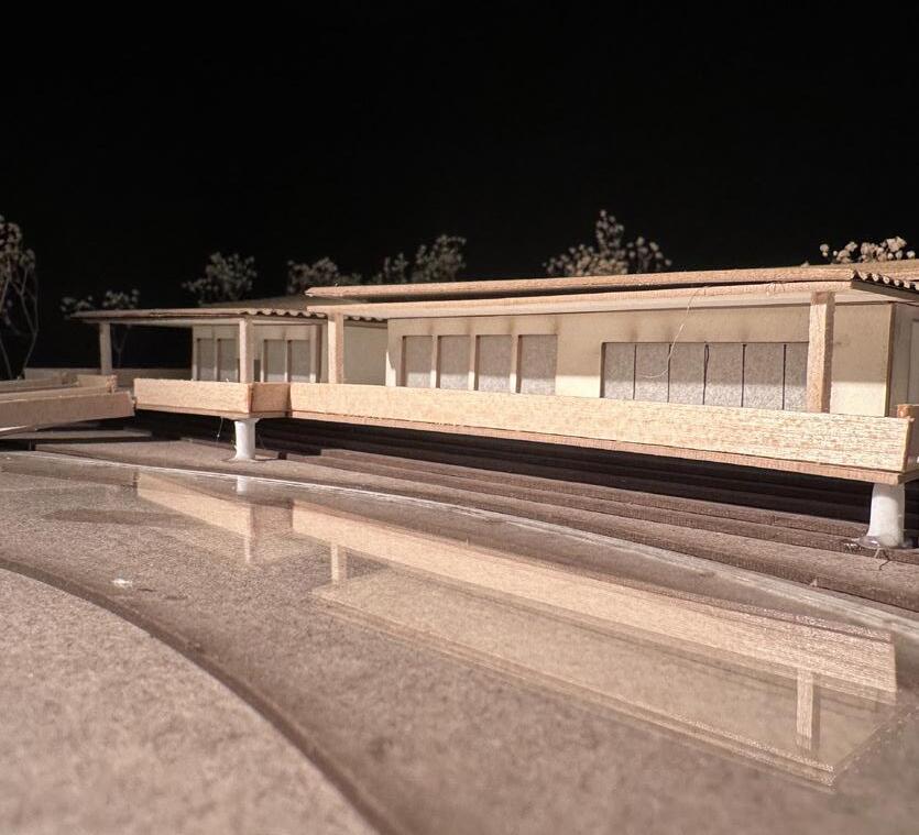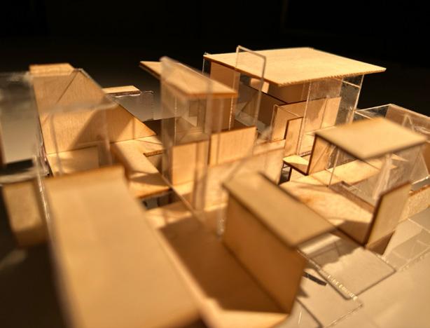 Before we started designing the building, we had to choose 12 screens from a movie and create a model based on those screens. In the model, we needed to create 6 spaces. I chose the movie In the Mood for Love, and the screens depict a lot of character movement, camera movement from left to right, and glimpses of the character behind a curtain. I incorporated these elements into my model by placing glass in front of the wood, allowing viewers to see moments through different layers. I used materials of varying heights to define different types of spaces, and any 4 pieces of material could represent a space. There are no limits to the direction from which you can view the model.