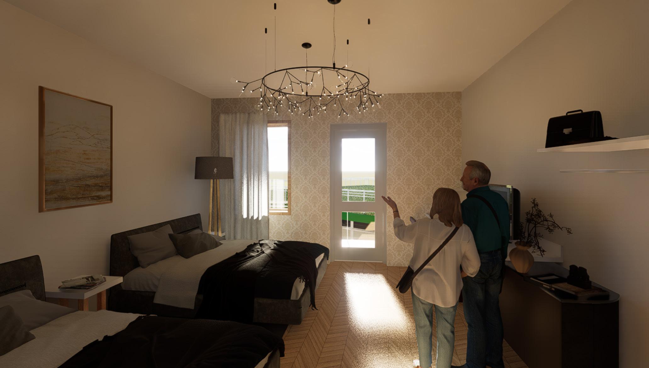The program creates spaces that accommodate families traveling together by offering flexible room layouts,suite-style accommodations, and communal gathering areas.The program aim for family member for all age, it contains a day care, karaoke, recreational space, Private Study room.