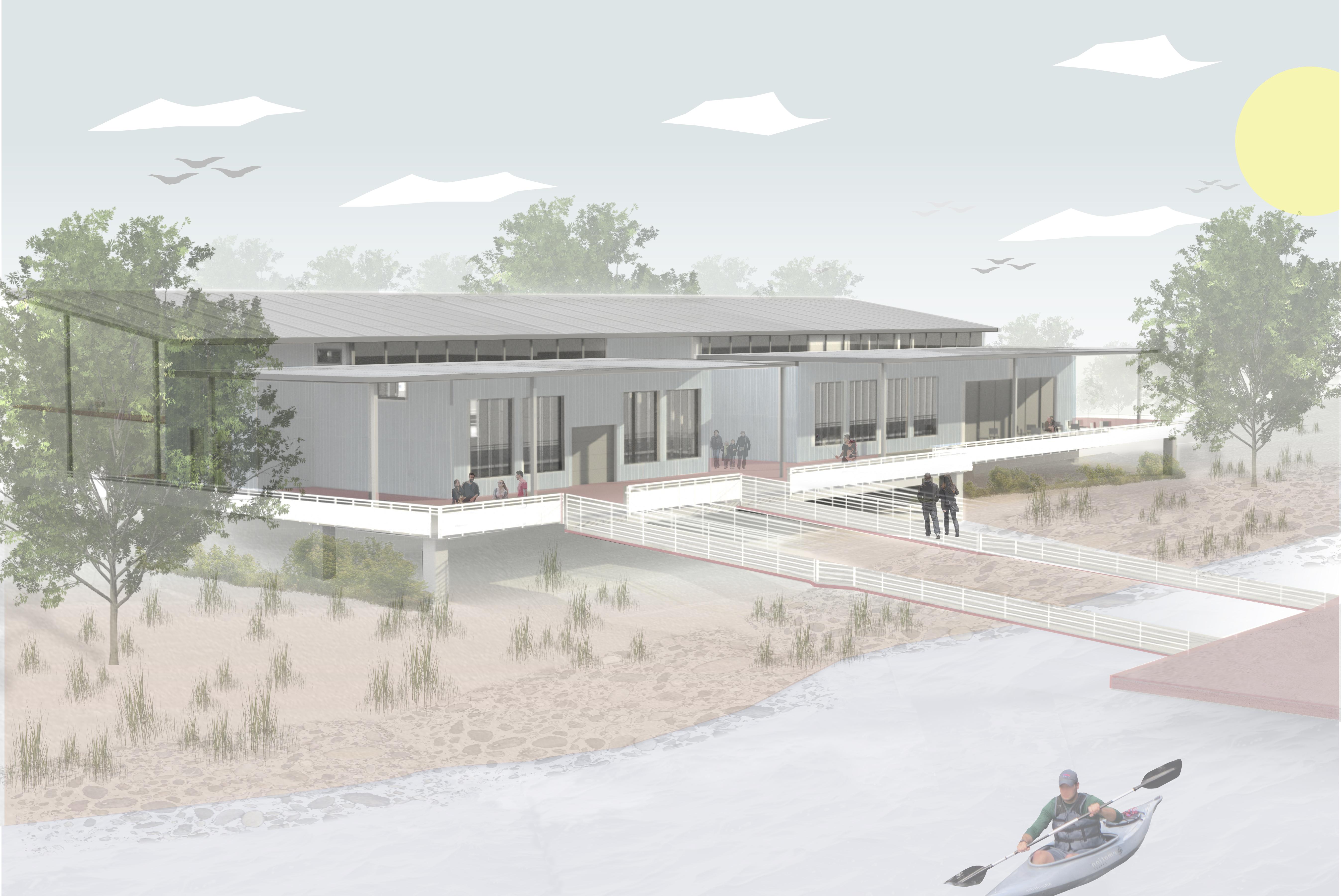 The Lake Thunderbird boat house is designed to serve the human experience and explore the dynamic inter- action between land and water. Developing the intri- cate relationship between the body and space as it unfolds at the waterside, the boathouse brings a wel- coming and relaxing environment.