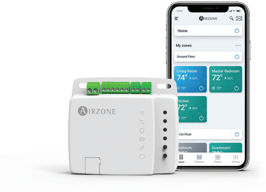 BOOTH 4108 HVAC system protocols and IoT and home automation platform APIs are incompatible. Because they cannot communicate properly, all inverter HVAC systems downgrade to single-speed operation when paired with a smart control device. The Airzone Aidoo Pro provides the industry’s only solution to this problem, according to the company. Aidoo Pro is available now as a system add-on that sits between the HVAC system and IoT con trol devices. Airzone has assembled an exclusive library of manufacturer-certified HVAC protocols, enabling the Aidoo Pro to integrate HVAC inverter systems with device APIs from smart thermostats like ecobee, Honeywell, and Nest, as well as home automation plat forms including Control4, Crestron, ELAN, Lutron, and Savant.