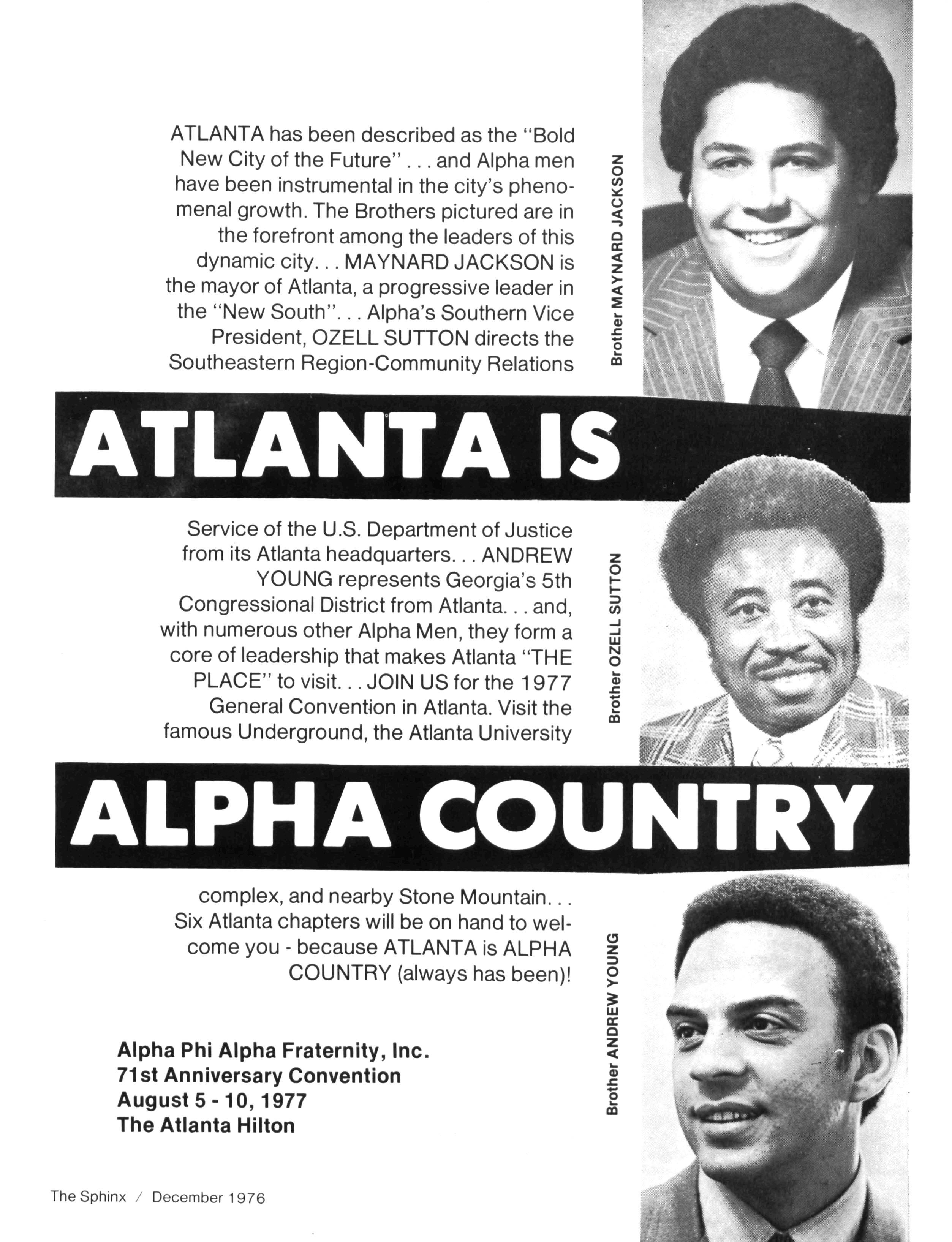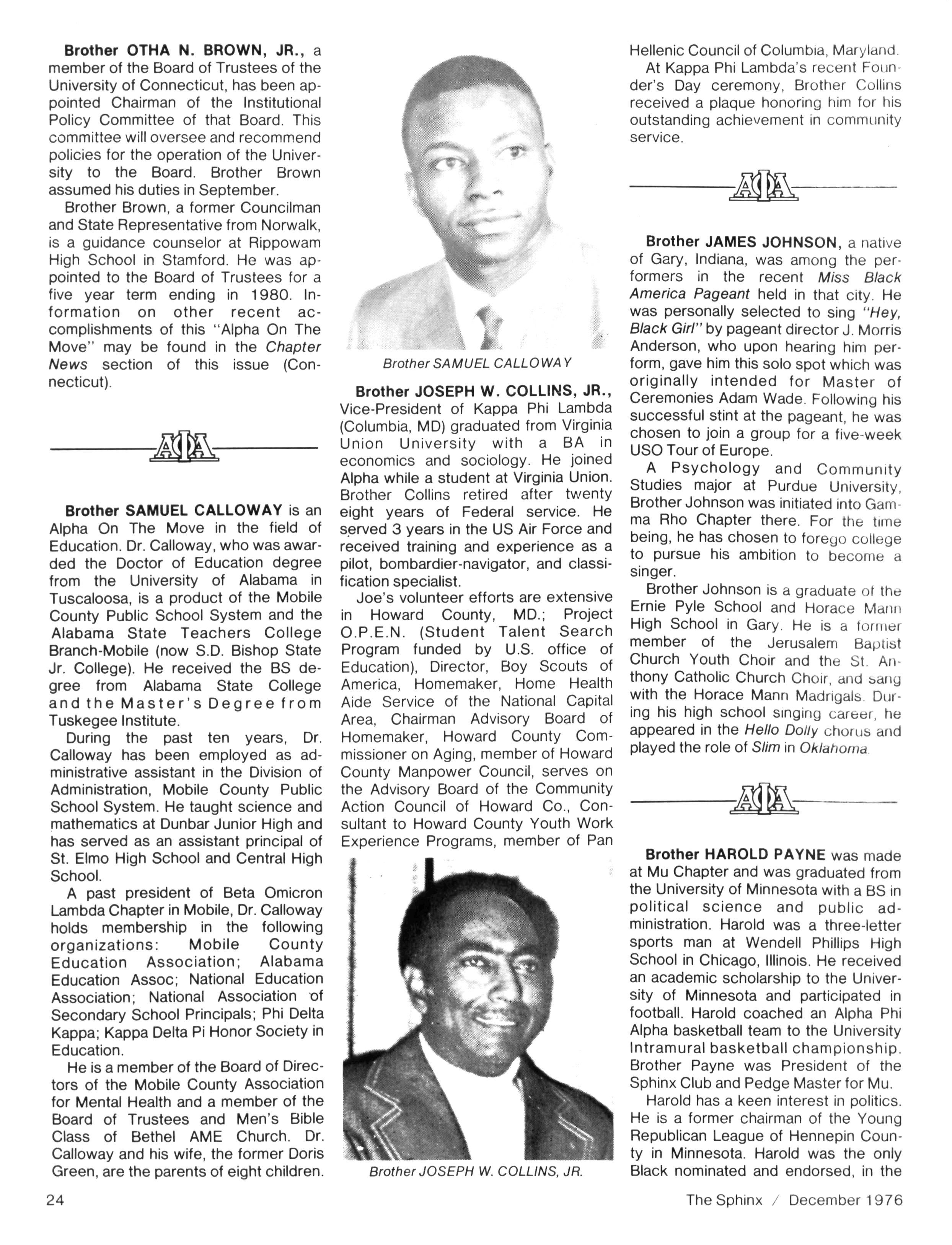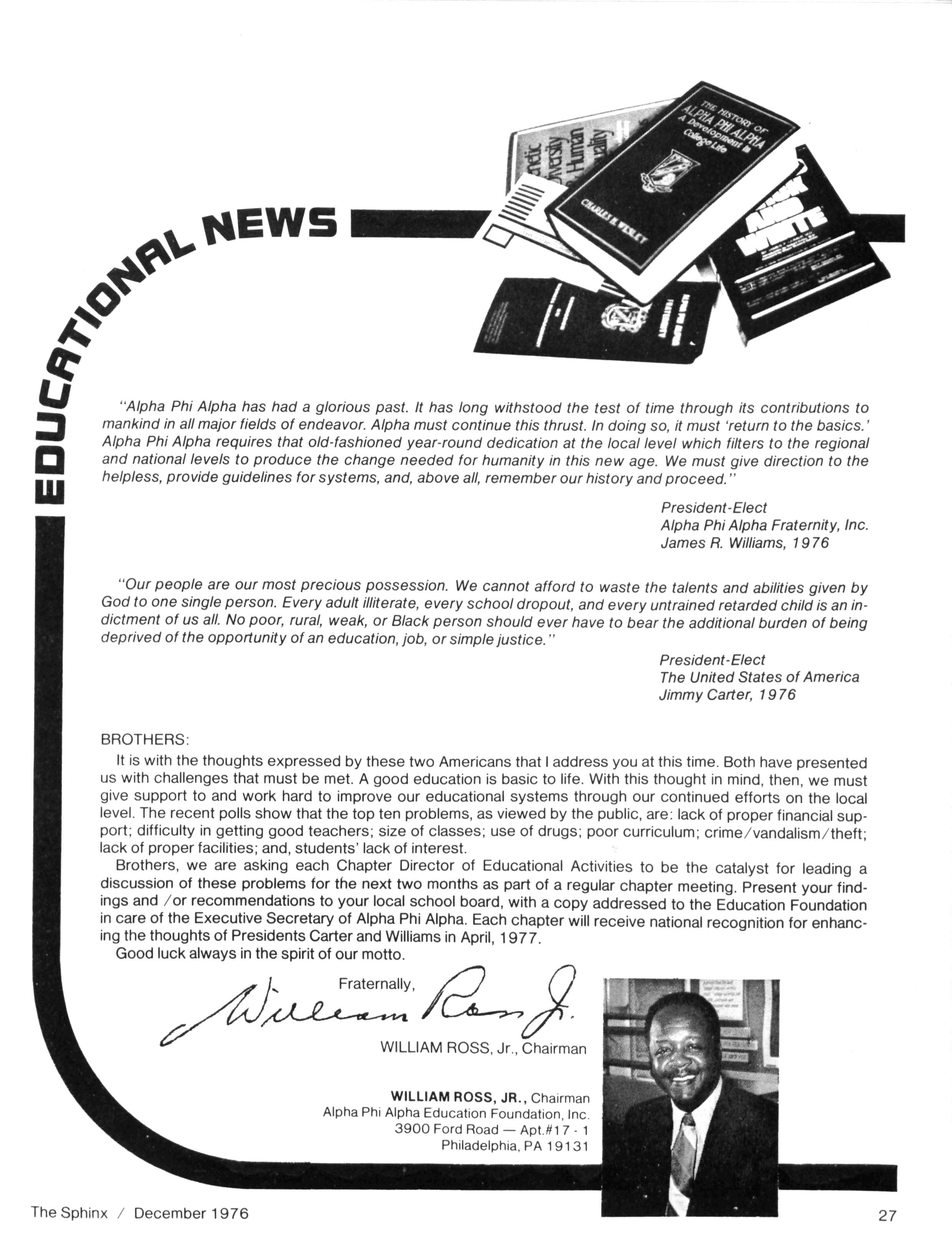 This issue,somewhat smaller than usual,reflects our continuing budgetary problem. Ifwe wish to continue to receive the same high-quality magazine with adequate coverage of all "Alpha events" we must come to grips with the issueof sufficient funds Beginningwith theCommunications Workshop at the Installation Ceremony for our next General President and continuing throughout thefirst partof 1977,weshallbeexploringwaysofdealing with this issue Pleasefeelfreetosubmit anysuggestionstomeonthisquestion FOR INSTANCE, do you want to see extensive advertising in your magazine. Would you (individual or chapter) buy ads in a special pre-convention issue. These and other ideas are among those to be explored Letusknowwhat youthink A specialnoteof thanks isoffered to all who have helped with the continued progress of The Sphinx We have been pleased to see some of our innovations appear inother journals -an unmistakable indication of our status. . . Thanks also to Brother J. Y. MORELAND for his feature article on Miss Black & Gold and to Brother WILLIAM AGEE for hisarticle on lota Nufor theCollege Scenesection I was most pleased to receive the many cards and letters from Brothers who were happy with the October Issue Thanksfor taking the time towrite We're now busyworking onthe February 1977 Issue,which promises to be another 'biggie ...All material for the February issueshould now be in-if not,mail ittoday Also,pleasenotethat the DEADLINE for theMAY Issueis March 15 Thiswill allow ustimetoinsurethat College Brotherswill receive their magazines prior totheendofschool PLEASE COOPERATE and adhere tothisdeadline Untilnext issue