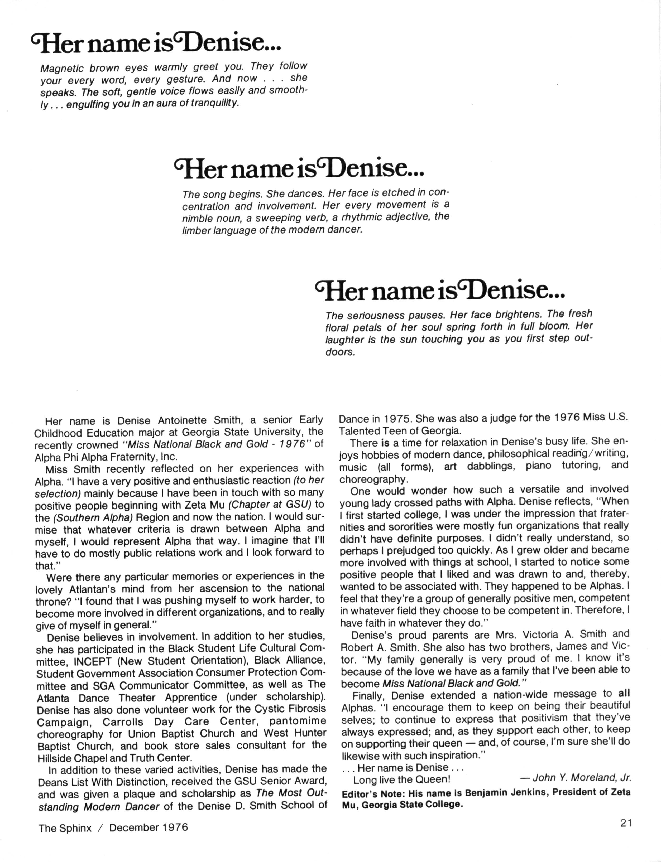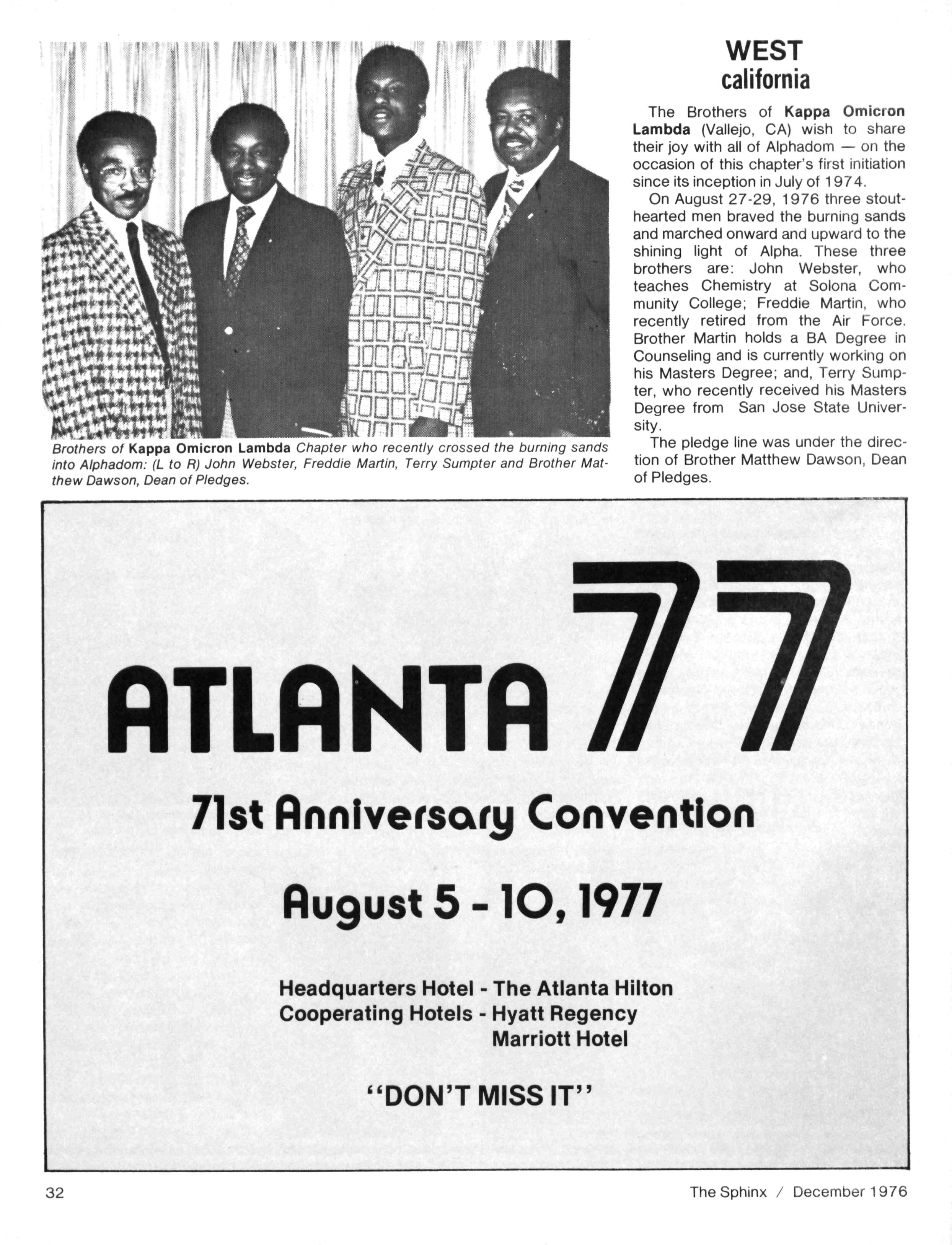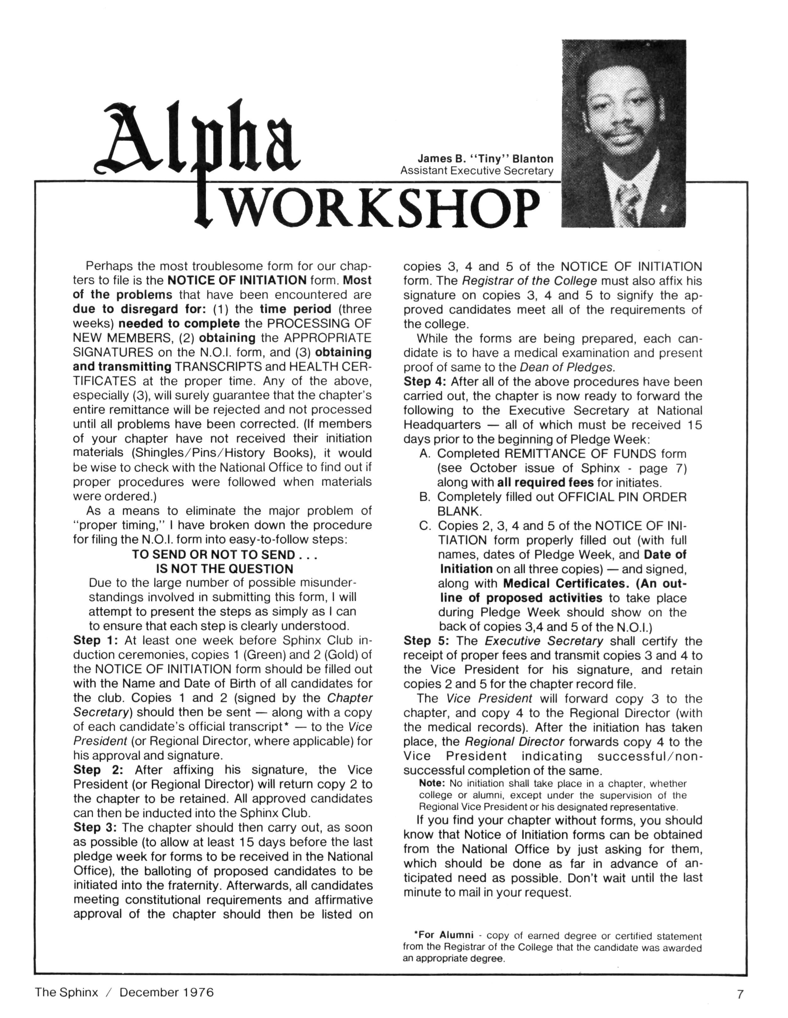 This issue,somewhat smaller than usual,reflects our continuing budgetary problem. Ifwe wish to continue to receive the same high-quality magazine with adequate coverage of all "Alpha events" we must come to grips with the issueof sufficient funds Beginningwith theCommunications Workshop at the Installation Ceremony for our next General President and continuing throughout thefirst partof 1977,weshallbeexploringwaysofdealing with this issue Pleasefeelfreetosubmit anysuggestionstomeonthisquestion FOR INSTANCE, do you want to see extensive advertising in your magazine. Would you (individual or chapter) buy ads in a special pre-convention issue. These and other ideas are among those to be explored Letusknowwhat youthink A specialnoteof thanks isoffered to all who have helped with the continued progress of The Sphinx We have been pleased to see some of our innovations appear inother journals -an unmistakable indication of our status. . . Thanks also to Brother J. Y. MORELAND for his feature article on Miss Black & Gold and to Brother WILLIAM AGEE for hisarticle on lota Nufor theCollege Scenesection I was most pleased to receive the many cards and letters from Brothers who were happy with the October Issue Thanksfor taking the time towrite We're now busyworking onthe February 1977 Issue,which promises to be another 'biggie ...All material for the February issueshould now be in-if not,mail ittoday Also,pleasenotethat the DEADLINE for theMAY Issueis March 15 Thiswill allow ustimetoinsurethat College Brotherswill receive their magazines prior totheendofschool PLEASE COOPERATE and adhere tothisdeadline Untilnext issue
