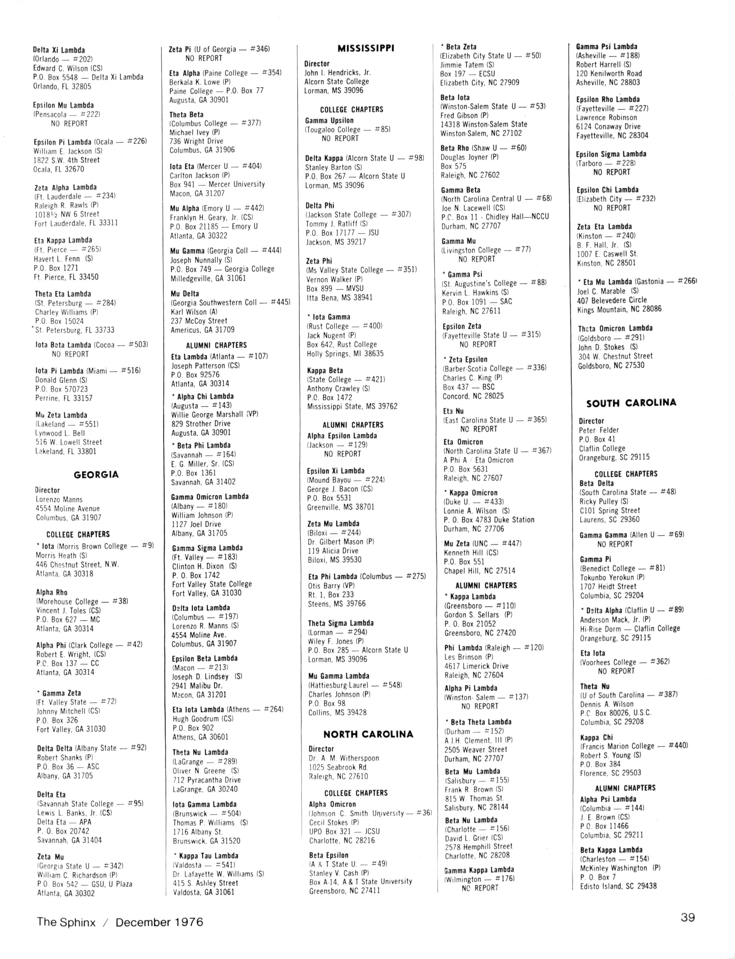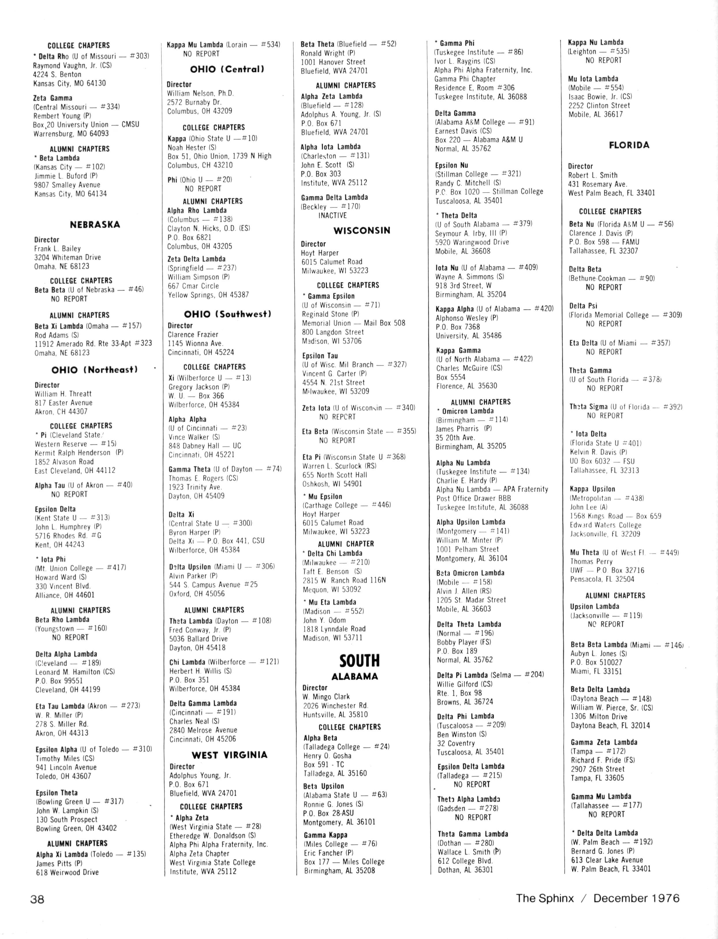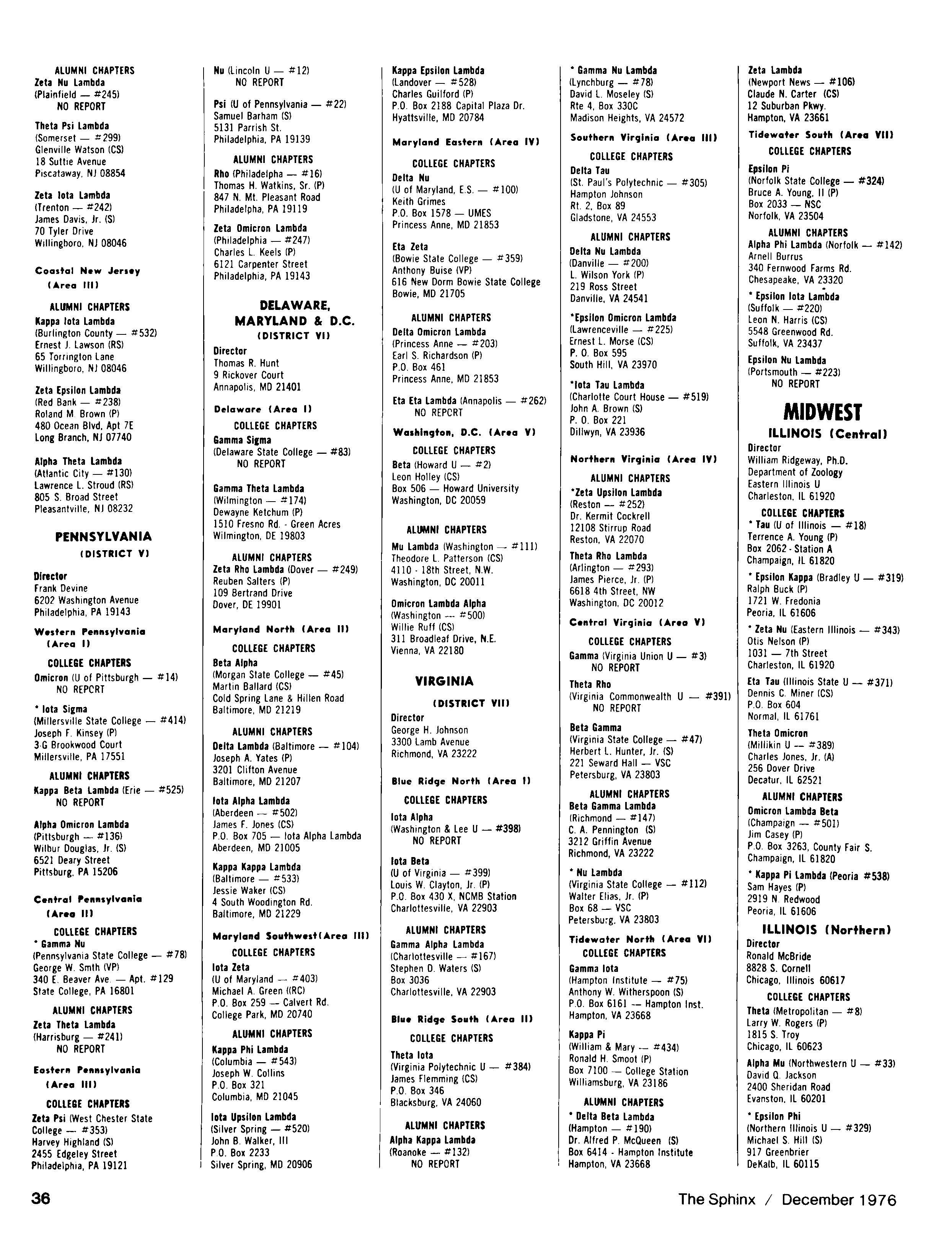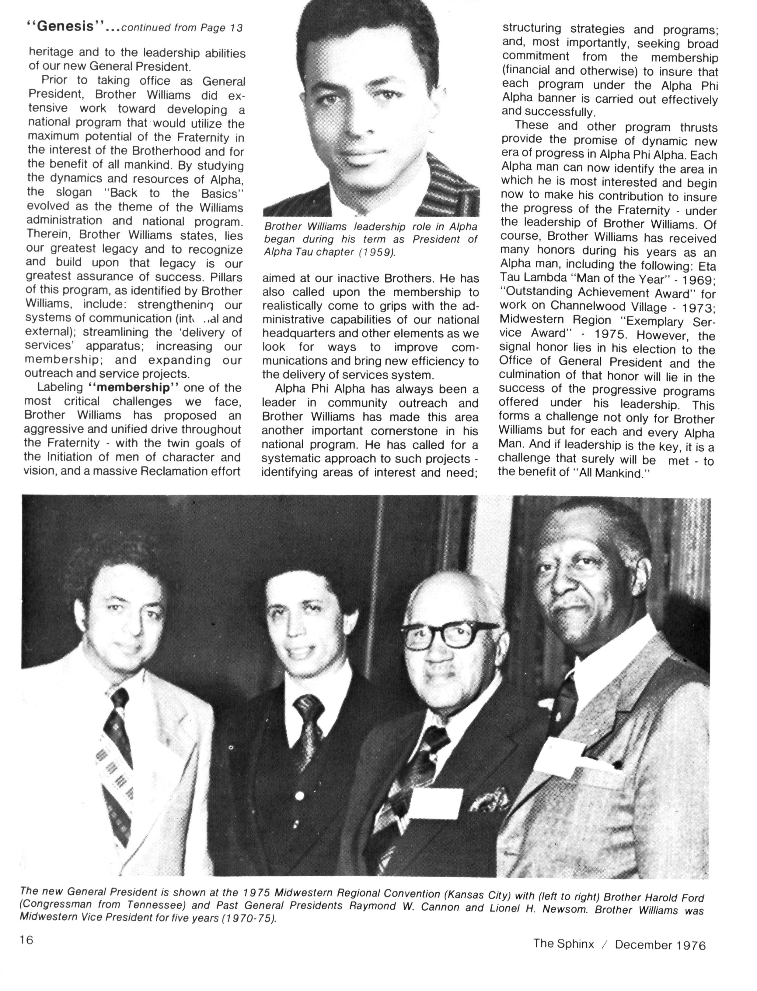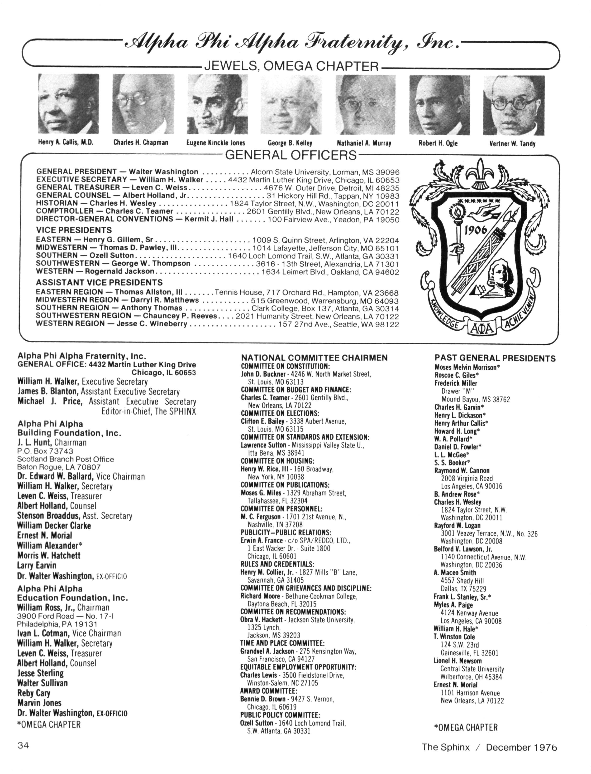 WILLIAM H WALKER Dr WALTER WASHINGTON The Sphinx is the official magazine of the Alpha Phi Alpha Fraternity Inc. 4432 Dr Martin Luther King Dr Chicago IL 60653 Published four times a year February May October and December Send all editorial mail and change of Address (send both addresses) to Alpha Phi Alpha Fraternity 4432 Dr Martin Luther King Drive Chicago IL 60653 Manuscripts or art submitted to The Sphinx should be accompanied by addressed envelopes and return postage Editor assumes no responsibility for return of unsolicited manuscripts or art Opinions expressed m columns and articles do not necessarily reflect the views and policies of Alpha Phi Alpha Fraternity Inc., and use of any person's name in fiction, semi-fiction articles or humorous features is to be regarded as a coincidence and not as the responsibility of The Sphinx It is never done knowingly Copyright 1976 by The Sphinx Alpha Phi Alpha Fraternity Inc Reproduction or use without written permission, of the editorial or pictorial content in any manner is prohibited The Sphinx has been published continuously since 1914 Organizing Editor Bro Raymond W Cannon Organizing General President Bro Henry Lake Dickason Second class postage paid at Chicago IL Postmaster Send form 3579 and all correspondence 4432 Dr Martin Luther King Dr. Chicago Illinois 60653