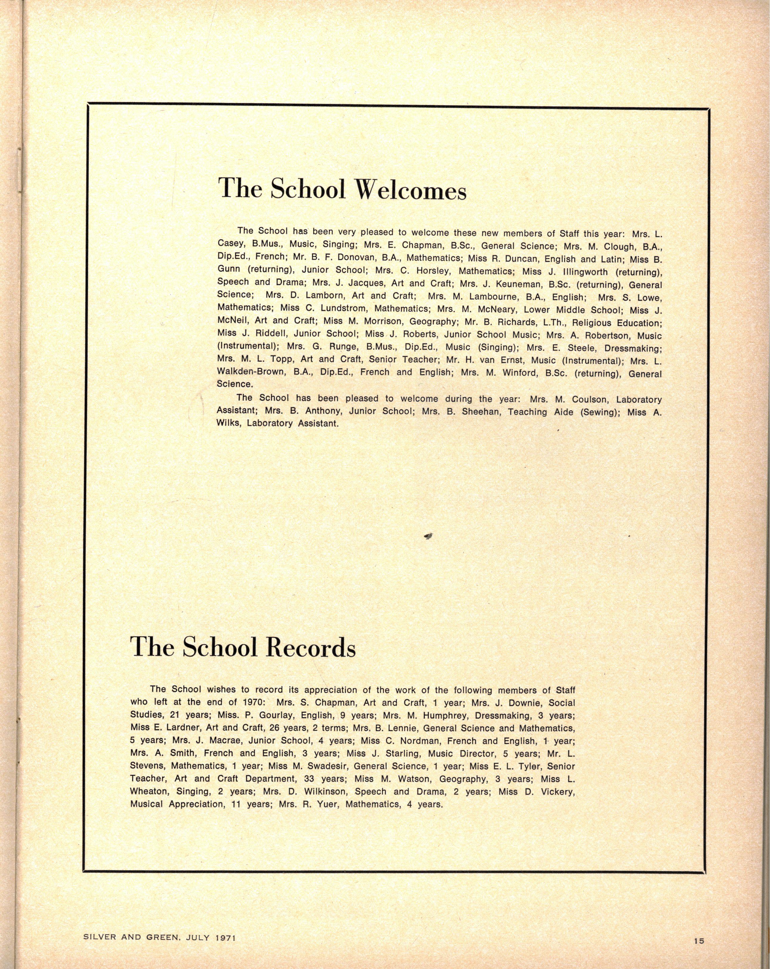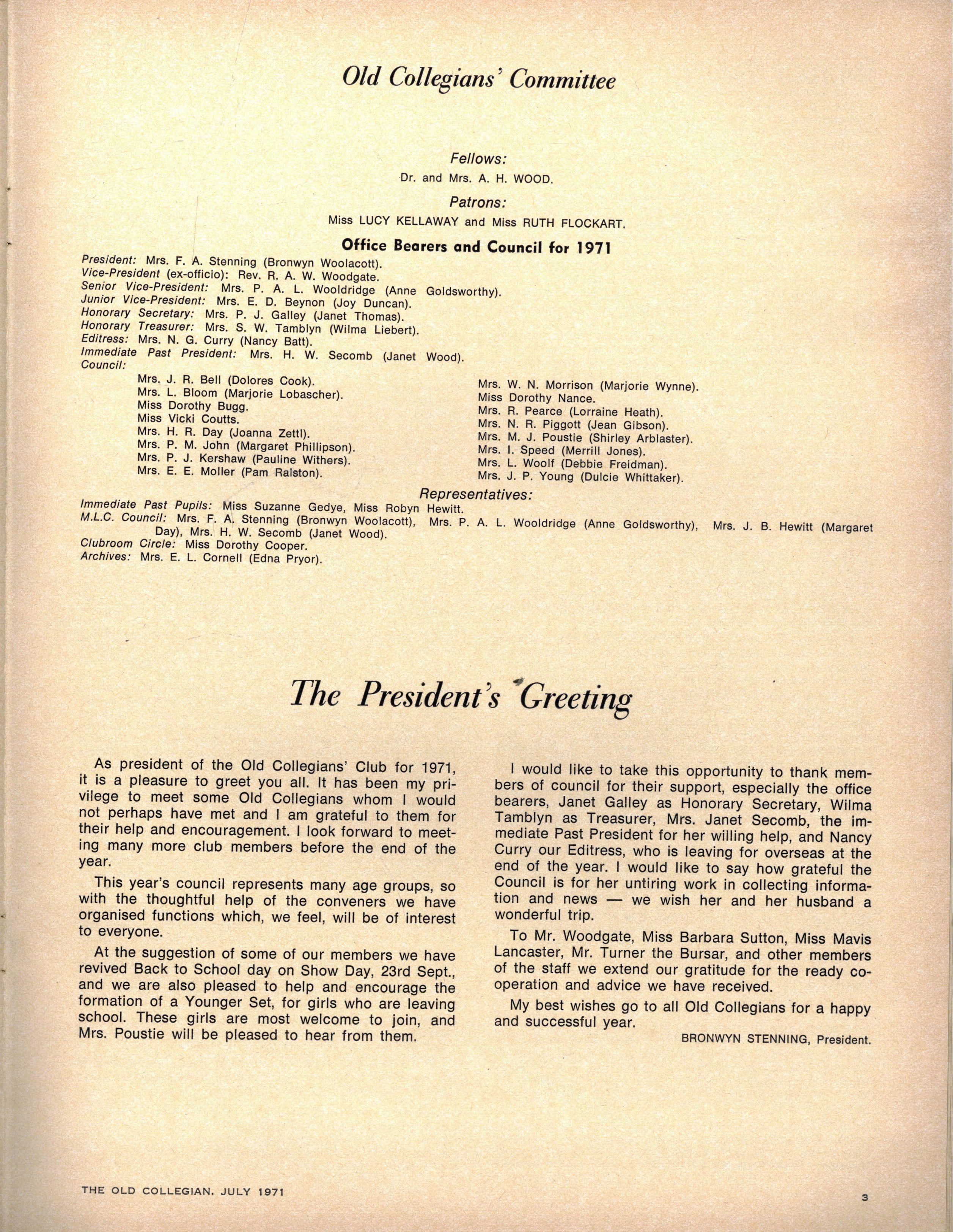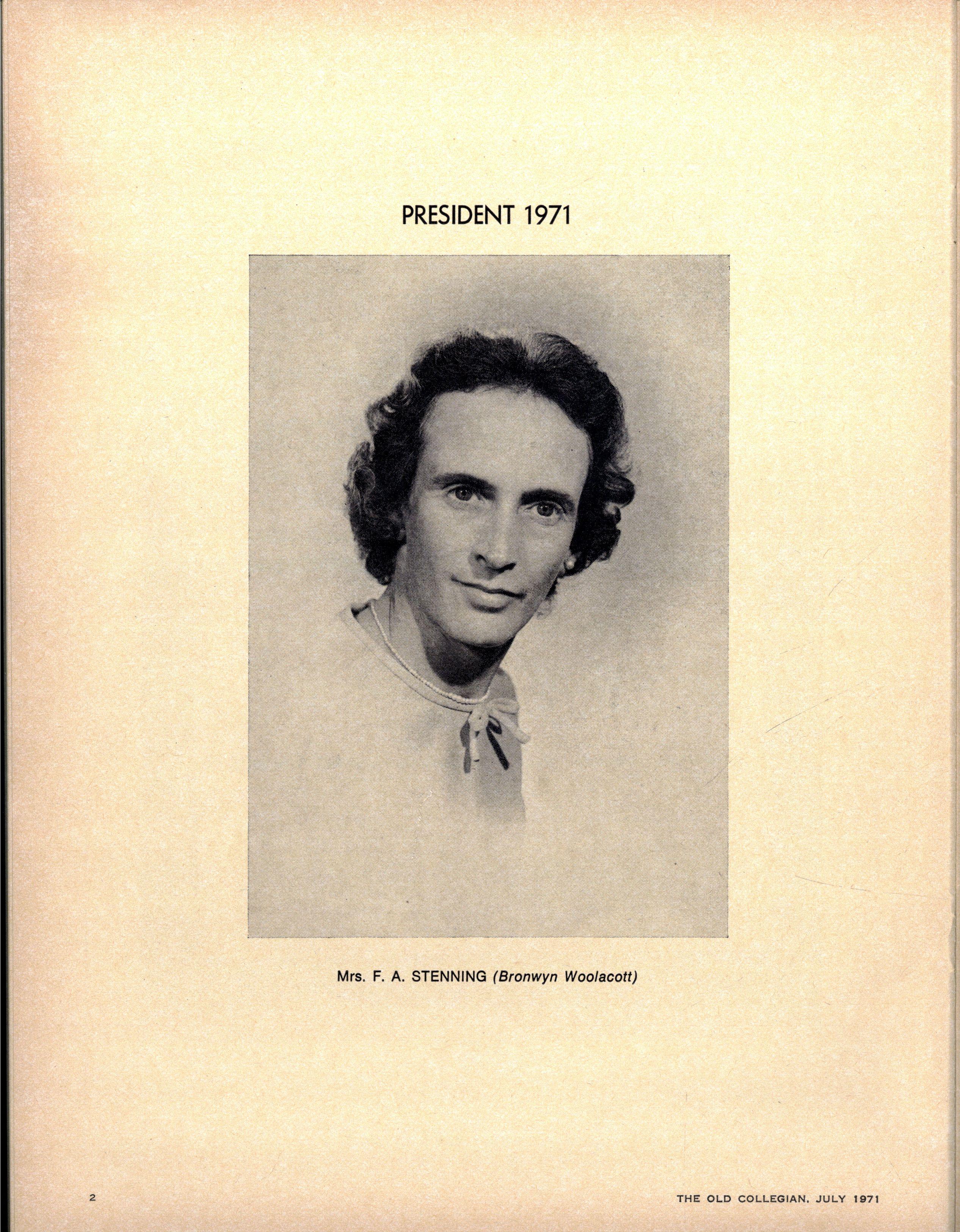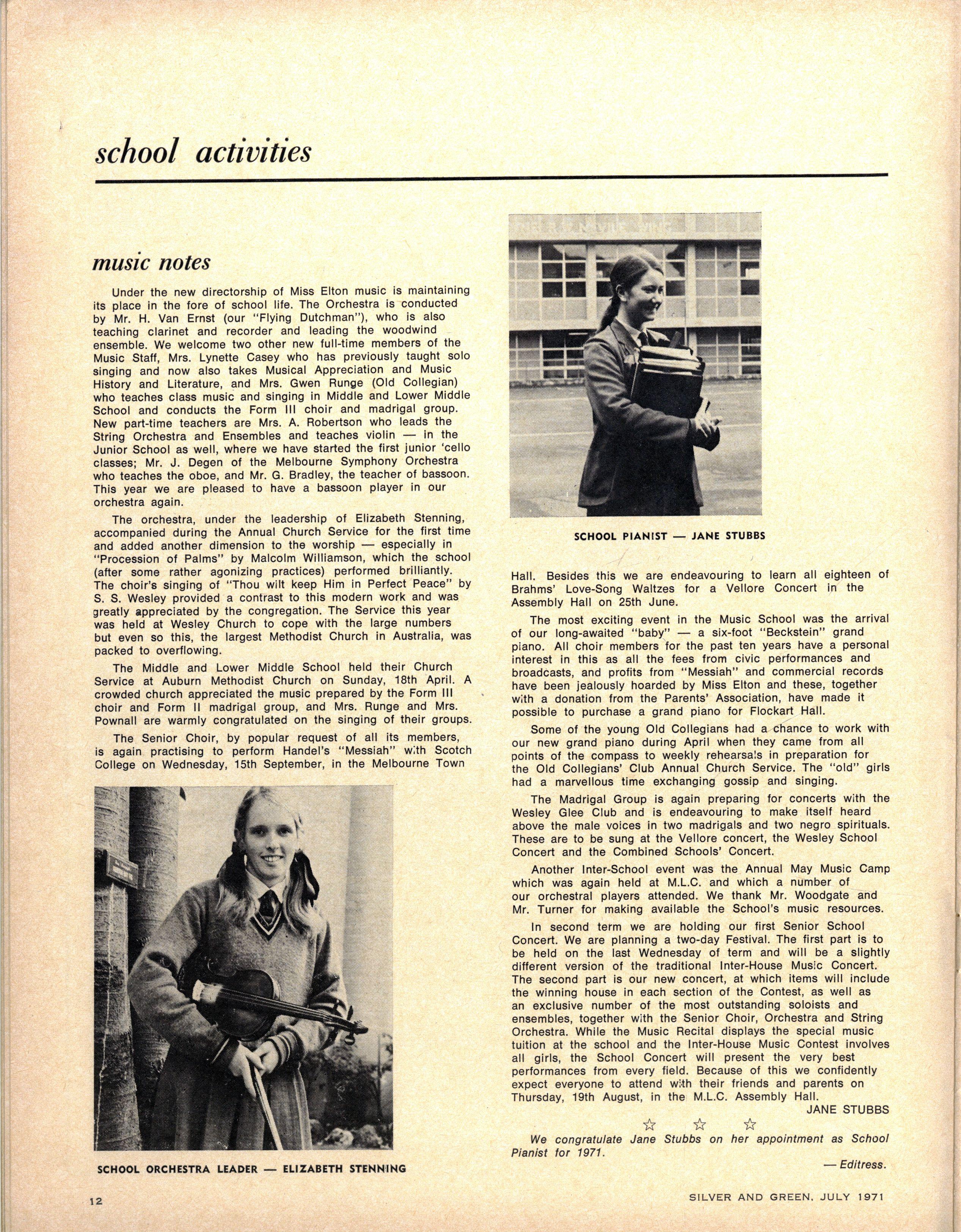 We congratulate Jane Stubbs on her appointment as School Pianist for 1971. Editress.