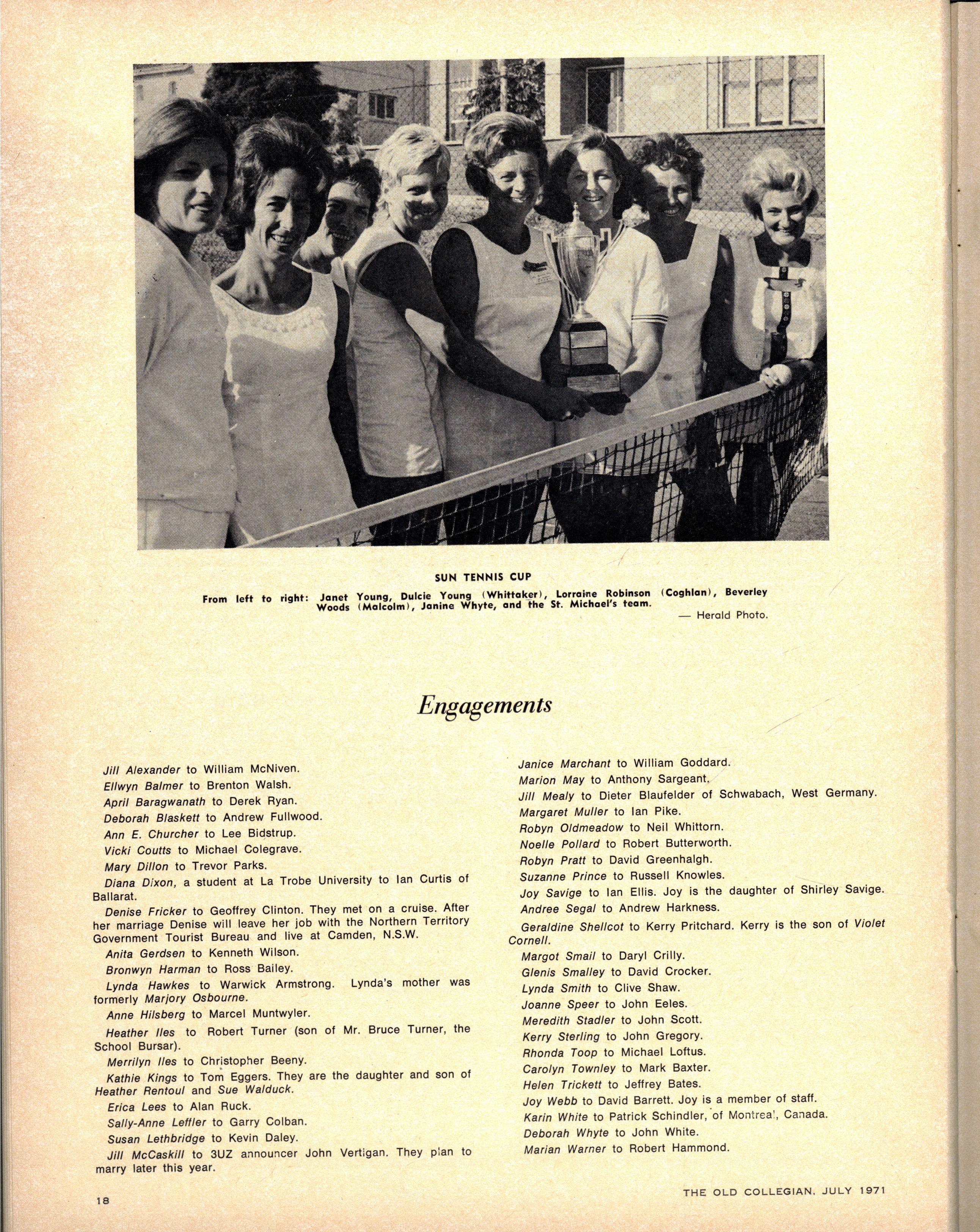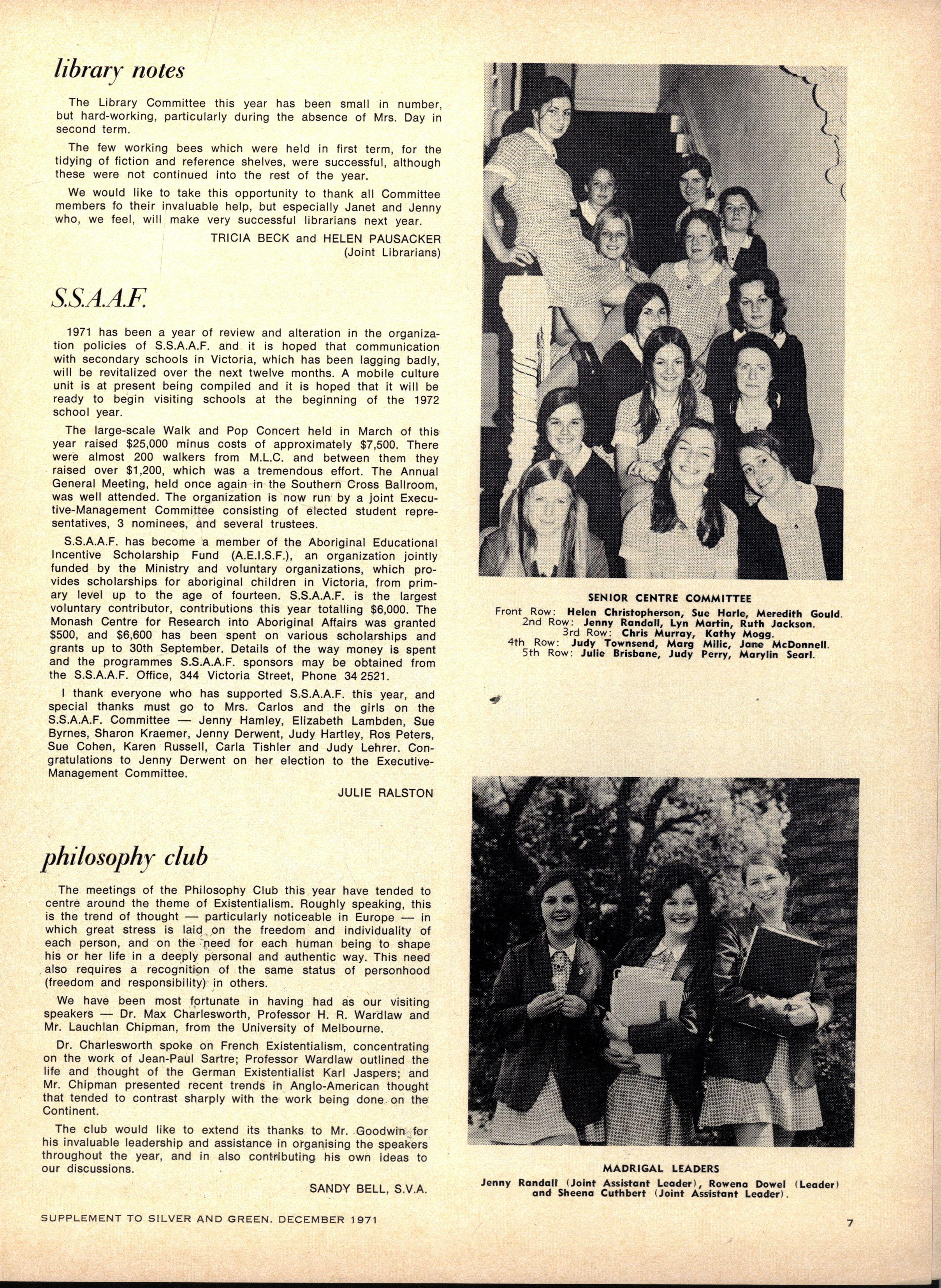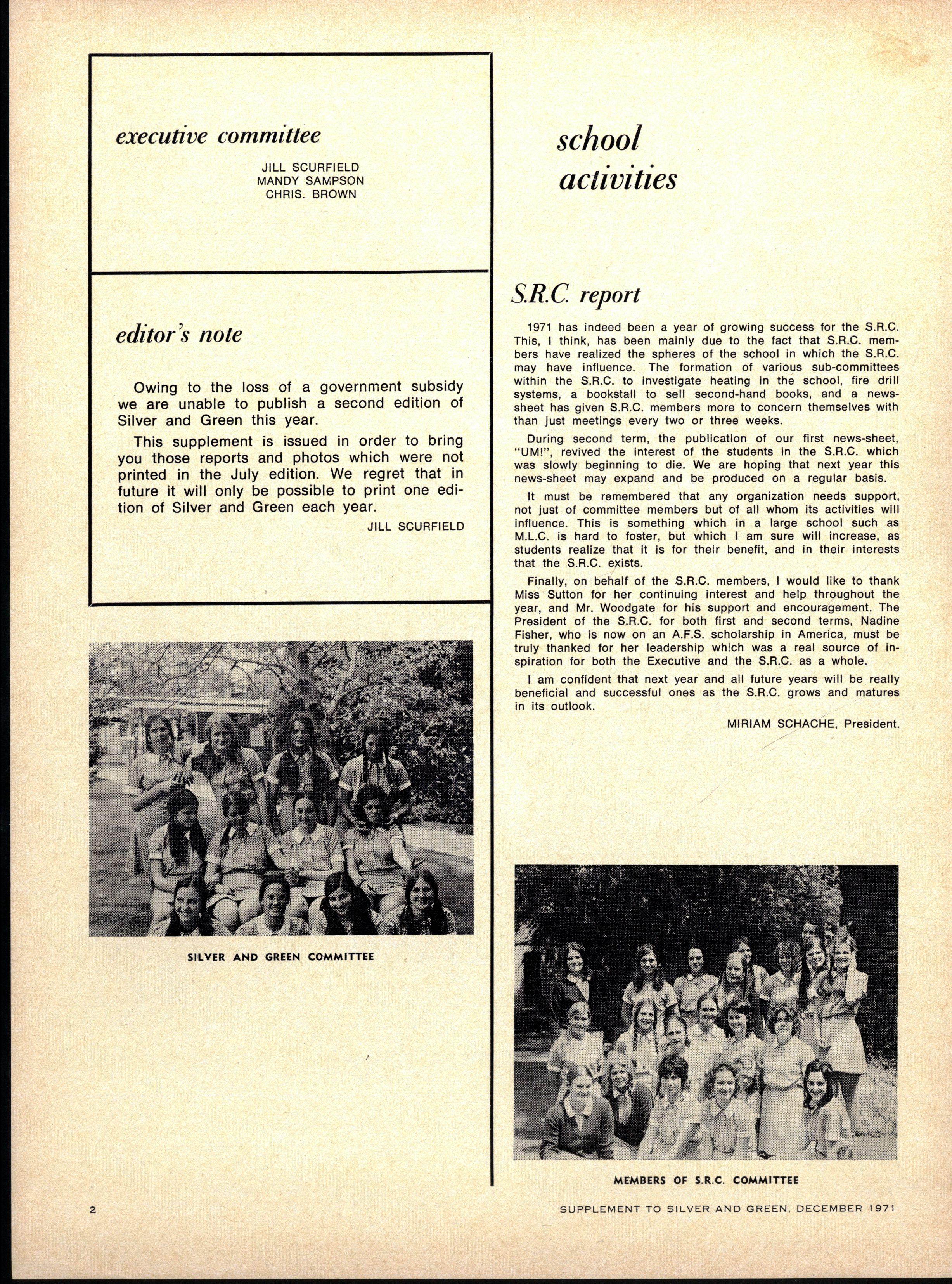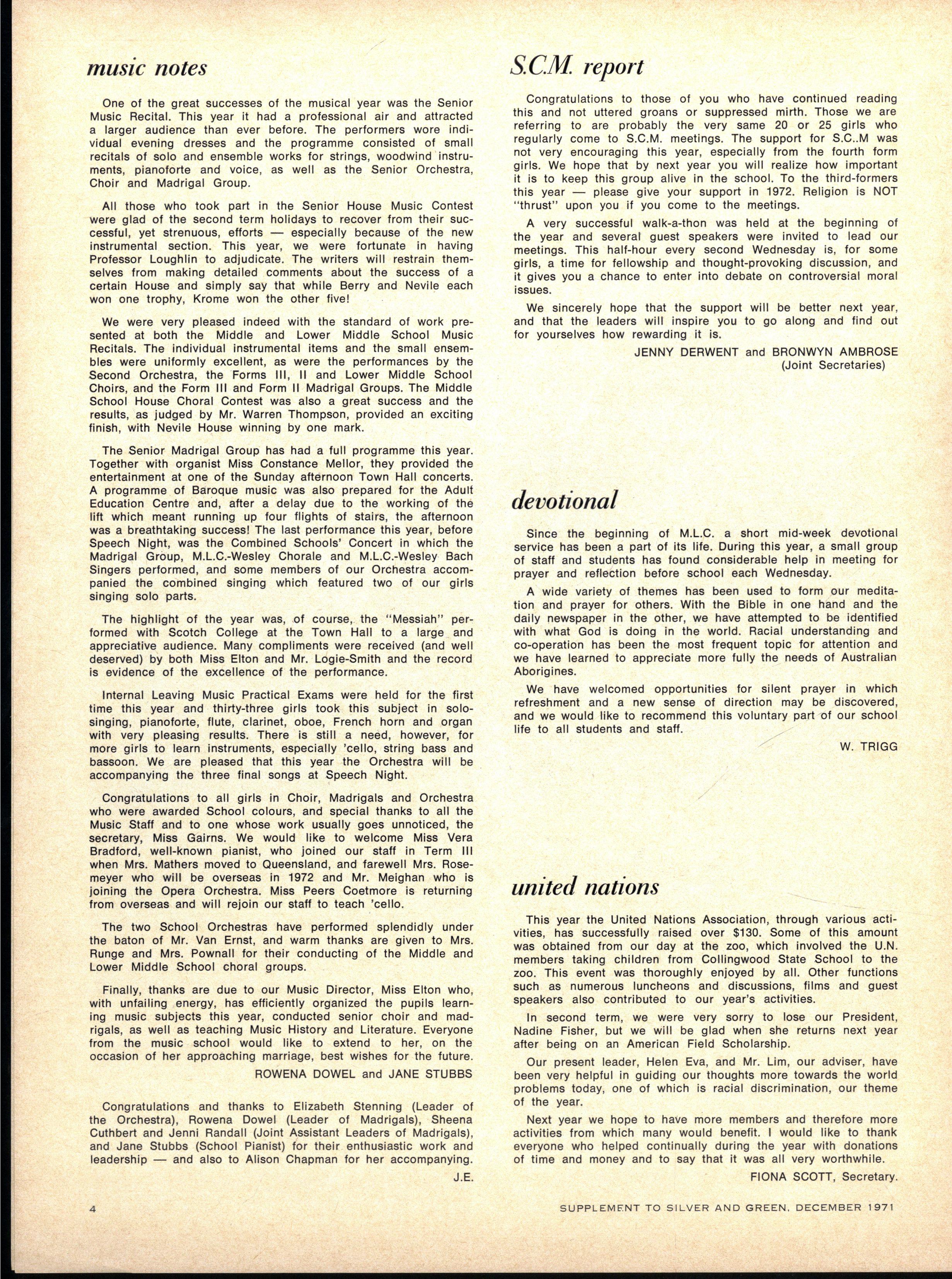 S.C.M EXECUTIVE : Advise r — Th e Rev W Trigg ; Join t Secretarie s — Jenn y Derwent, Bronwy n Ambrose ; Committee — Lis a Adams, Kathry n Clements, Kaye de la Rue, Heather Kenley, Miria m Schache