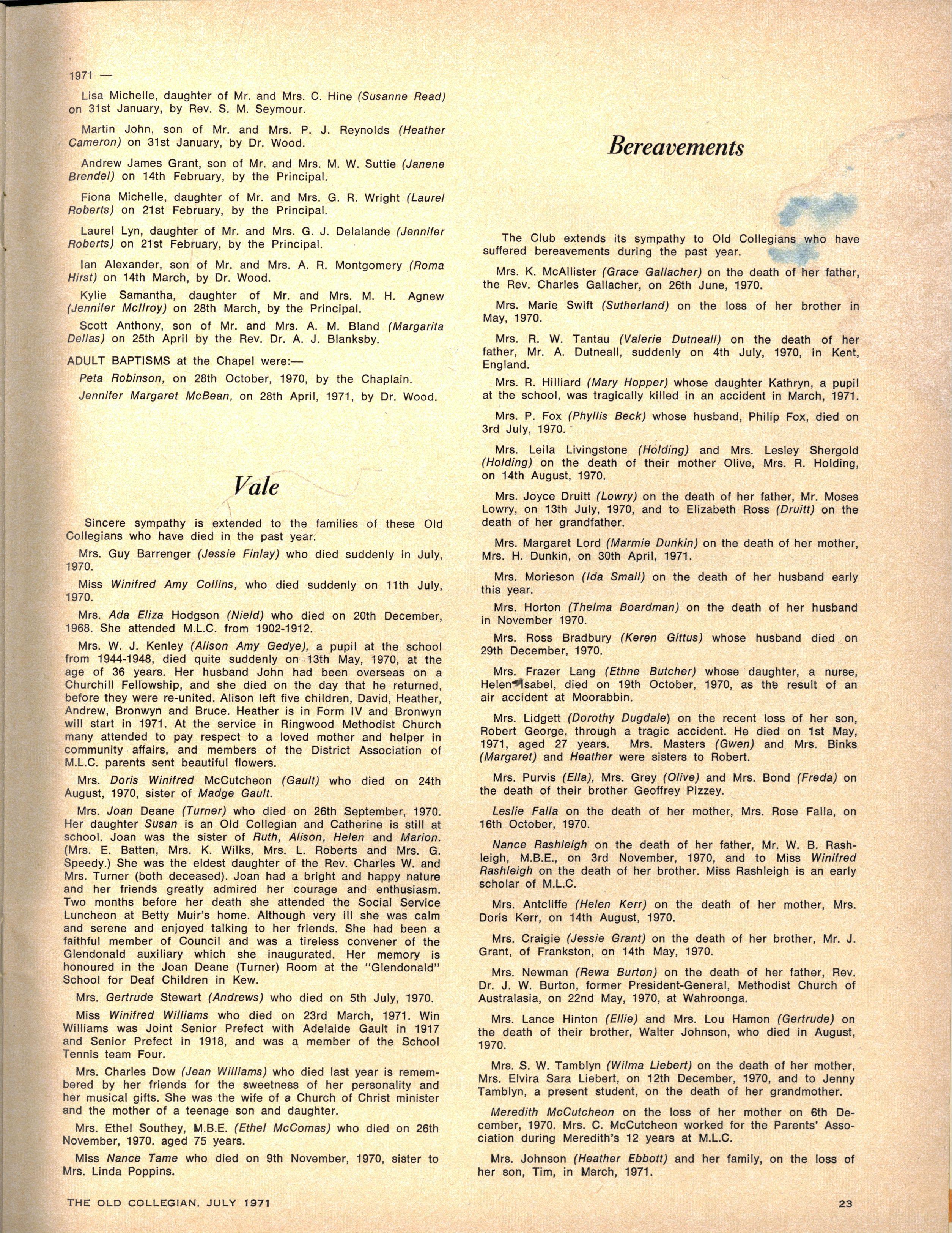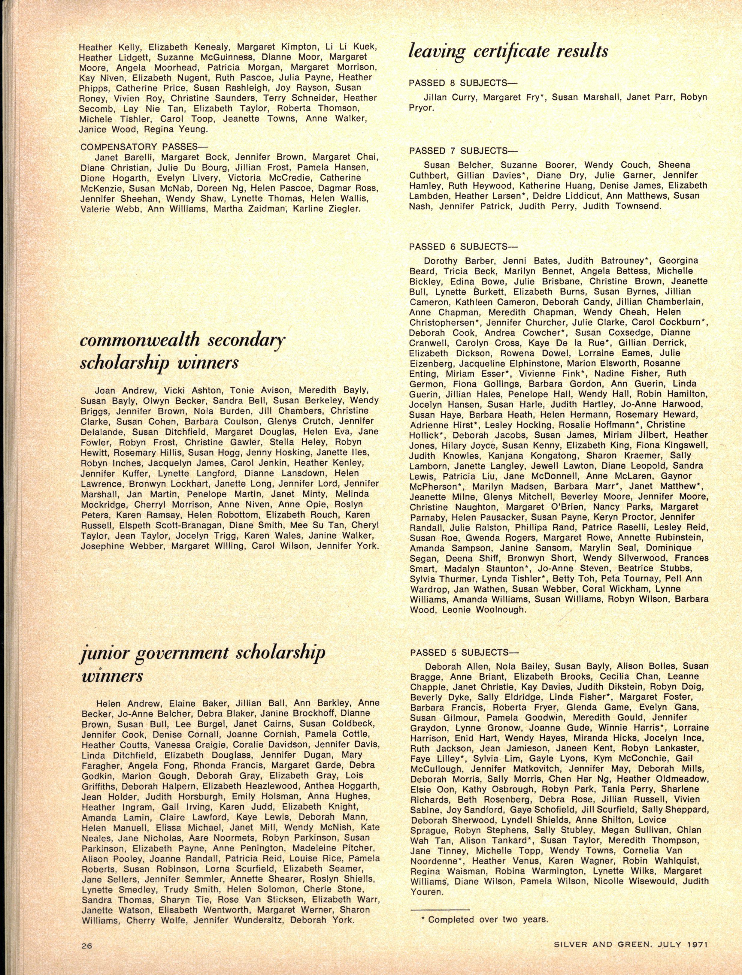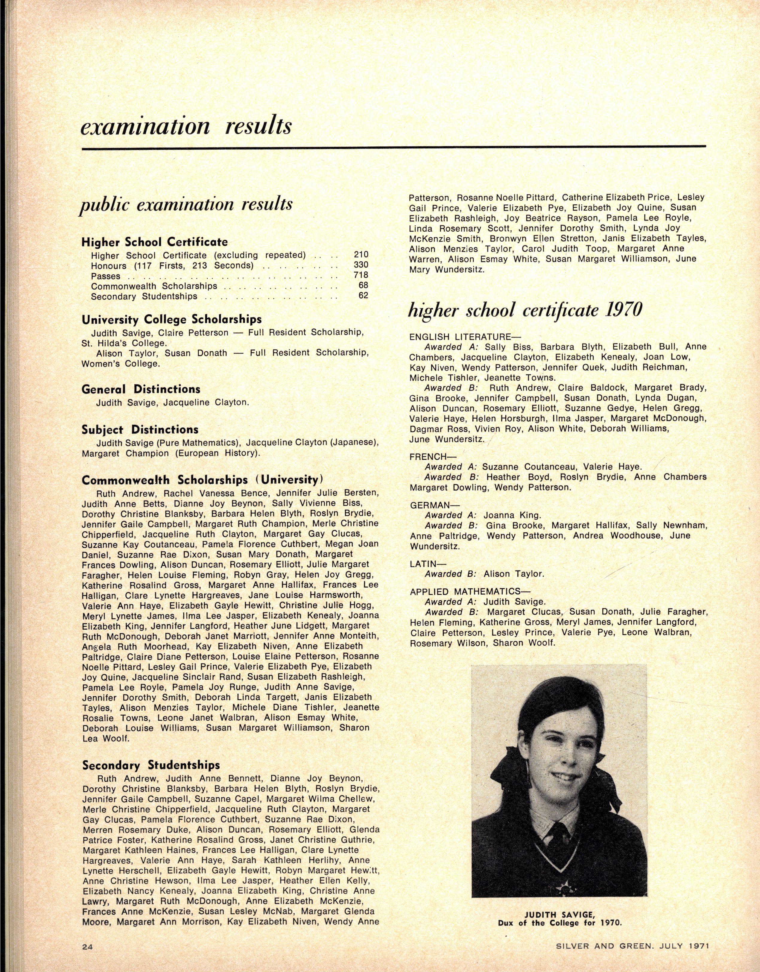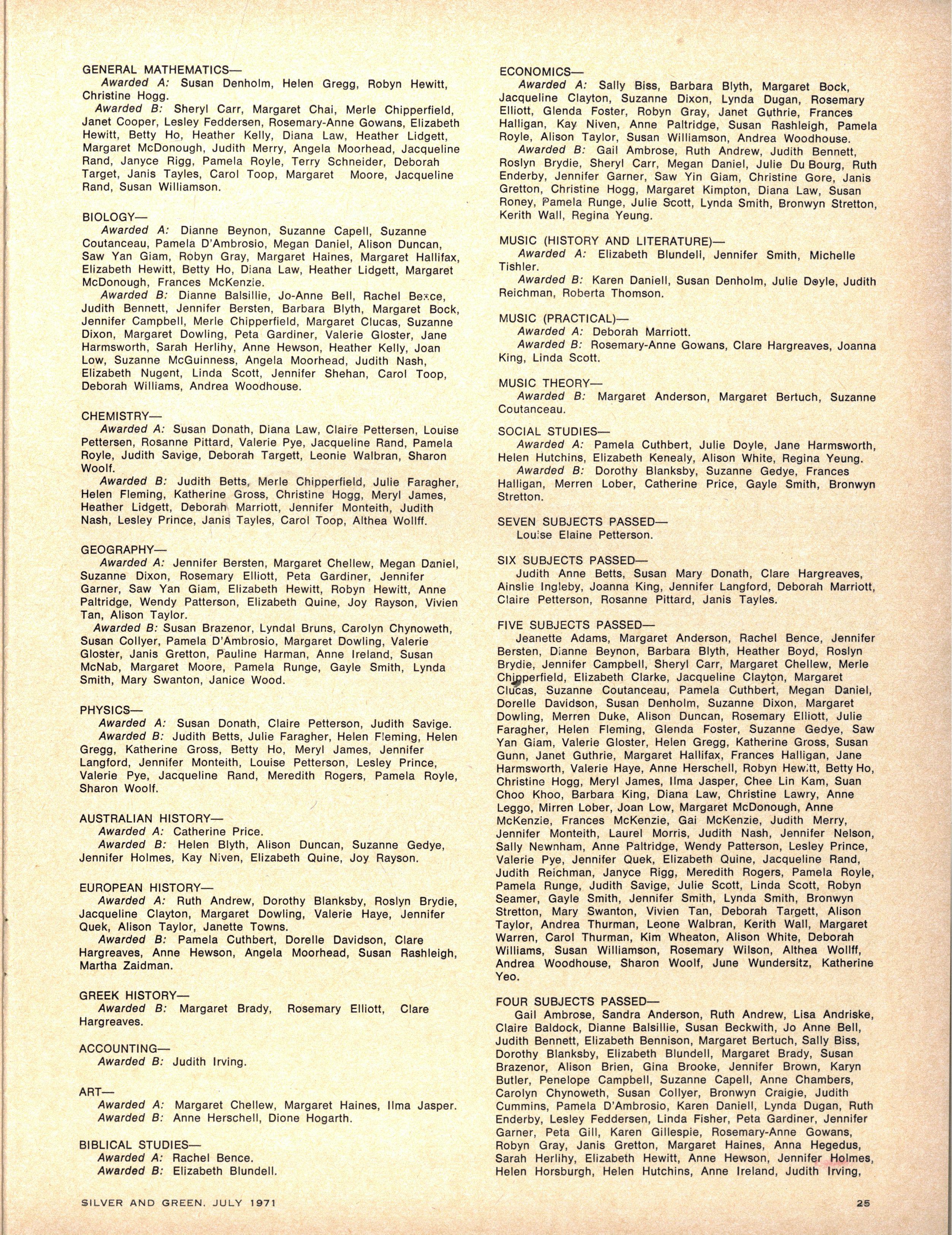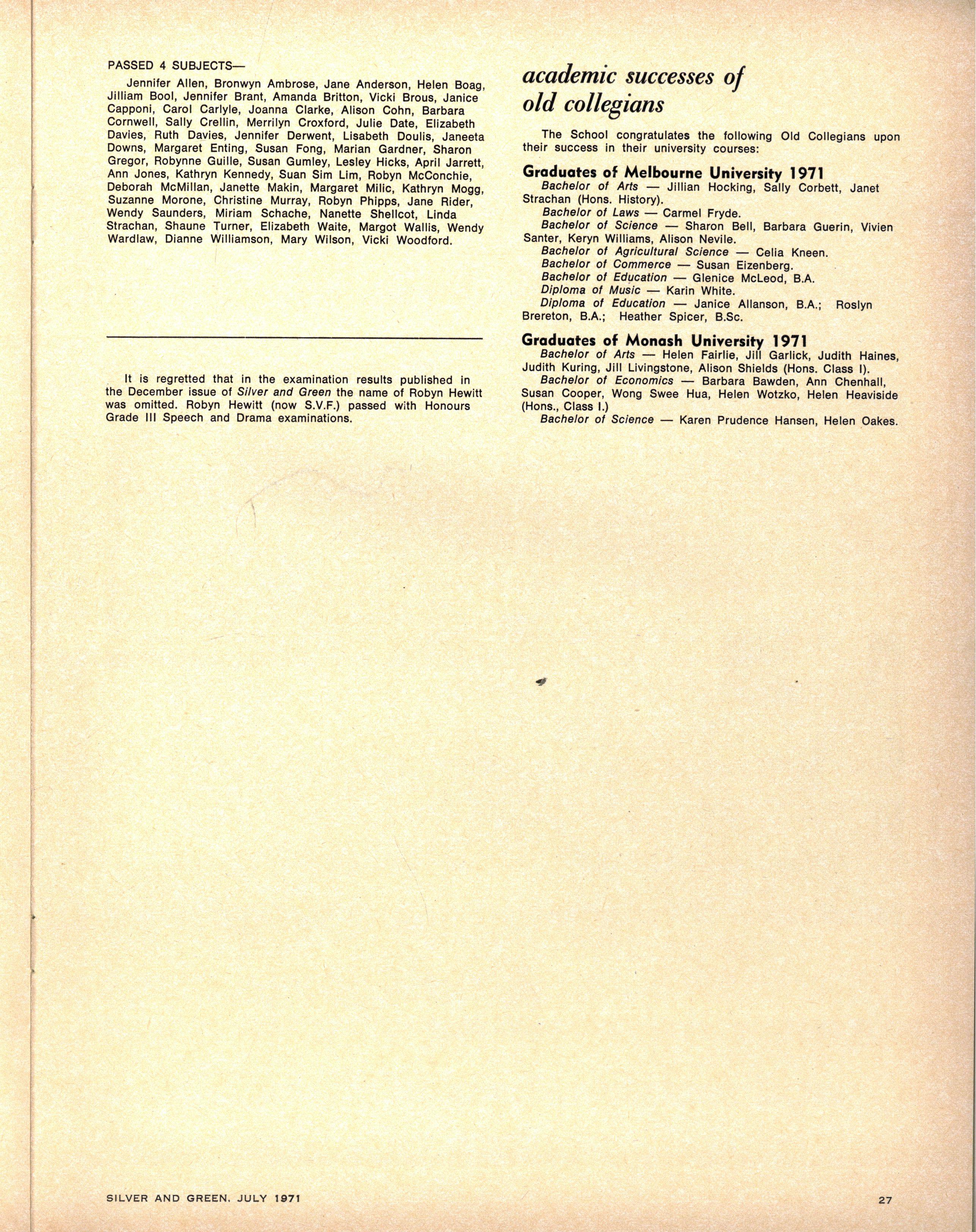 Janet Broadbent, 1970 Matriculation results omitted 1971 July