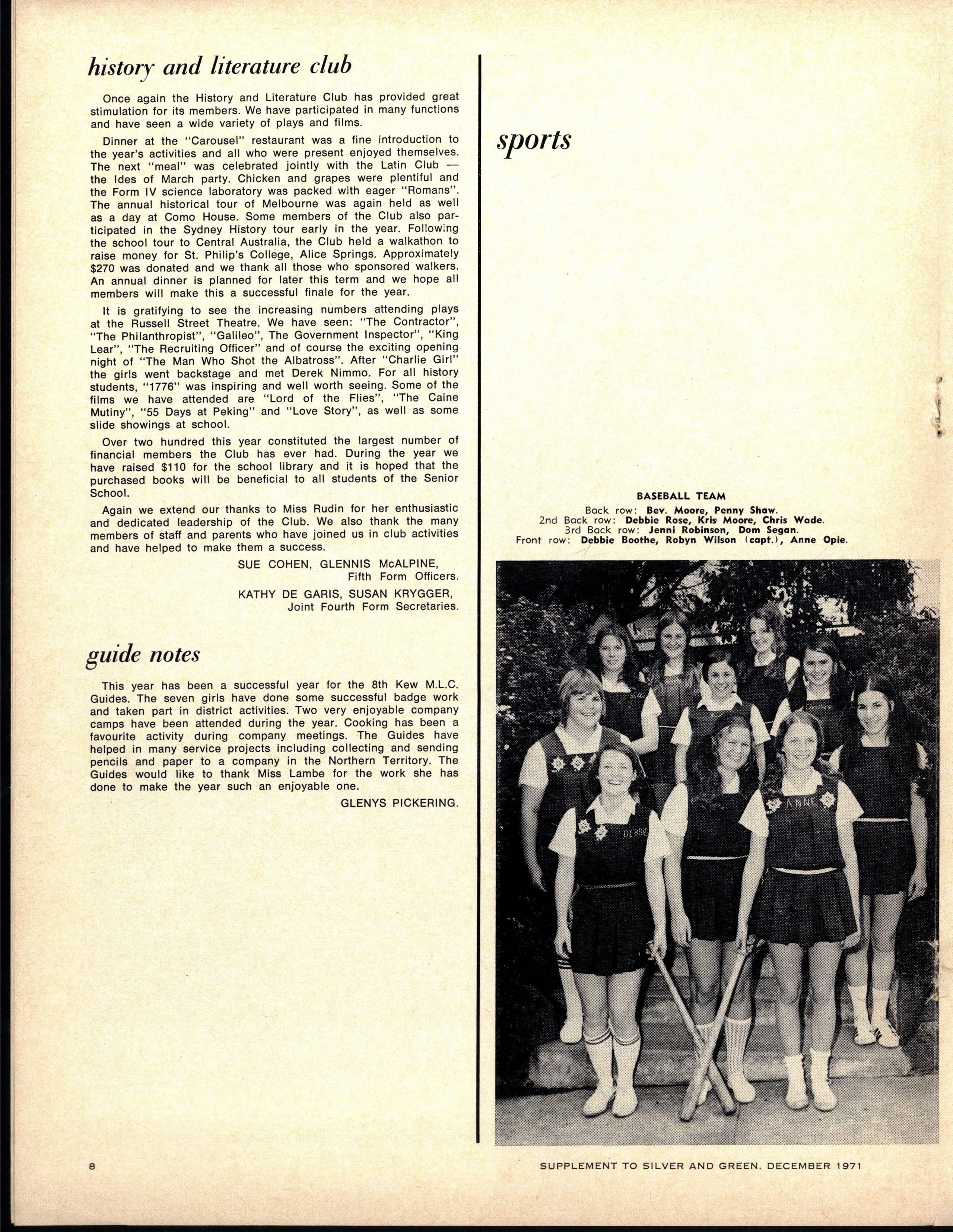 HISTOR Y AN D LITERATUR E CLUB : Mis s Rudin , S.V. Executive; Secretar y — Glenni s McAlpine; Join t Treasurer s — Susa n Cohen, Anne Niven- Committee — Stell a Heley, Elizabet h Kaminski , Judit h Lehrer , Anne Morton, Susa n Paterson , Ly n Sullivan , Elizabet h Lee s Lis a Wool f Carla Tishler Form IV Section: Join t Secretar y — Kathryn de Garis Susa n Krygger ; Executive — Susa n Quick, Hele n Vokach, Susa n Peel, Penelope Corr , Maxine Mayberry, Gillia n Briant , Kerri e Stokes , Jeanette Metzerling, Catherine Center Fion a Fouvy Cathy Mylrea
