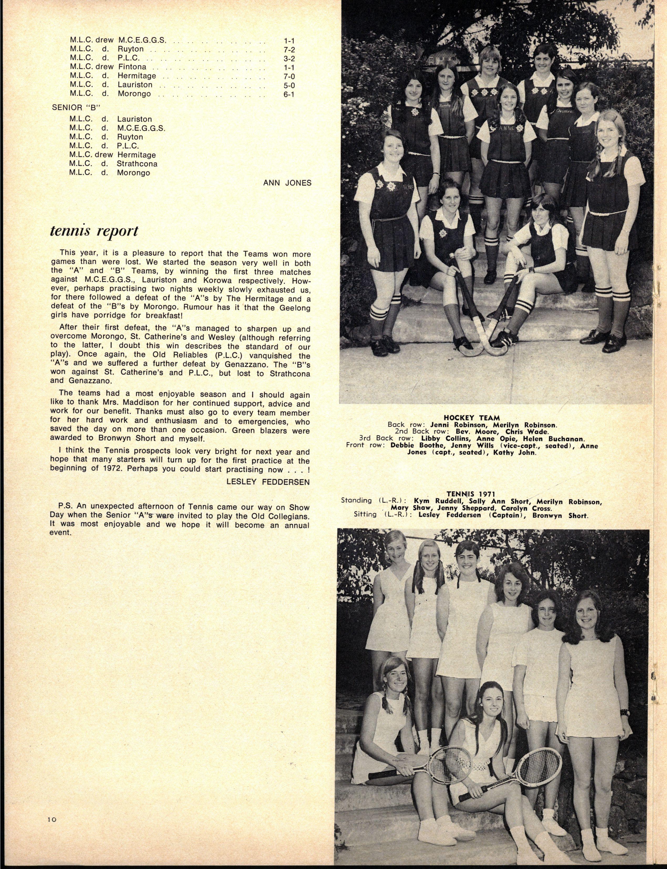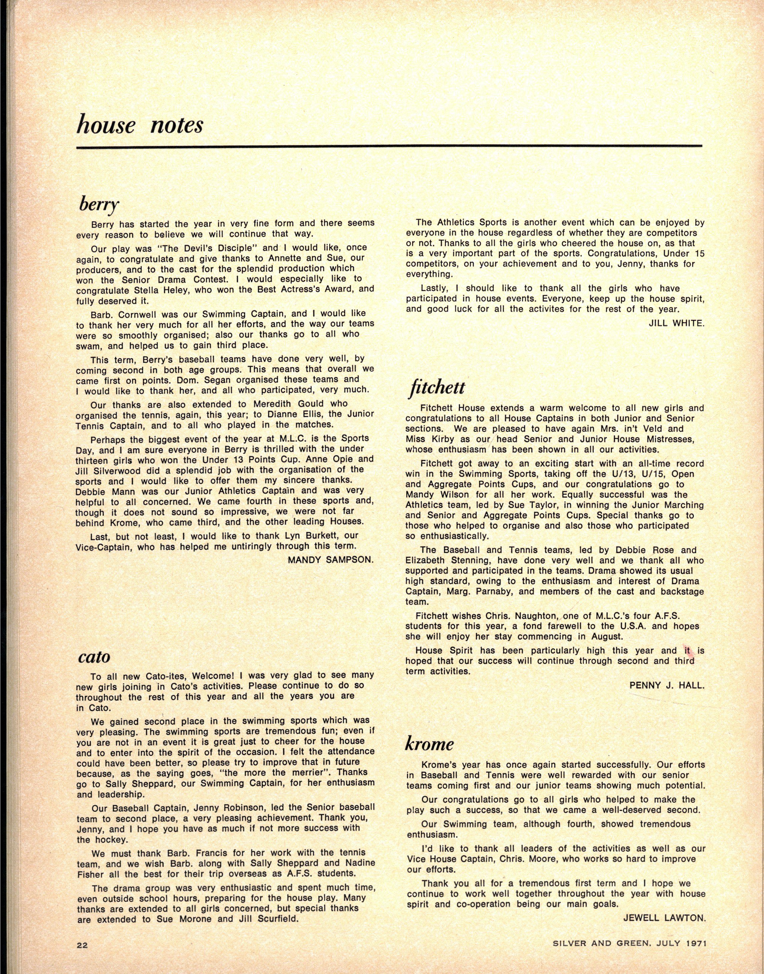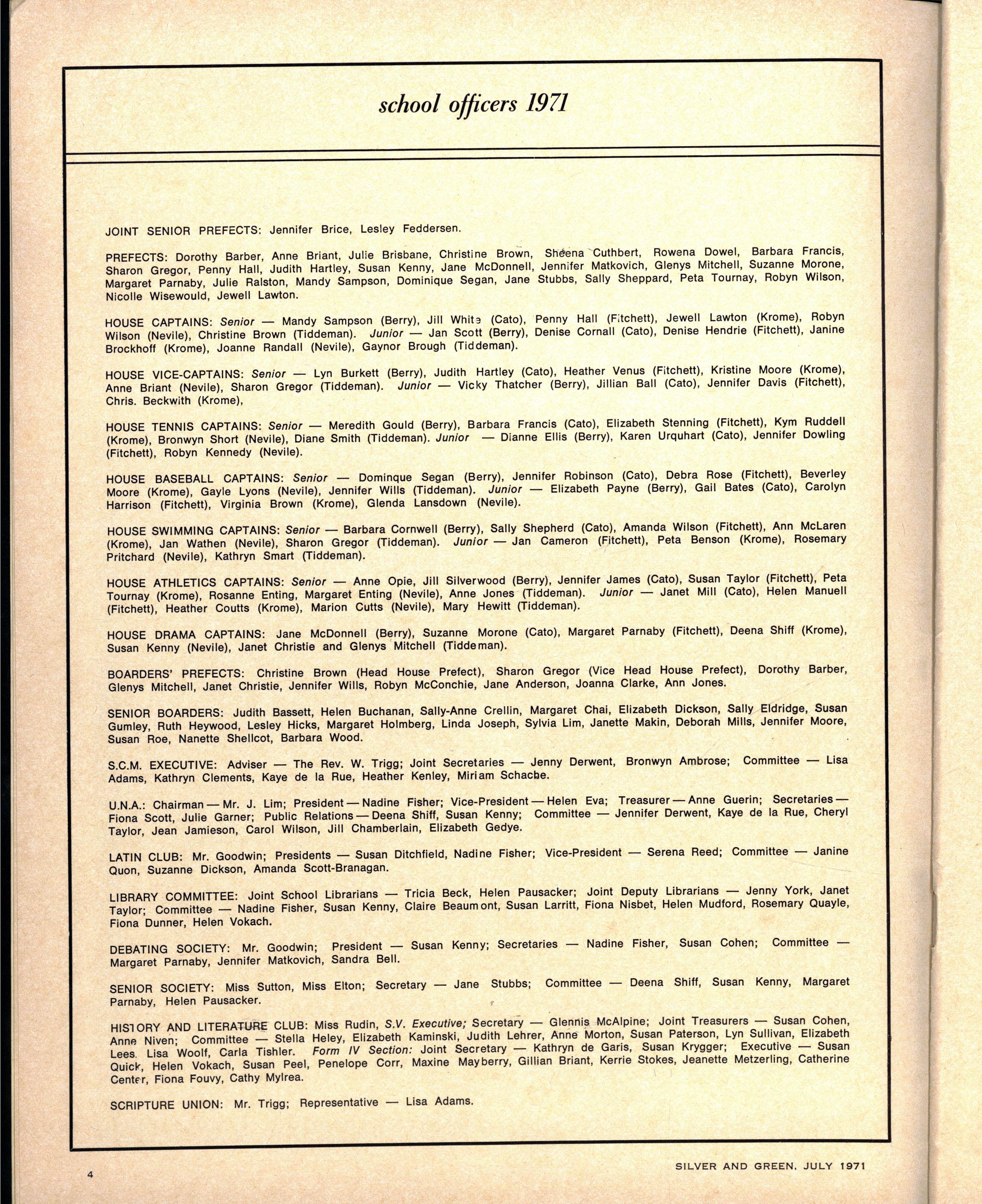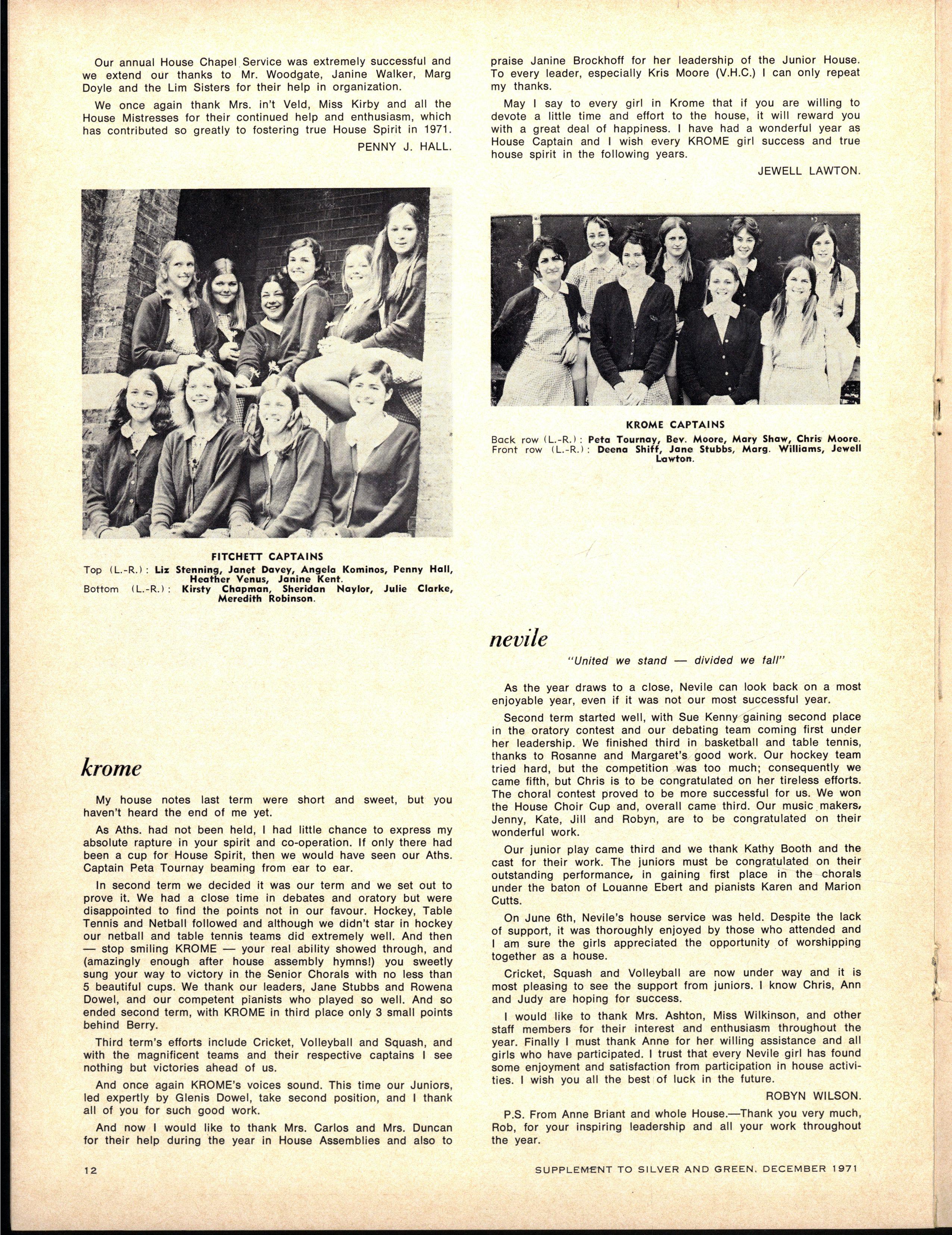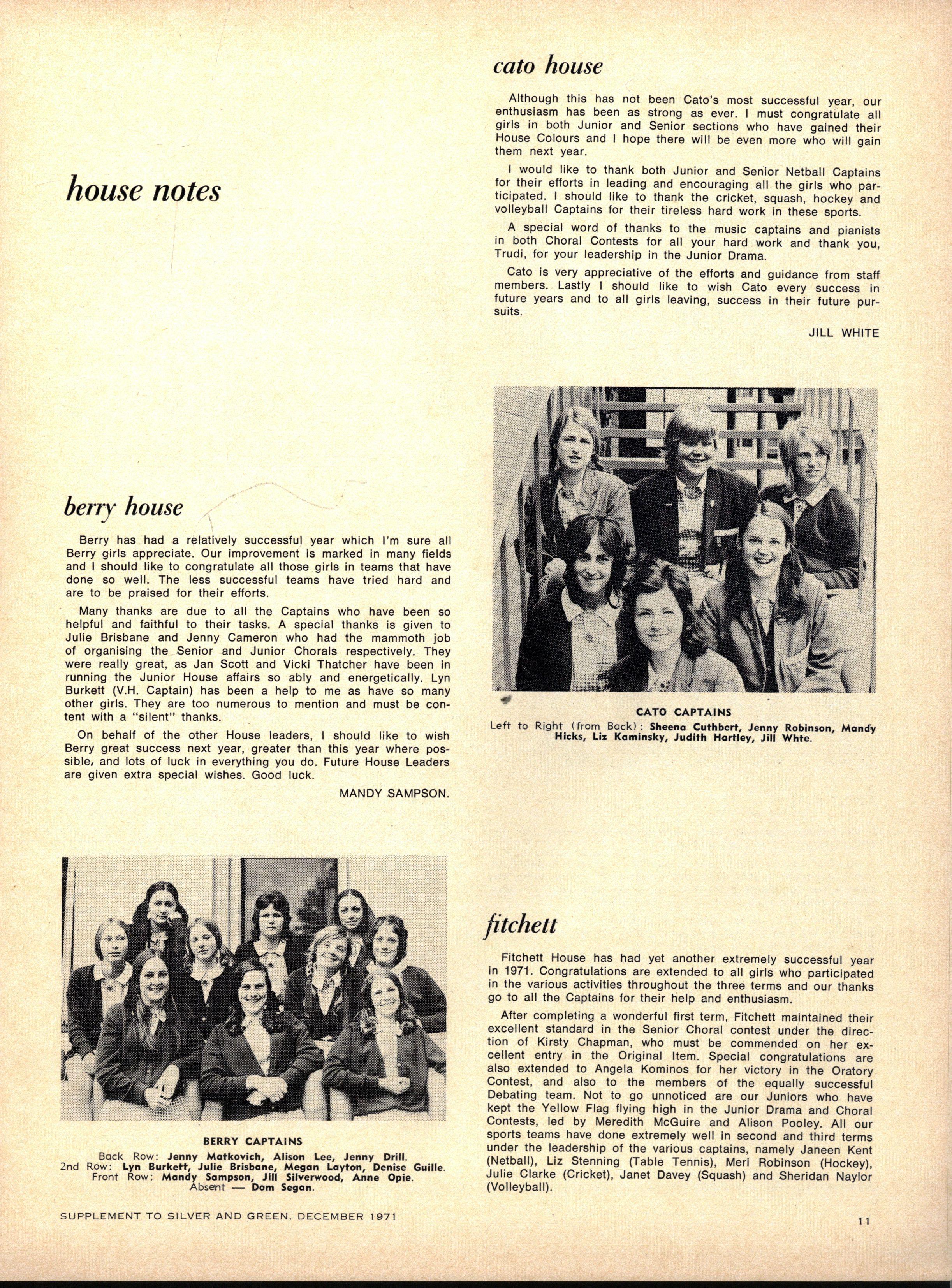 HOUS E CAPTAINS - Senior — Mandy Sampso n (Berry), Jil l Whit 3 (Cato), Penny Hal l (Fitchett), Jewel l Lawton (Krome), Robyn Wilso n (Nevile) Christin e Brow n (Tiddeman) Junior — Jan Scot t (Berry) Denis e Cornall (Cato) Denis e Hendrie (Fitchett) Janine Brockhof f (Krome), Joanne Randal (Nevile), Gaynor Broug h (Tiddeman)