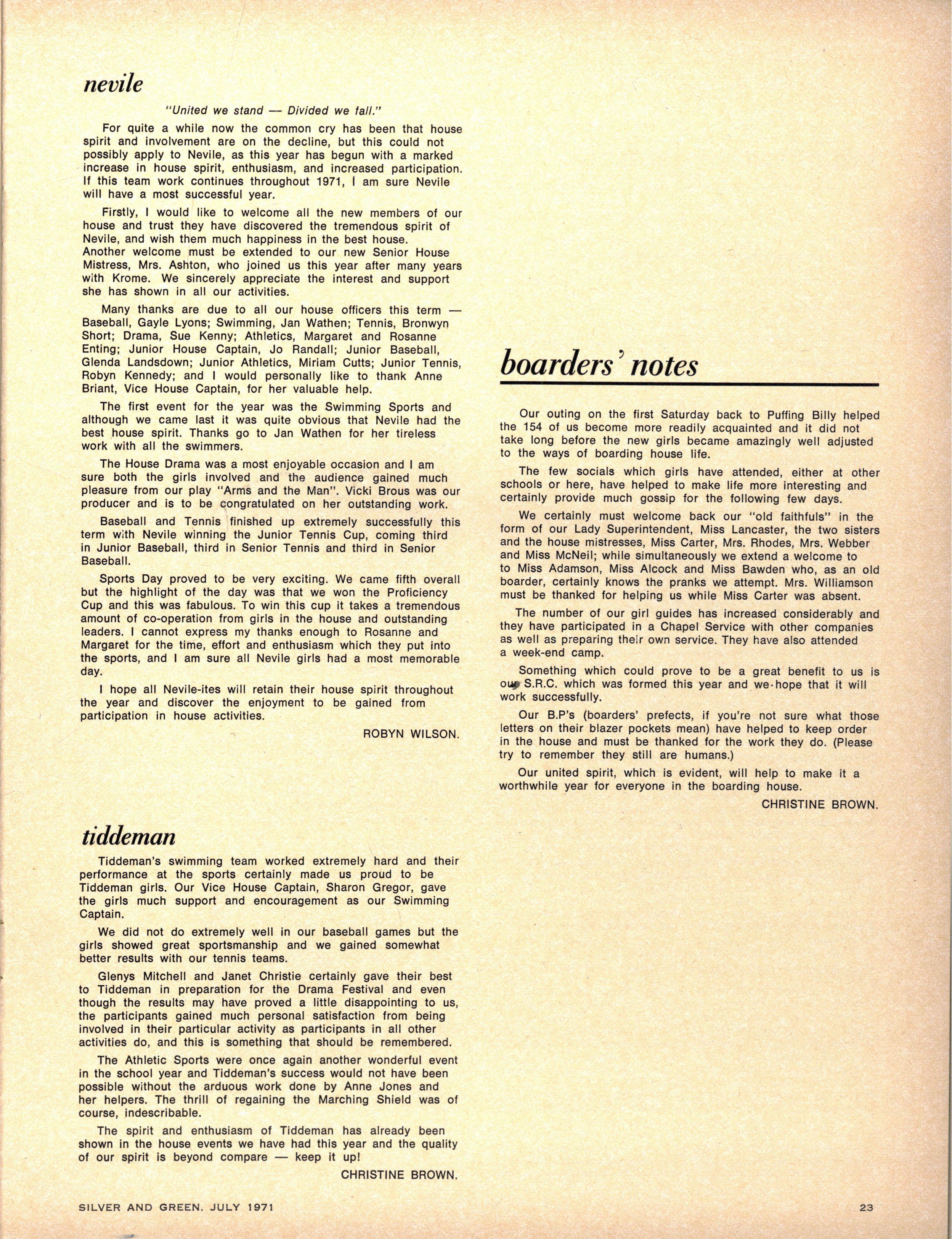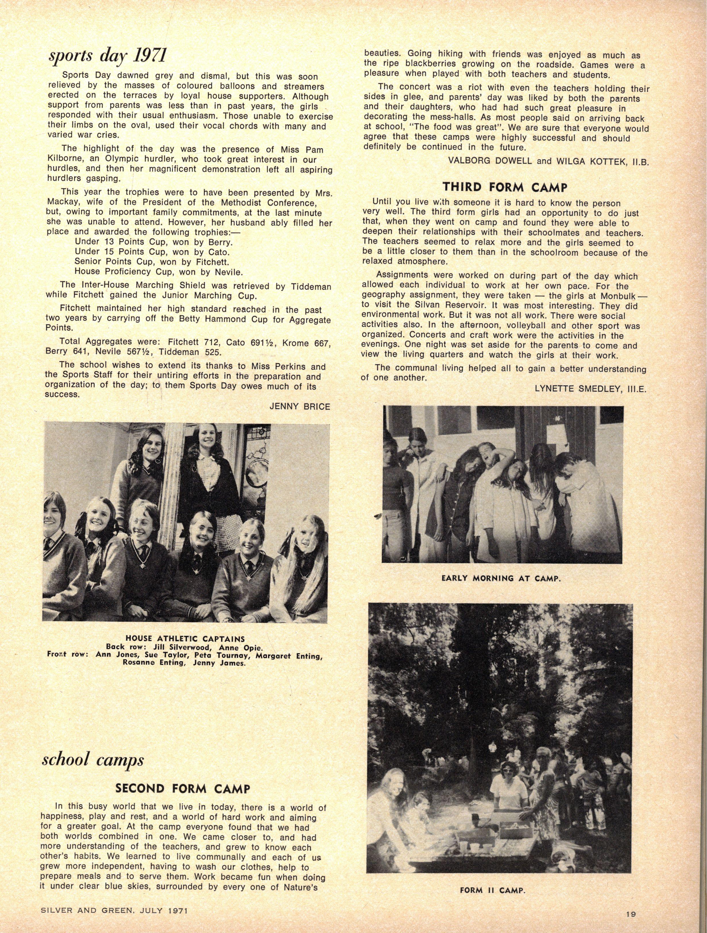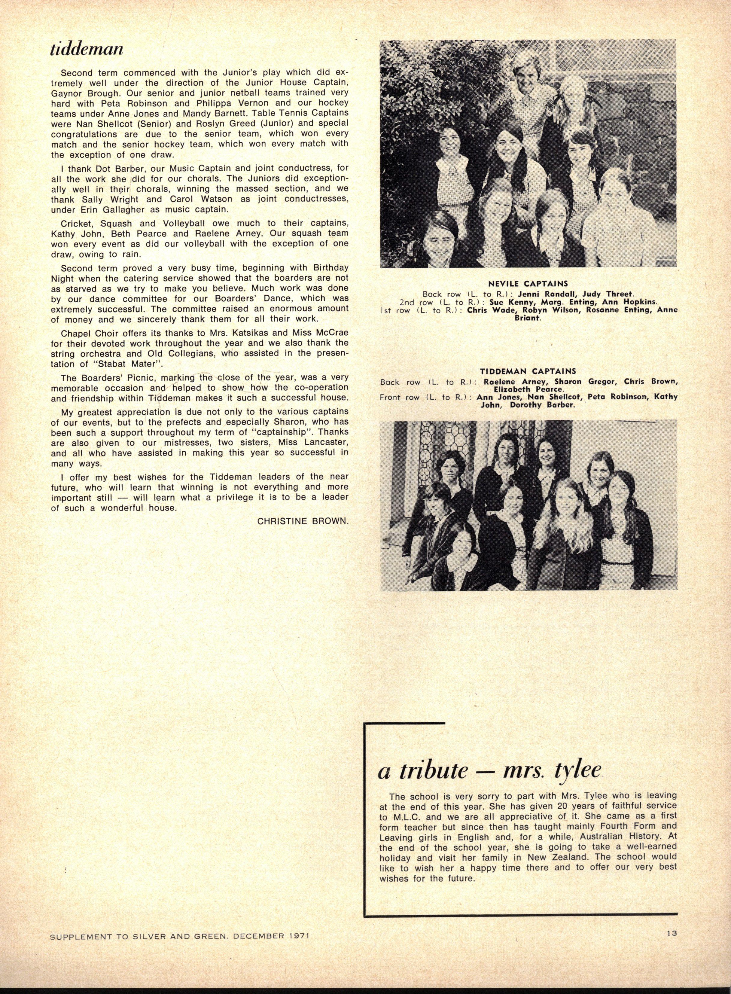 HOUS E ATHLETIC S CAPTAINS : Senior — Anne Opie Jil l Silverwoo d (Berry) Jennife r Jame s (Cato) Susa n Taylo r (Fitchett) Peta Tourna y (Krome) Rosann e Enting Margaret Entin g (Nevile) Anne Jone s (Tiddeman) Junior — Janet Mil (Cato) Helen Manuell (Fitchett) Heather Coutts (Krome) Marion Cutts (Nevile) Mary Hewitt (Tiddeman)