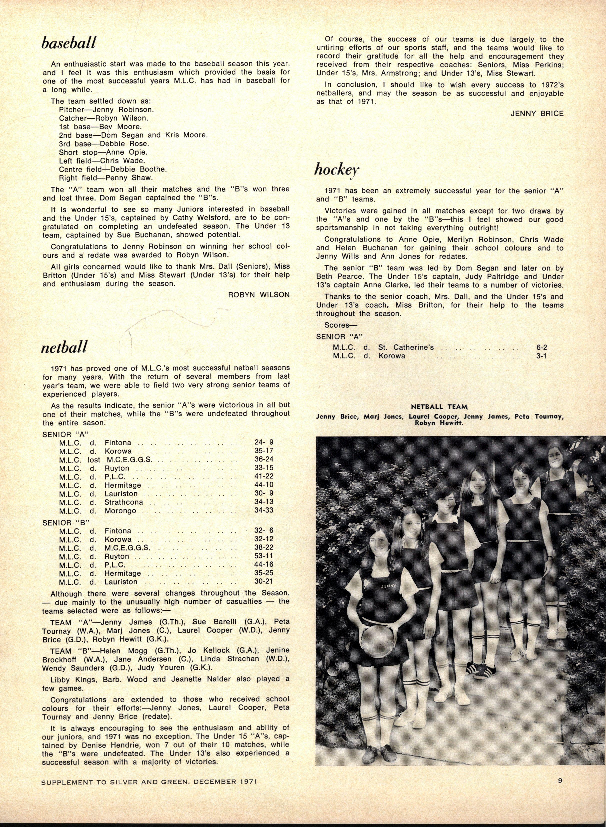 HOUS E BASEBAL L CAPTAINS : Senior — Dominque Segan (Berry) Jennife r Robinso n (Cato) Debra Ros e (Fitchett) Beverley Moore (Krome) Gayle Lyon s (Nevile) Jennife r Will s (Tiddeman) Junior — Elizabeth Payne (Berry) Gail Bates (Cato) Carolyn Harriso n (Fitchett) Virgini a Brow n (Krome) Glenda Lansdow n (Nevile)