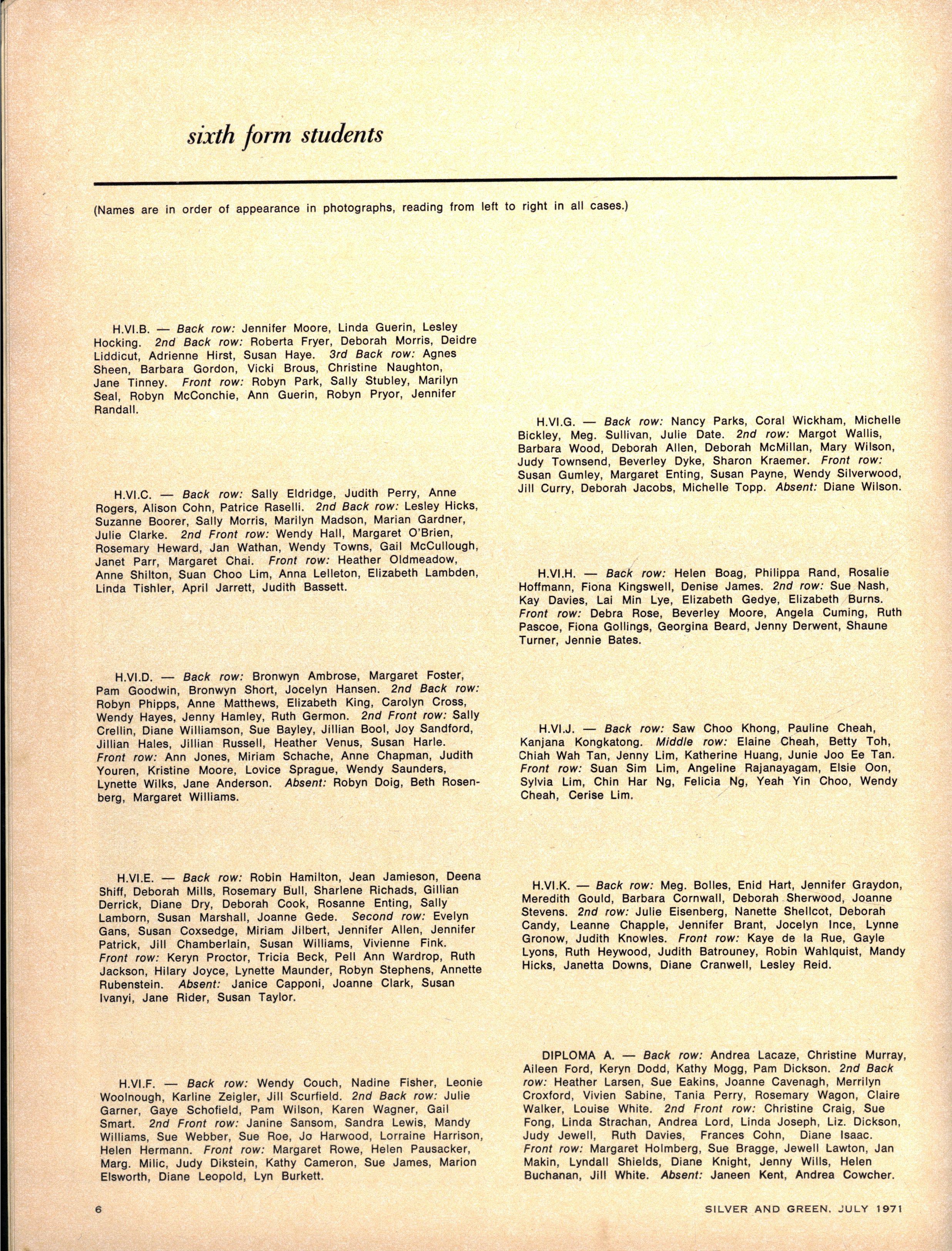 H.VI.E — Back row: Robi n Hamilton Jean Jamieson Deena Shift, Deborah Mills , Rosemar y Bull , Sharlen e Richads , Gillian Derrick Diane Dry Deborah Cook Rosann e Enting Sall y Lamborn, Susa n Marshall , Joanne Gede Second row: Evely n Gans Susa n Coxsedge Miriam Jilbert Jennife r Allen Jennife r Patrick, Jil l Chamberlain, Susa n Williams , Vivienne Fink Front row: Kery n Proctor Trici a Beck Pel l Ann Wardrop Ruth Jackson, Hilar y Joyce, Lynette Maunder, Robyn Stephens , Annette Rubenstein Absent: Janice Capponi Joanne Clark Susa n Ivanyi, Jane Rider , Susa n Taylor