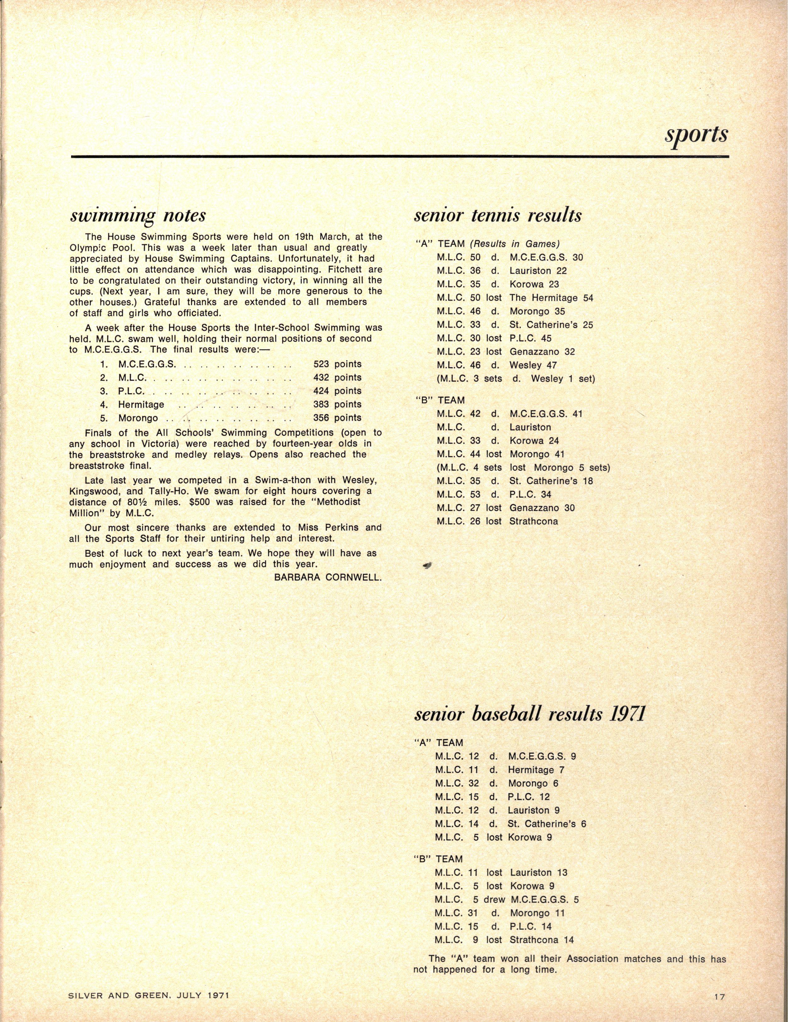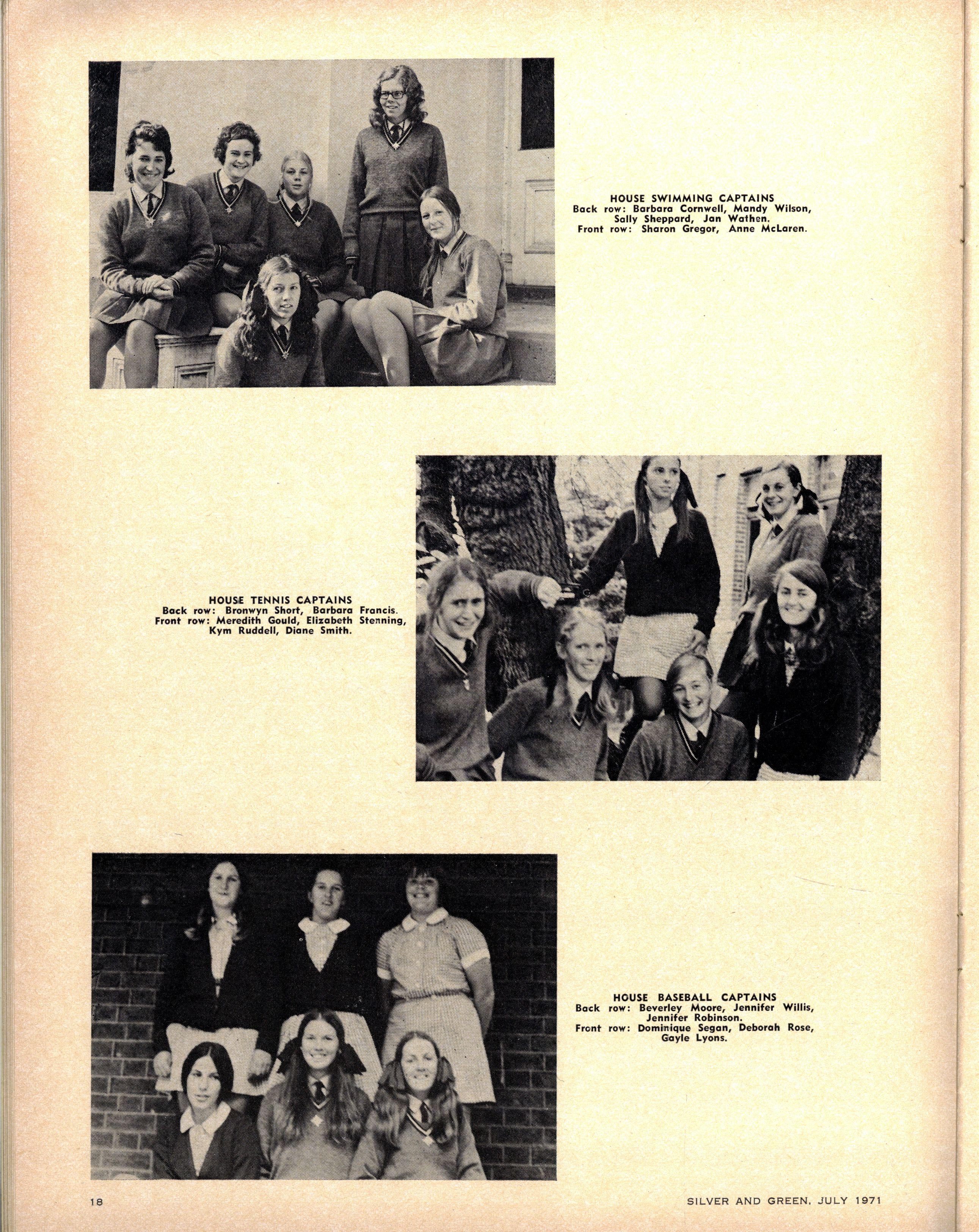 HOUS E SWIMMIN G CAPTAINS : Senior — Barbar a Cornwel (Berry) , Sall y Shepher d (Cato), Amanda Wilso n (Fitchett), Ann McLaren (Krome) Jan Wathen (Nevile) Sharo n Gregor (Tiddeman) Junior — Jan Cameron (Fitchett) Peta Benso n (Krome) Rosemar y Pritchard (Nevile), Kathry n Smar t (Tiddeman)