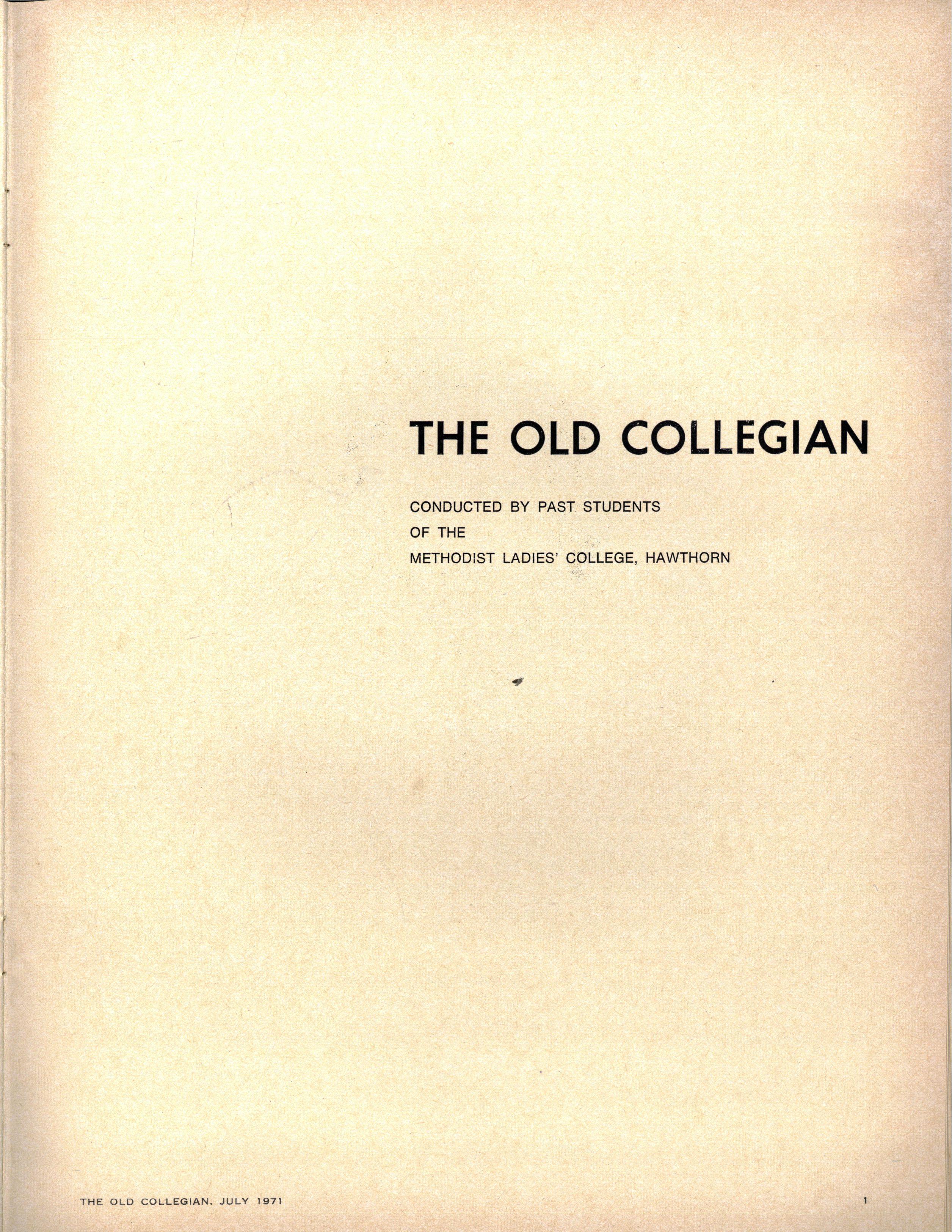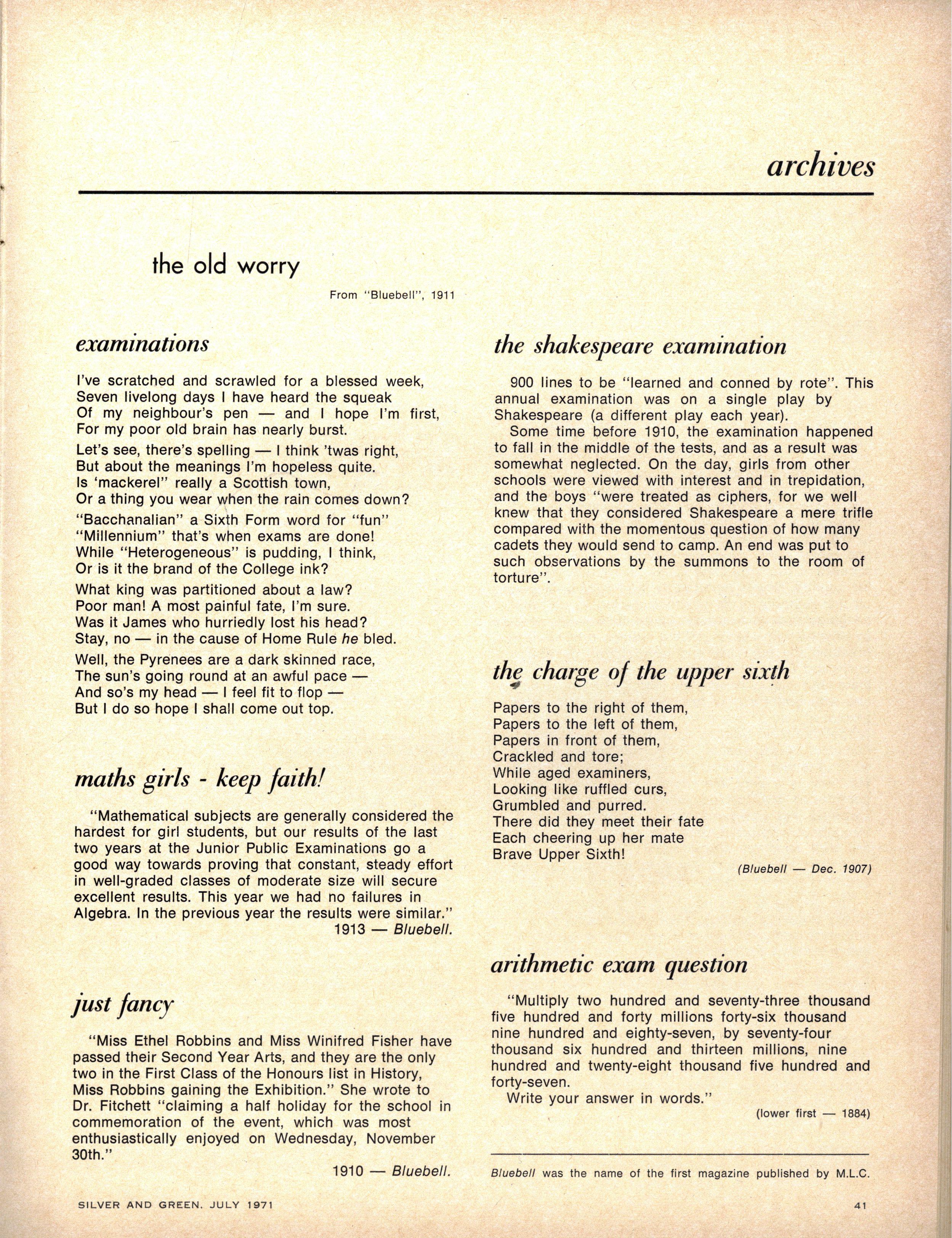 This problem becomes more acute in the face of population increase, and thus in a school the size of M.L.C. cannot be regarded as a minor one The means by which one expresses oneself is unimportant, but it is important that this capacity is responsibly and wisely developed while one is still at school so that, confronted with the freedom of adult life, one's vital need for self expression can be fulfilled
