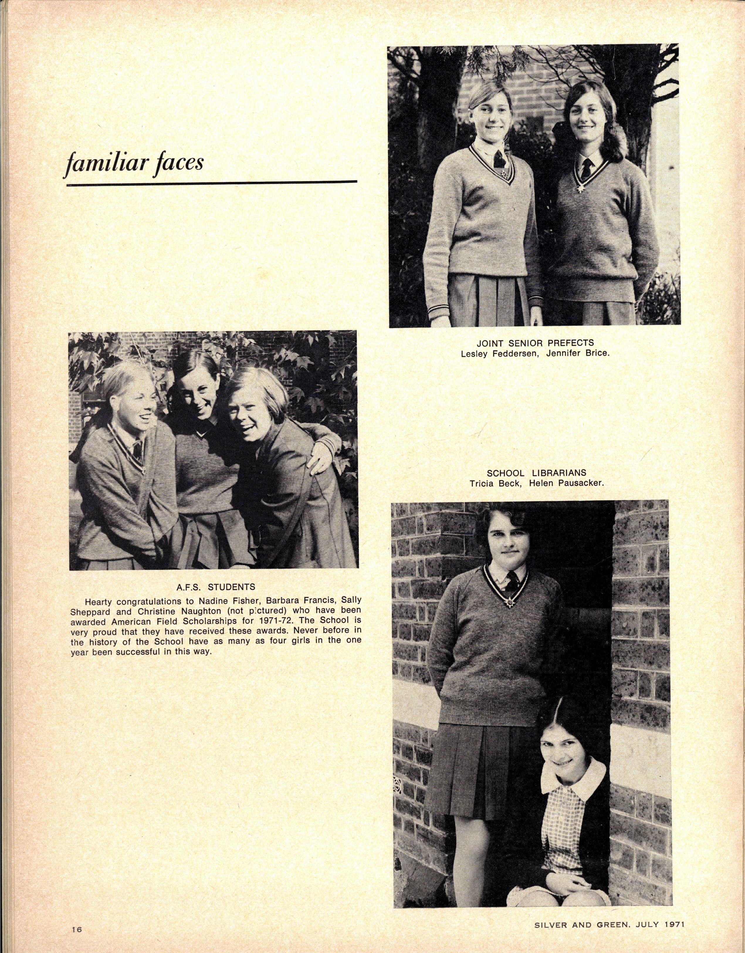 BOARDERS PREFECTS : Christin e Brow n (Head Hous e Prefect), Sharo n Gregor (Vice Head Hous e Prefect), Dorothy Barber , Glenys Mitchell, Janet Christie , Jennife r Wills , Robyn McConchie, Jane Anderson , Joanna Clarke, Ann Jones