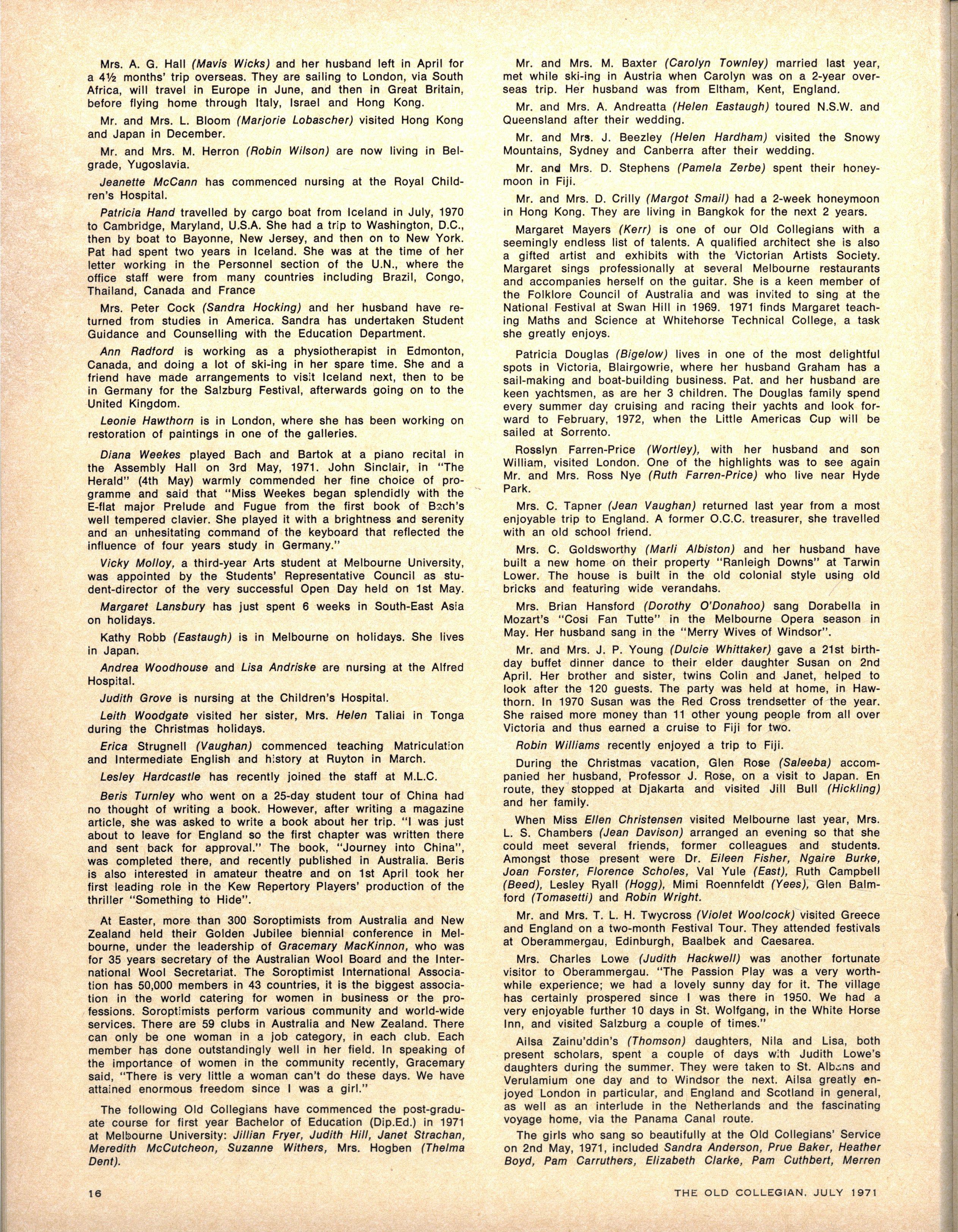 Som e of the young Old Collegians had a chance to wor k with our new grand piano during Apri l when they came from all points of the compass to weekl y rehearsal s n preparation for the Old Collegians' Club Annual Church Service Th e "old " girl s had a marvellou s time exchanging gossi p and singing
