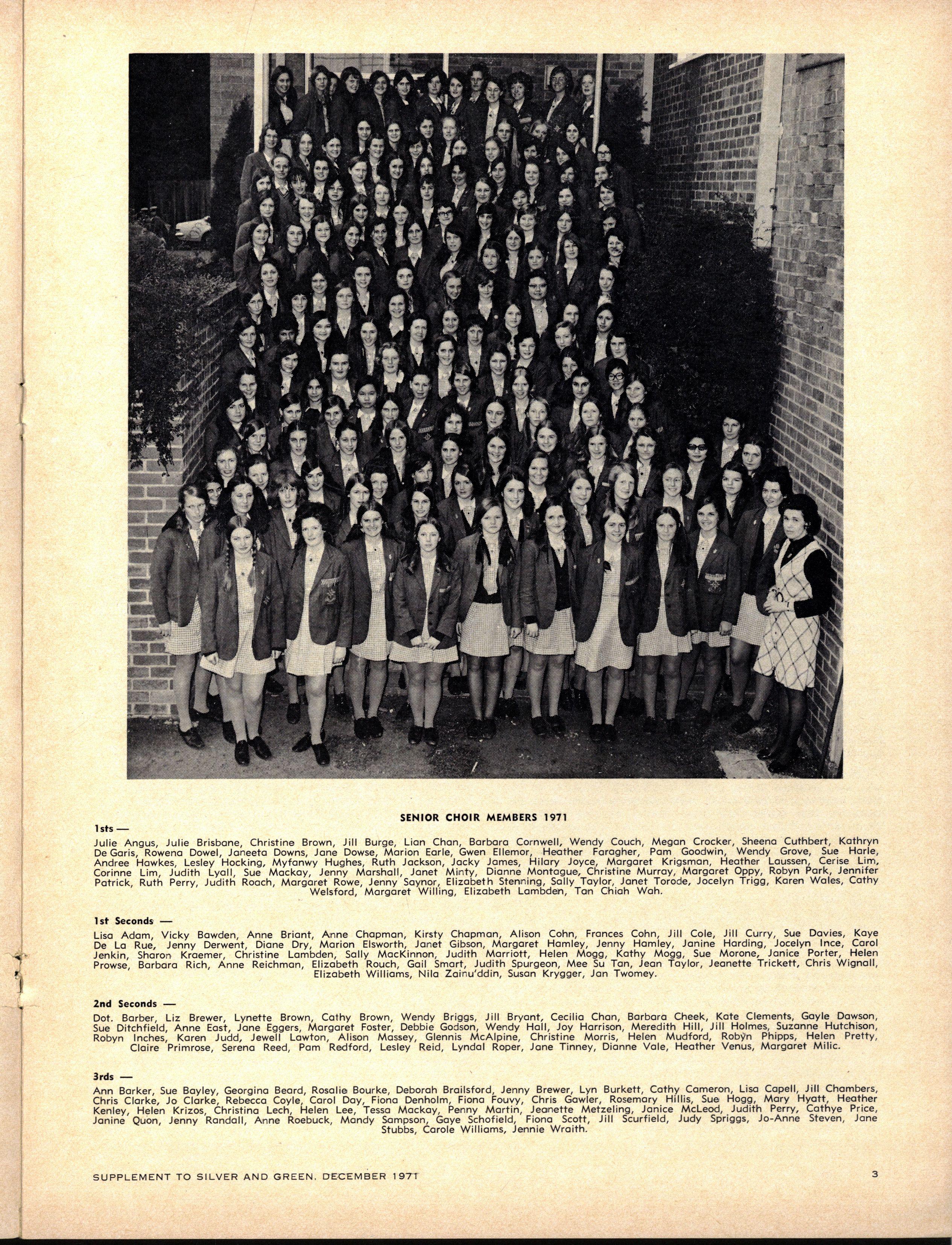 Followin g a "Revie w of 1970 " by the Senio r Prefect Robyn Hewitt, and the Vice Senio r Prefect, Su e Gedye, the Senio r Madrigal Group led by Anne Leggo and Robyn Smith performed highly sensitiv e interpretations of two sixteenth-century madrigals by T Morley, including hi s classi c "Ho , Wh o Comes Here"