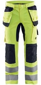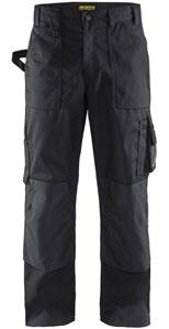TOIMINNALLISUUS: Verkkokangas polvitaipeissa, Neljään suuntaan joustava stretch YKSITYISKOHDAT: Muovivetoketjulla suljettava sepalus, Sivuilla kaksi napillista lenkkiä vasaranpidikettä varten, Leveät vyölenkit takana ja sivuilla, Metalliset napit, Napillinen puukkopidike, D-rengas vyötäröllä, Lahkeissa kolminkertaiset sisäsaumat, Irrotettava ID-henkilökorttitasku, D-rengas TASKUT: Paljetakataskut, Tarralla suljettava läpällinen paljereisitasku ja verkkokankainen puhelintasku sisäpuolella, Vetoketjullinen reisitasku, Sivutaskut, Polvisuojataskut, Riipputaskut - erikoisleveät, joissa työkalulenkit ja lisälokerot työkaluille, Vahvistettu mittatasku, jossa puukkopidike ja kynätasku VAHVIKE: CORDURA®-stretch-vahvistetut polvisuojataskut, Vahvistetut riipputaskut, lastatasku, takataskut ja lahkeensuiden takaosat HEIJASTIN: Heijastin yksityiskohta pohkeessa, Heijastavia yksityiskohtia reisitaskussa LISÄOMINAISUUDET: Lahkeensuut vahvistettu takaosasta SERTIFIOINTI: EN 14404:2004+A1:2010 yhdessä polvisuojien 4027, 4057, 4058 ja 4032 kanssa, Oeko-Tex std 100, SE 23-302, RISE