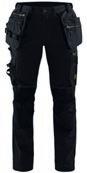 TOIMINNALLISUUS: Neljään suuntaan joustava stretch YKSITYISKOHDAT: Muovivetoketjulla suljettava sepalus, Sivuilla kaksi napillista lenkkiä vasaranpidikettä varten, Leveät vyölenkit takana ja sivuilla, Metalliset napit, Napillinen puukkopidike, D-rengas vyötäröllä, Lahkeissa kolminkertaiset sisäsaumat, Irrotettava ID-henkilökorttitasku, D-rengas TASKUT: Paljetakataskut, Tarralla suljettava läpällinen paljereisitasku ja verkkokankainen puhelintasku sisäpuolella, Vetoketjullinen reisitasku, Sivutaskut, Riipputaskut - erikoisleveät, joissa työkalulenkit ja lisälokerot työkaluille, Vahvistettu mittatasku, jossa puukkopidike ja kynätasku VAHVIKE: Vahvistettu mittatasku, riipputaskut ja takataskut HEIJASTIN: Heijastavia yksityiskohtia reisitaskussa SERTIFIOINTI: Oeko-Tex std 100, SE 23-302, RISE