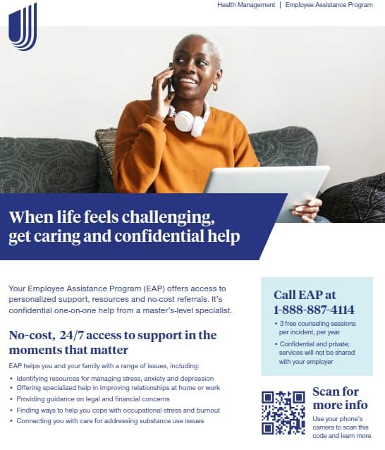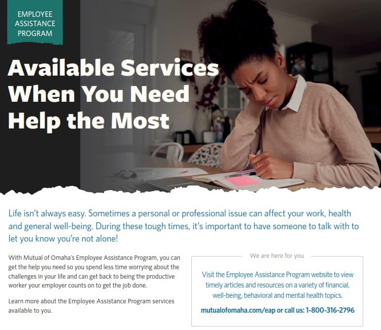 If you are enrolled in a plan with either United Healthcare or Mutual of Omaha, this coverage is available with either (or both!) The EAP is a valuable resource that can help you identify and resolve many workplace, family, social, economic, and mental health issues.