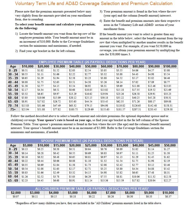 • Dependent children: Birth to age 19 (or 26 if a full-time student): $1,000 increments up to $10,000; minimum $2,000; guarantee issue: 100% of employee’s benefit.