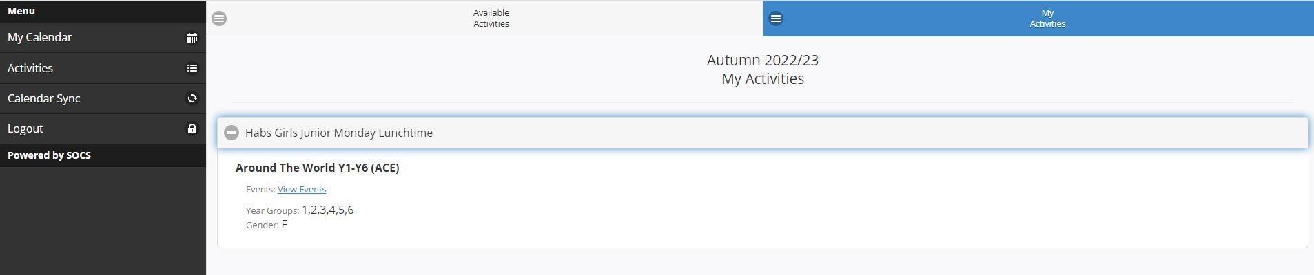 Once selected, pupils can view their lunchtime co-curricular choices using SOCS.
