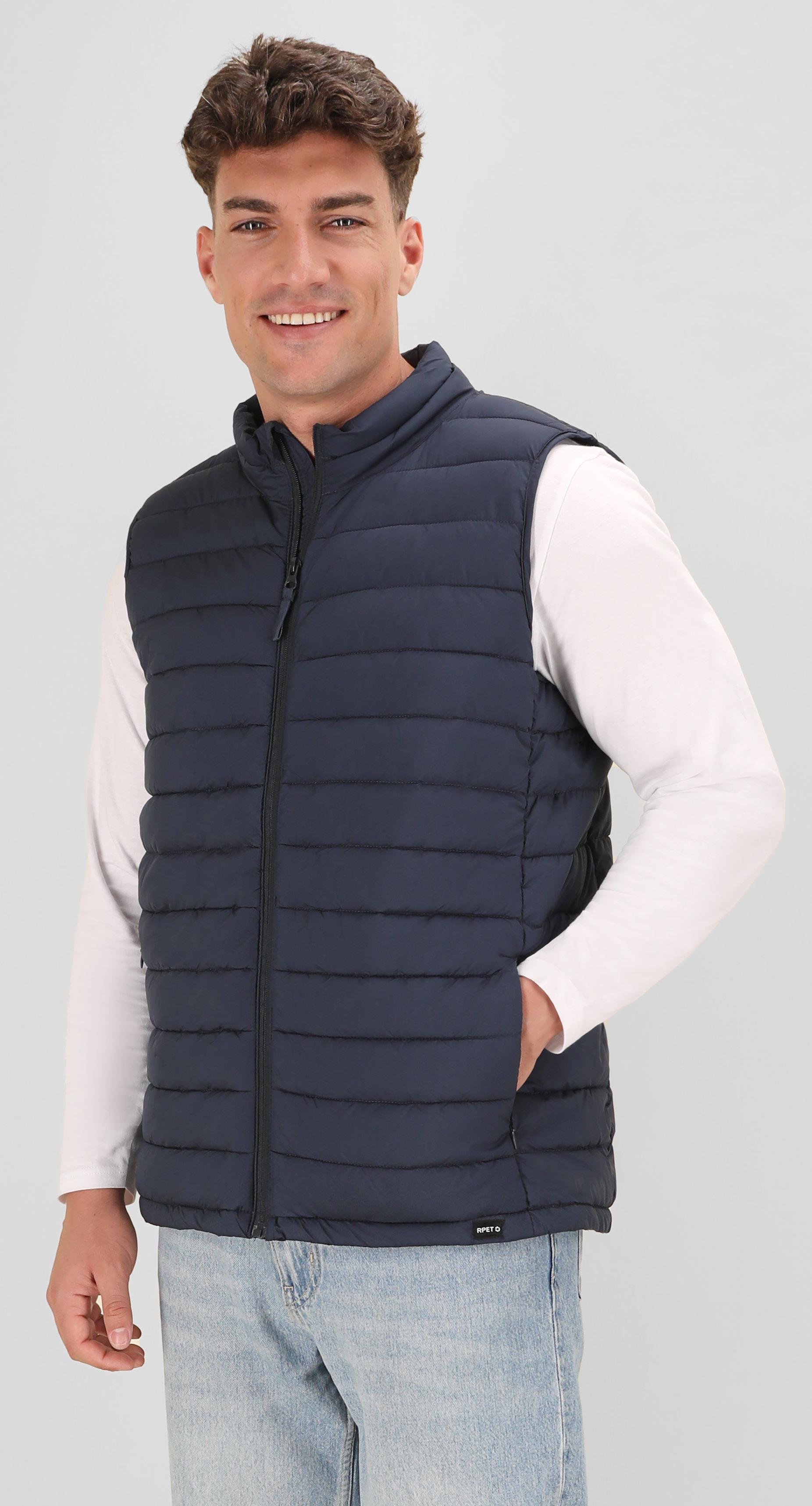 Vest. 100% Polyester RPET. Wind and Water Resistant. Polyester RPET Pouch. Weste. 100% Polyester RPET. Beständig Gegen Wind und Wasser. Polyester RPET Etui. Gilet. 100% Polyester RPET. Résistant au Vent et à l’Eau. Étui Polyester RPET. Vest. 100% Polyester RPET. Bestand Tegen Wind en Water. Polyester RPET Zakje.