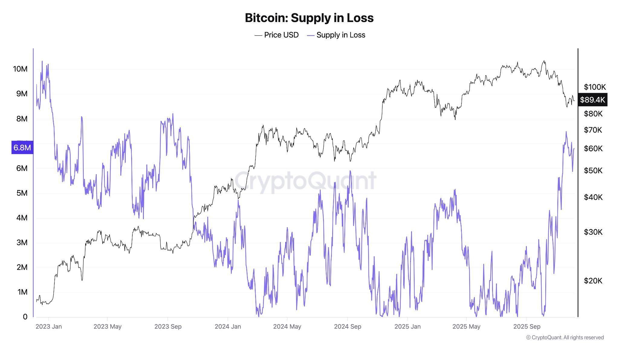 Building on this structural perspective, it is useful to examine the behaviour of buyersthroughthelensofTotalSupplyinLoss,ametricwhichgaugestheextentof unrealised pain across the market. The seven-day Simple Moving Average of this measure rose to 7.1 million BTC last week, the highest reading since September 2023,indicatingthattheaggregateprofitaccumulatedacrossmorethantwoyears ofbull-marketpriceappreciationhavebeencompletelyundonebywhathasbeena relativelyshallowpullbackincomparisontopastcycles.SeeFigure1below)