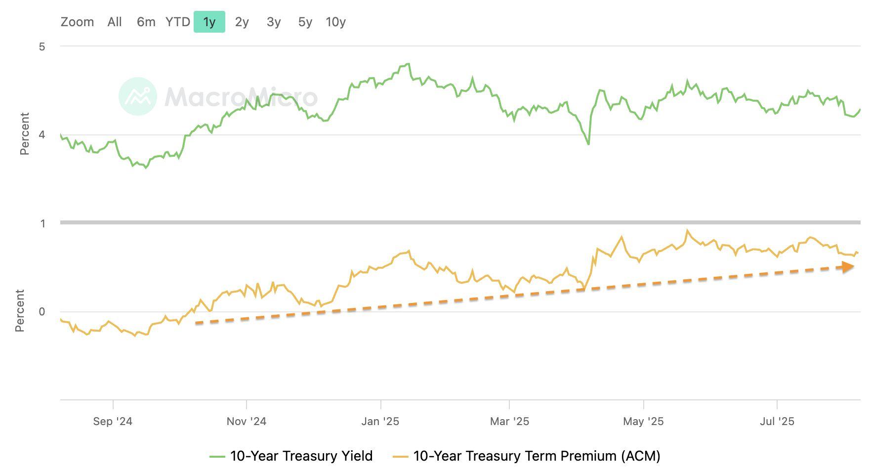 圖8.10 年期美債殖利率與期限溢價(資料來源:Macromicro)