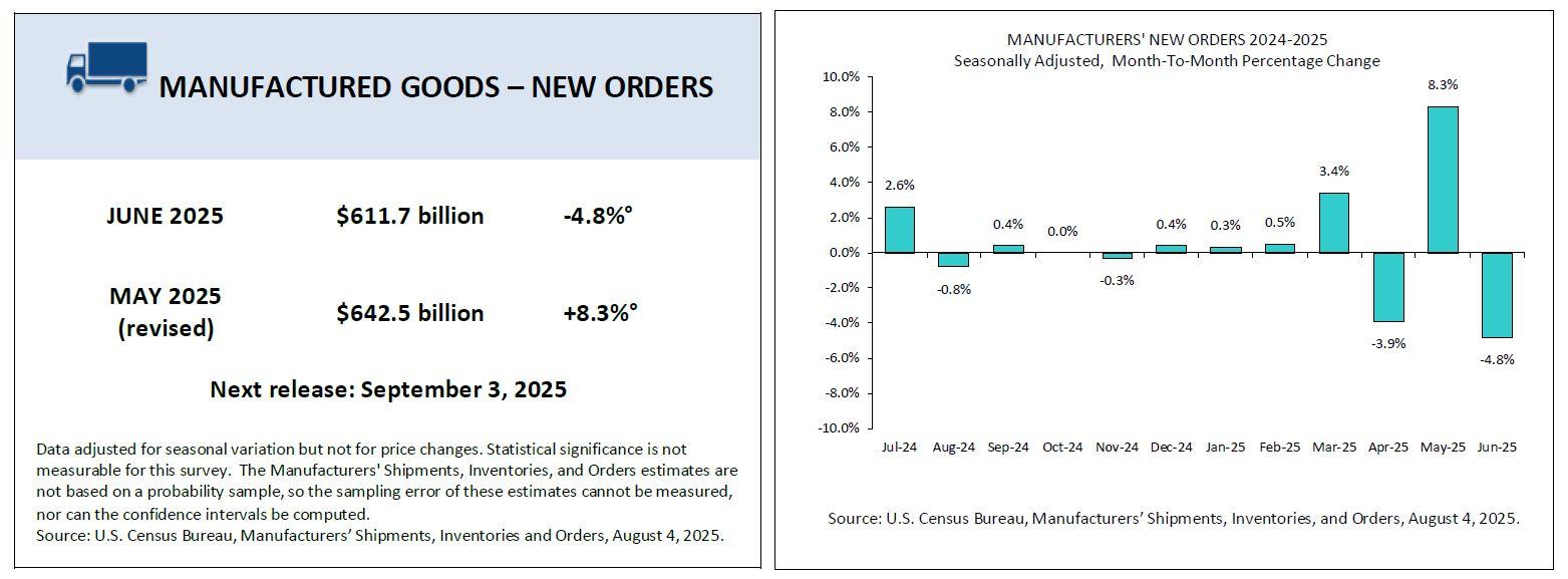 同時,美國人口普查局最新數據顯示,6 月製 業新訂單減少 309 億美元,跌幅 4.8%,降至 6,117 億美元,為近三個月中的第二次下滑,此前 5 月曾錄得 8.3% 的 強勁反彈。