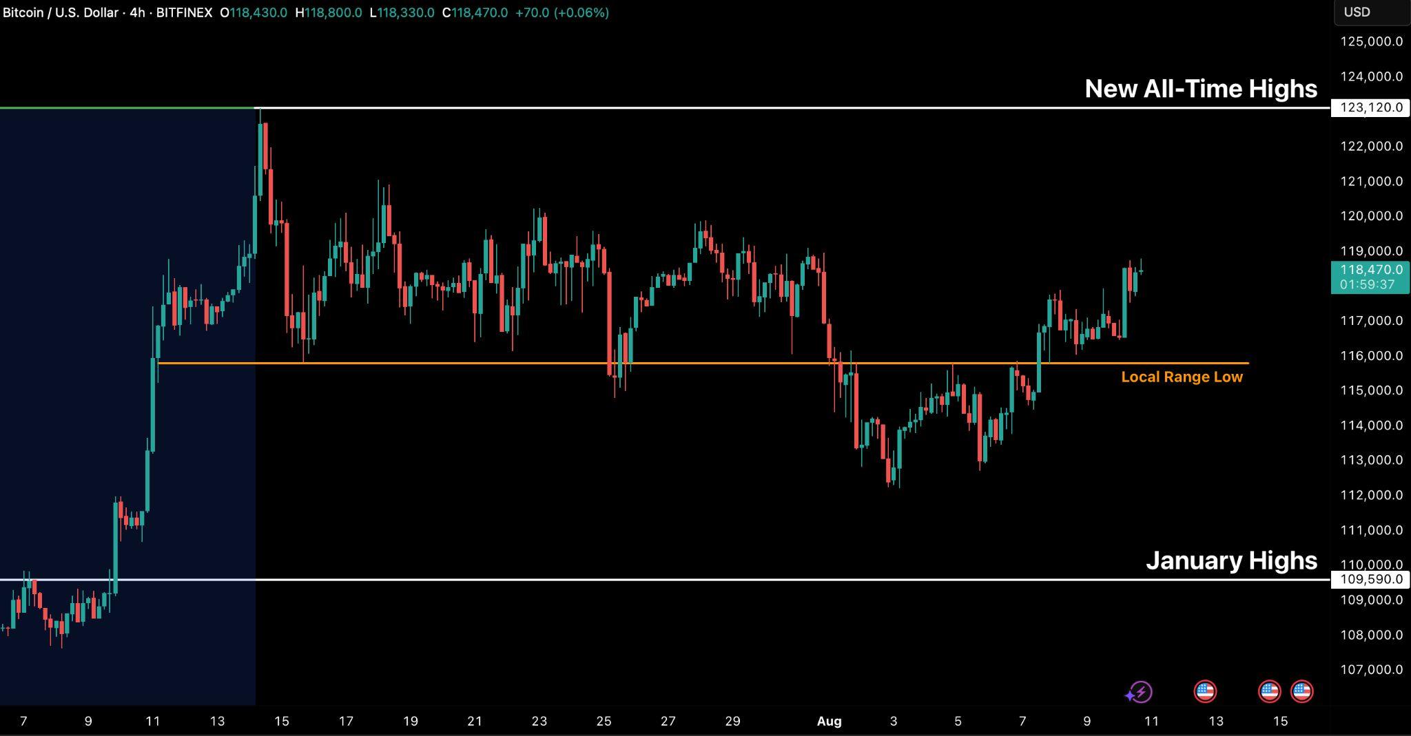 圖1.BTC/USD 四小時圖與關注價位(資料來源:Bitfinex)