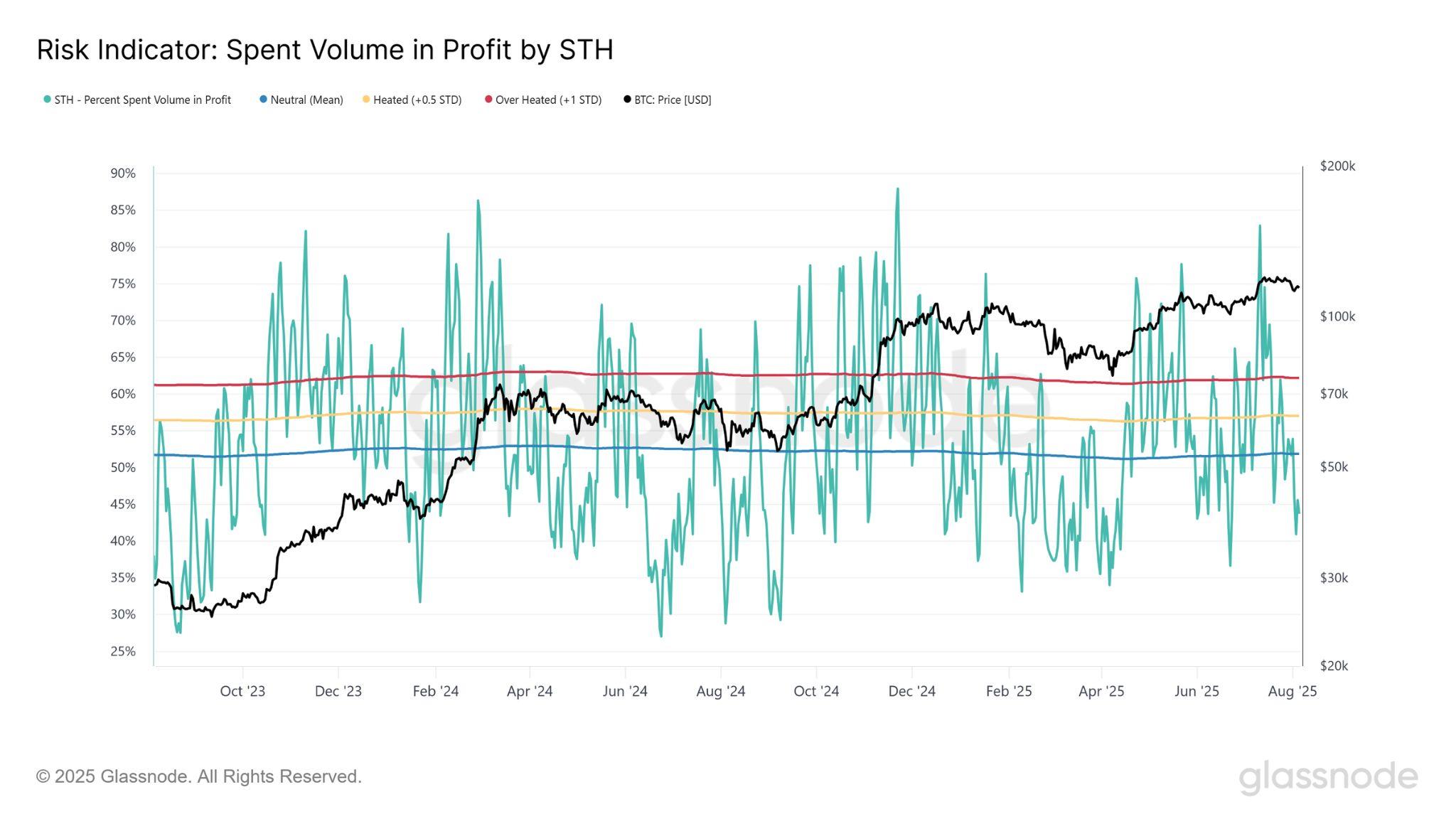 為衡量本輪回調對投資者行為模式的衝擊,我們特別檢視短期持有者(STHs)獲利支出佔 比——此一關鍵指標揭示,近期買入的籌碼中有多少正被轉化為實際收益。