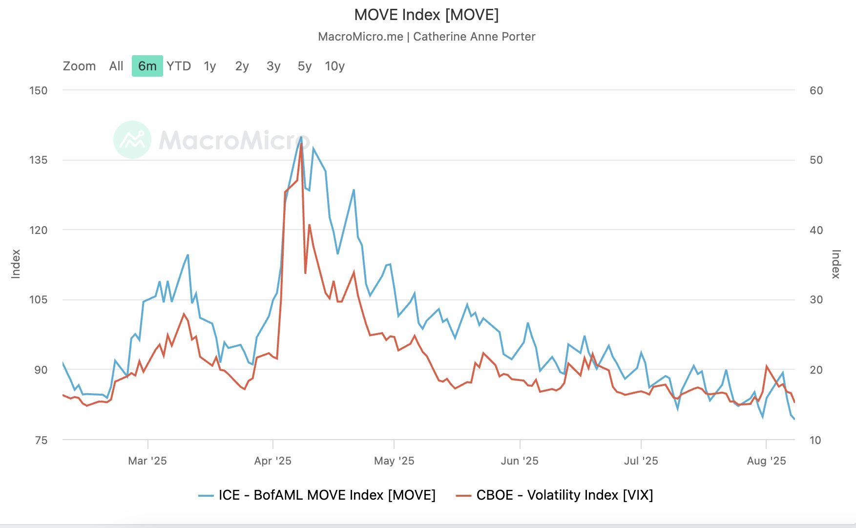 夏季期間,股市與債市波動率指標 VIX 與 MOVE 指數