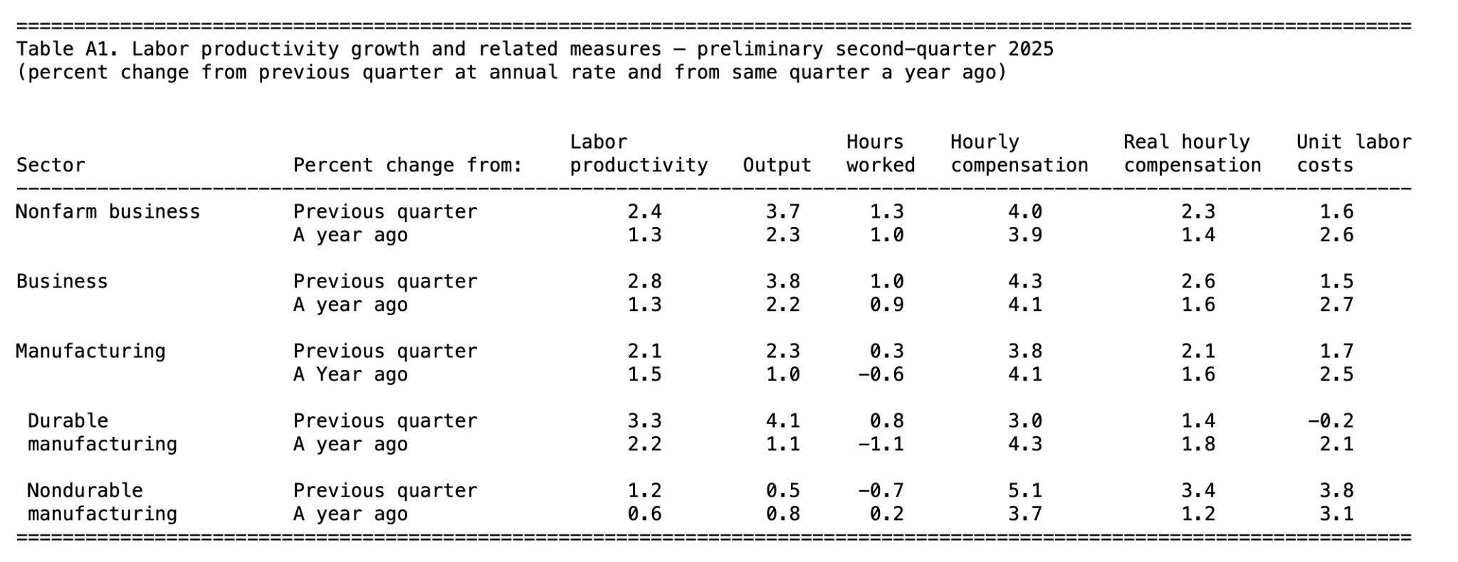 在這片陰霾中,唯一的亮點是生產力顯著改善。第二季勞動生產率成長 2.4%,高於預期 ,扭轉了年初的急跌。美國勞工統計局的《生產力與成本報告》顯示,單位勞動產出成長 3.7%,為 2023 年底以來最佳,而勞動成本增 則明顯放緩。